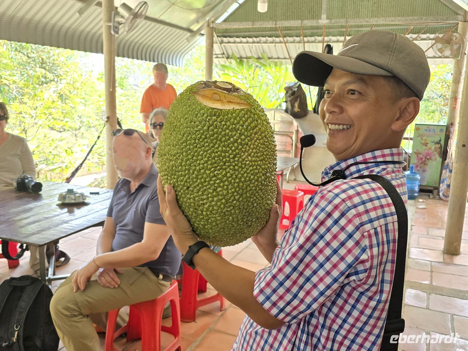 Deswegen geht es heute zurück nach Hanoi zum Flughafen. Wir fahren mit dem Bus circa 4 Stunden und machen dabei noch eine Rast beim Rosengasthof. In diesem Garten lässt es sich gut sitzen und um uns herum wachsen die Bäume mit den Jakobsfrüchten. Wir sind neugierig wie die schmecken und zufälligerweise kann man sie in dem Lokal als Kostprobe kaufen. Wir lassen eine Portion durch die Gruppe kreisen und jeder kann sich ein Bild von dem angenehmen Geschmack machen.
