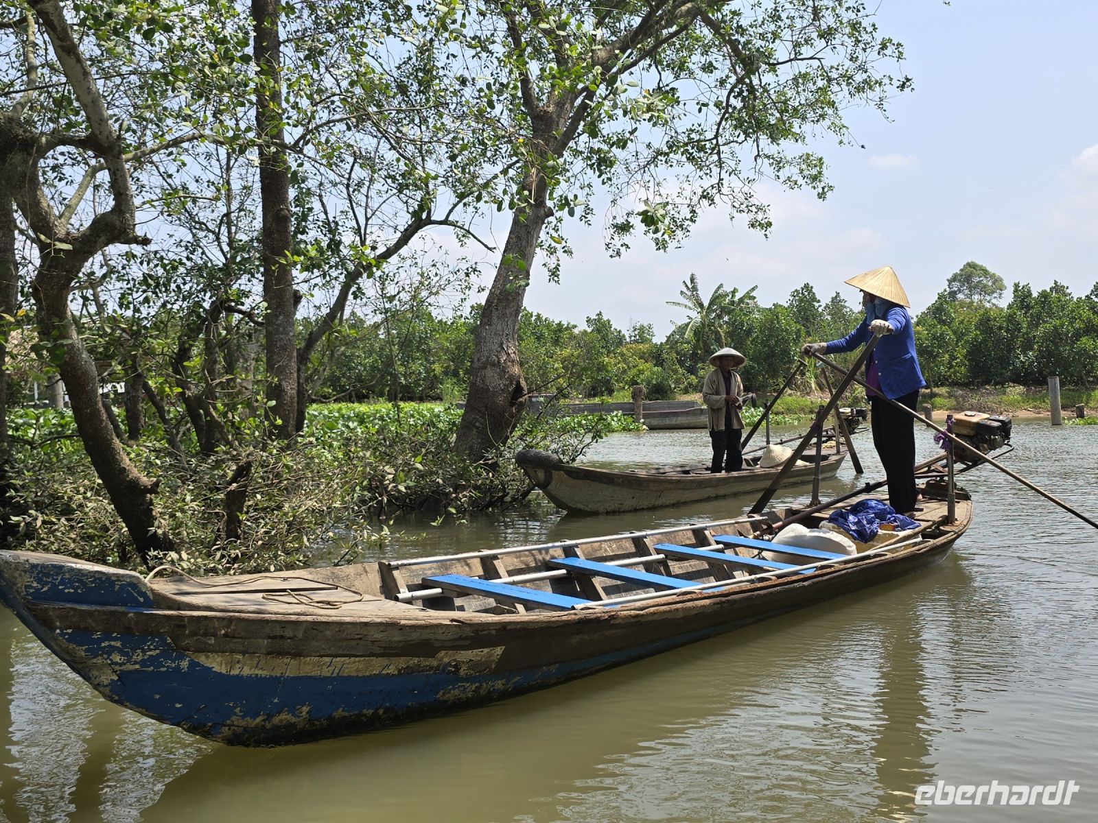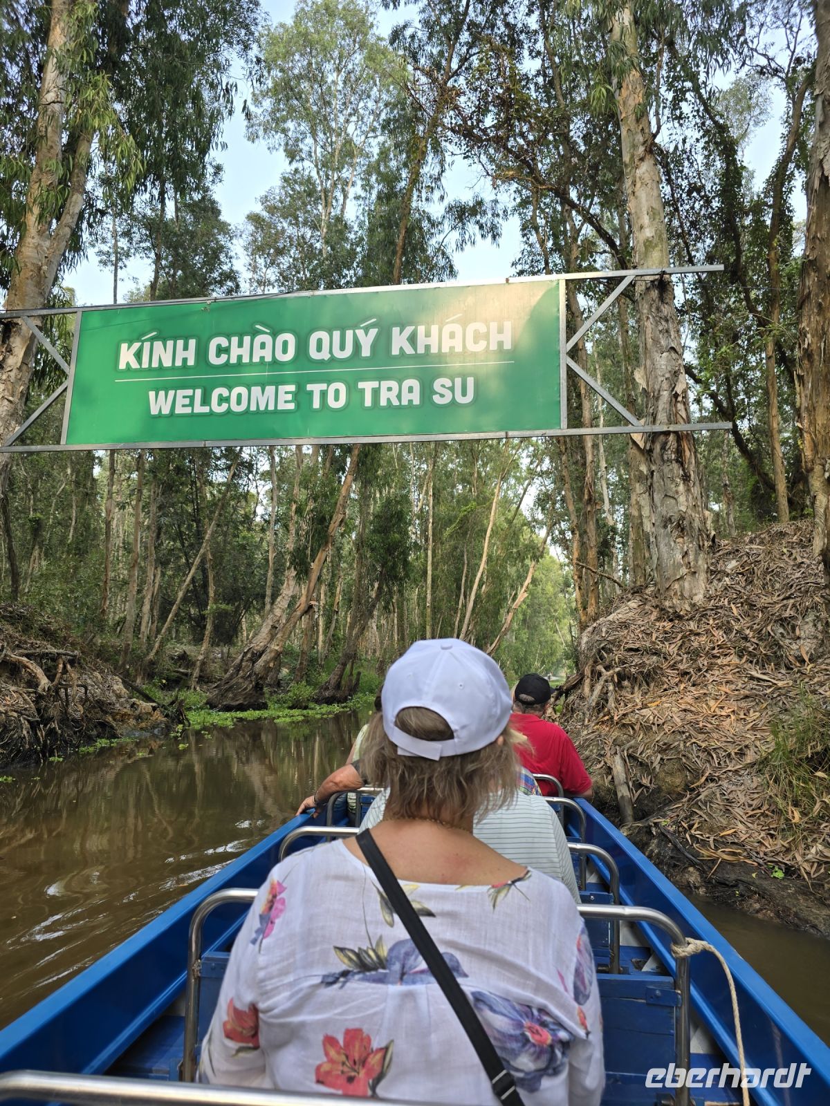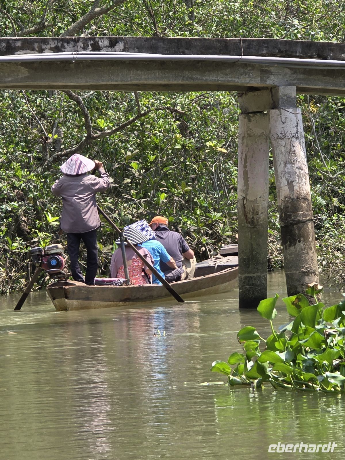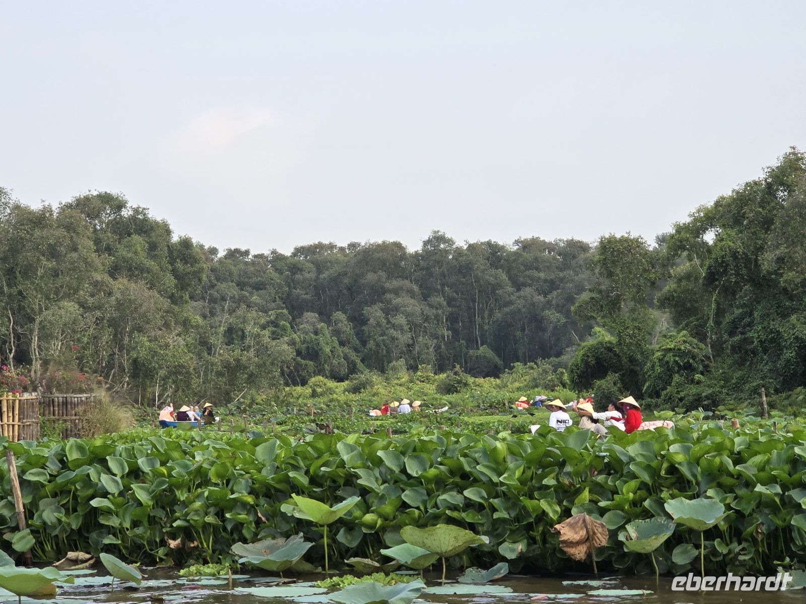 Unser Busfahrer ist zum Glück nicht müde, so kommen wir am späteren Nachmittag bei den Mangrovenwäldern an. Hier sind die Mangrovenwälder durch einen Naturpark geschützt, dem TO TRA SU. Der Park erstreckt sich über ein sehr großes Gebiet und davon dürfen 10% von der Fläche für touristische Aktivitäten genutzt werden. Wir besteigen erst kleine Ruderboote und gelangen damit in die bewachsenen Wasserflächen mit sehr viel Lotusblüten und anderen Wasserpflanzen. Und immer wieder entdecken wir Vögel, die sich in den Pflanzen verstecken. Mit viel Ehrgeiz versuchen unsere Ruderrinnen uns immer wieder neue Vögel zu zeigen. Nach dieser ersten kleinen Runde wechseln wir die Boote, sogenannte Longtales mit einem langem Stabmotor, mit dem die Männer sehr geschickt die Boote in die kleinen Kanäle steuern, sehr kleine Wendemanöver durchführen, und sie zeigen uns bei dieser Fahrt die Außenbereiche der Mangroven. Am aller schönsten für uns ist zu beobachten. dass die Natur hier in harmonischem Einklang mit sich selbst existieren kann. Eingriffe durch den Menschen werden hier vermieden und es wird sich auch darum gekümmert, dass kein Müll von benachbarten Grundstücken eingetragen wird. Dieser Park ist eine wunderschöne heile Welt hier hat es uns sehr gut gefallen.