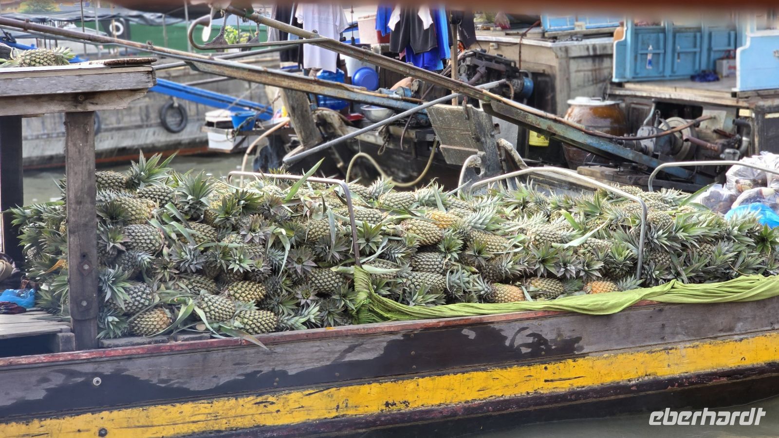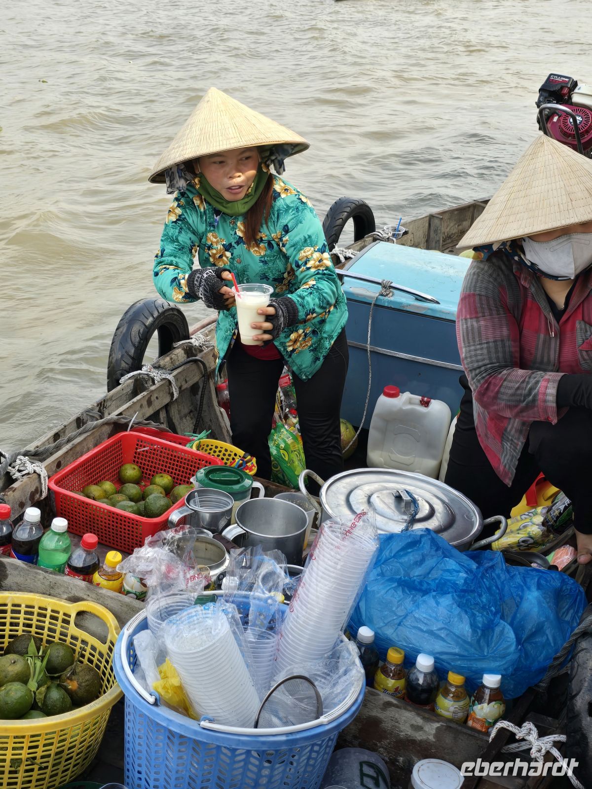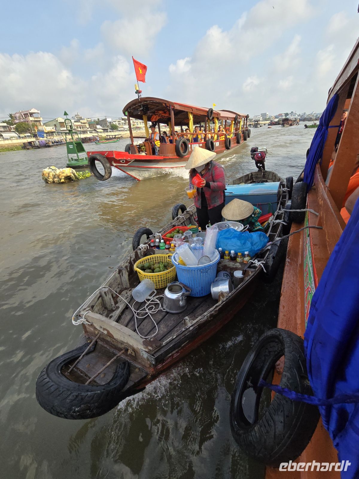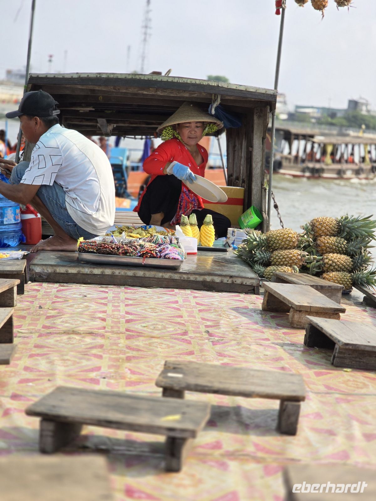 Unsere Tage beginnen immer früher und unsere Aktivitäten werden immer spannender, heute brechen wir mit dem Bus schon um 07:30 Uhr auf. Grund für den frühen Start ist der Besuch der schwimmenden Märkte, auf dem Wasser des unteren Mekong, findet jeden Morgen ein Markt für Gemüse und Obst statt. Deshalb wollen wir früh genug da sein um das Treiben der Händler und Kunden beobachten zu können. Wir haben uns ein Boot gemietet mit dem wir zum Markt fahren können, erst schauen wir das Treiben etwas mit Distanz an, fahren einmal hoch und einmal runter und dann legen wir bei einem Boot mit Ananas an. Jetzt kommt der Händler rüber auf unser Boot, zeigt uns seine Ware, führt uns vor wie man Ananas schellt, und danach gehen wir alle rüber auf sein Boot und werden dort mit Kostproben bedient. Wir legen wieder ab und fahren noch ein Stück, dann kommen 2 Frauen mit ihrem Langboot an unsere Seite, machen ihr Boot fest und bieten Getränke an. Kokosnuss oder Apfelsinensaft oder sonstige frisch gepressten Säfte sind in ihrem Angebot. Zum Abschluss unserer Markttour, legen wir mit unserem Boot an der lokalen Markthalle an. Spazieren mal wieder durch die Halle und schauen uns die Waren an. Hier gibt es alles was es auf den schwimmenden Märkten nicht gibt, Fisch, Fleisch, vor verarbeitete Gemüsesorten und Meeresfrüchte. Die schwimmenden Märkt bieten nur Obst und Gemüse in unverarbeitetem Zustand.