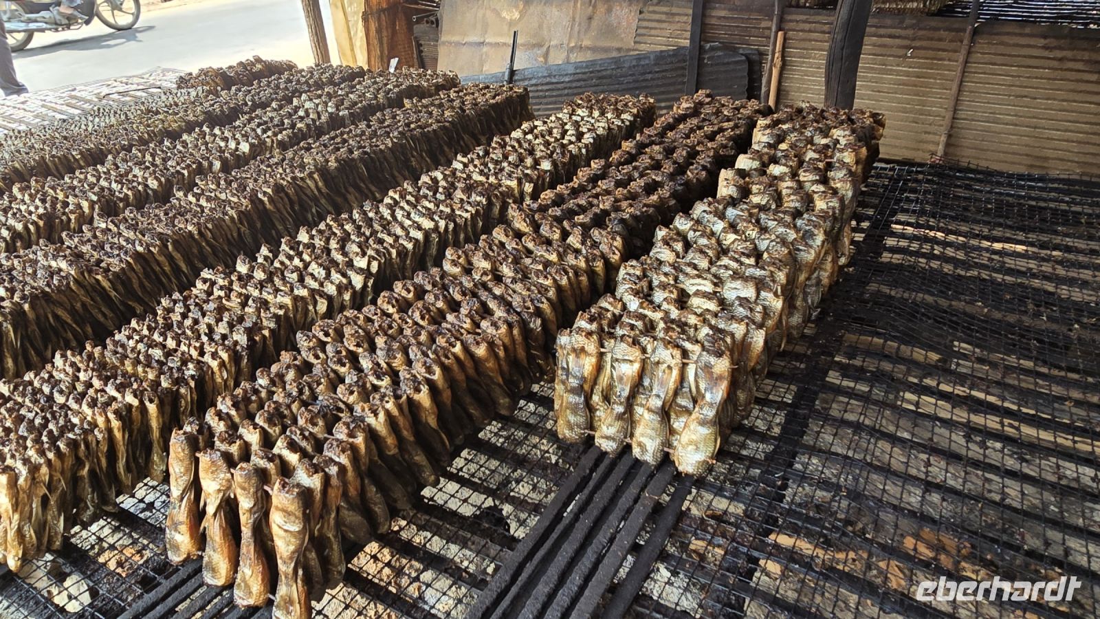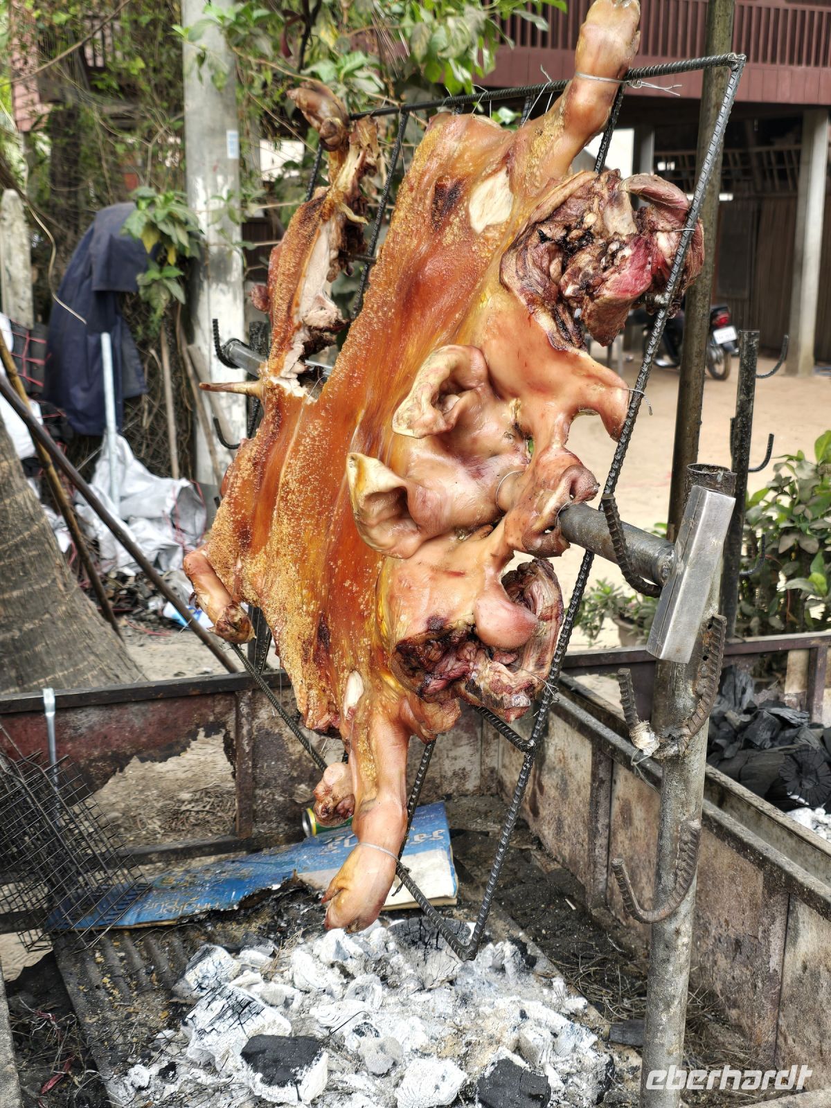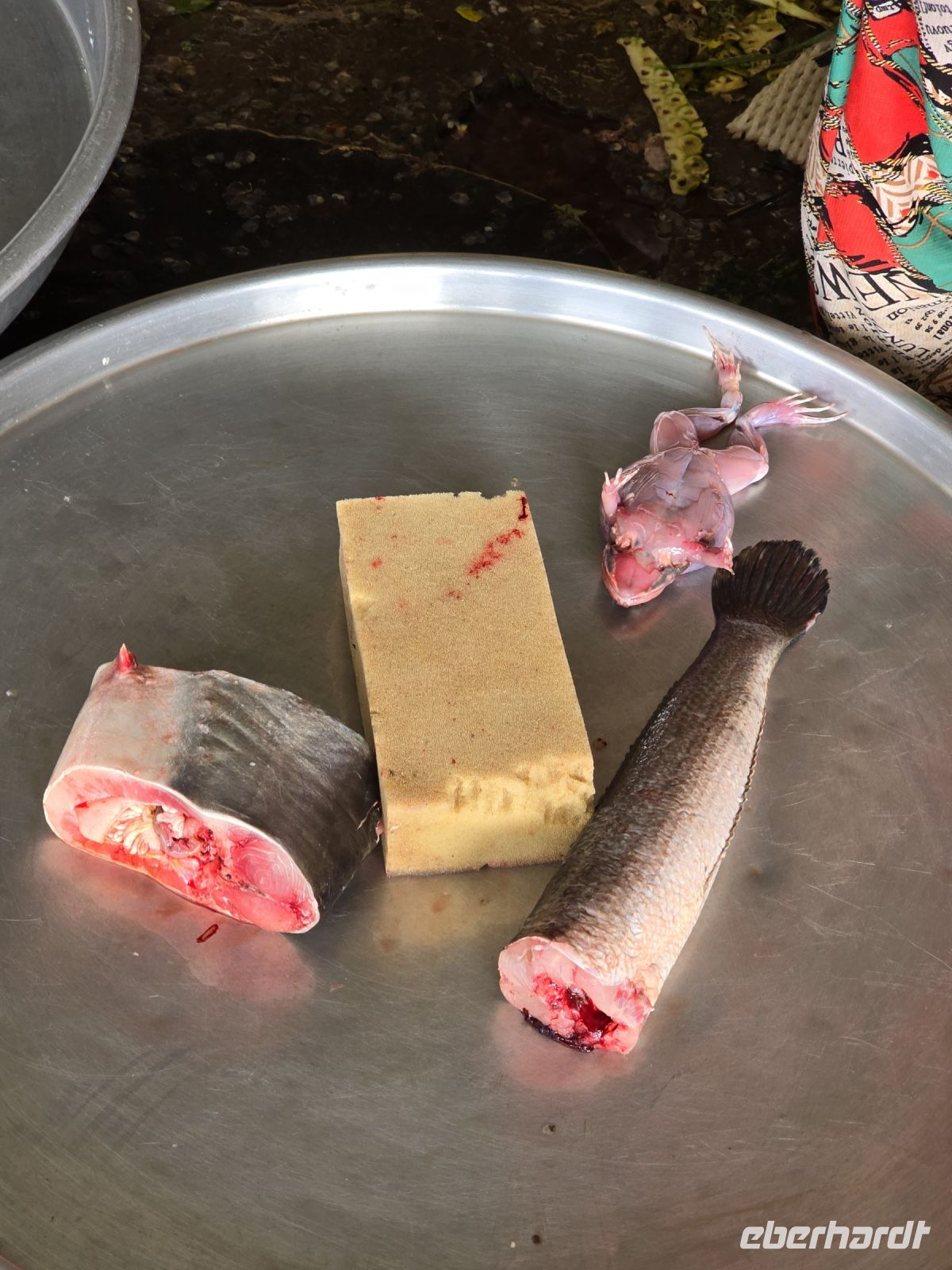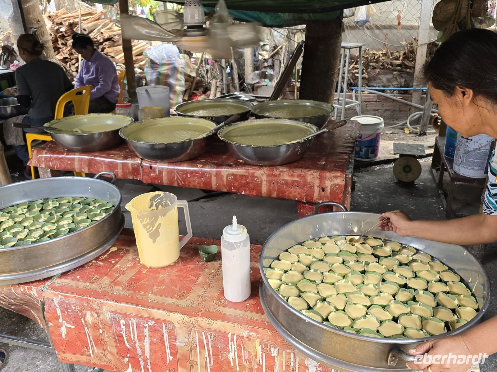 Als nächstes besuchen wir ein Bauerndorf dass ich für alle Besucher einen Namen gemacht hat. Nicht nur Touristen sondern auch sehr viele Besucher aus der näheren Umgebung kommen heute am Sonntag in das Dorf. Entlang der Durchfahrtsstraße werden links und rechts Gerichte angeboten, die man nicht jeden Tag findet. Berühmt ist der Ort zum Beispiel für seinen Fischkäse, ein Käse der mit klein gestampftem Fisch und Gewürzen gemischt wird und zur Reifung einige Tage stehen muss. Der Geruch wird dabei sehr intensiv, nicht jeder muss den haben. Wir halten uns zurück und verzichten auf eine Kostprobe. Aber für die frischgebackenen Kokoskuchenteile sind wir schon sehr offen. In aus Bananenblätter geformte Körbchen, wird dicke Kokusmilch und Reisteig eingefüllt und anschließend das Ganze im Wasserdampf gegart. Dadurch entstehen kleine Runde Küchlein die in der Mitte gefüllt sind mit flüssiger Kokospaste und einen sehr leckeren Geschmack haben. Diese kleinen Küchlein werden zu hunderten vorbereitet und bereitgestellt, wenn die Tagesgäste kommen. Viele Gäste bringen wohl einen großen Hunger mit, deswegen werden großflächige Grillroste mit ganzen Schweinen bestückt, die ausgenommen sind und flach abgerollt werden. damit wird circa ein halber Quadratmeter Schwein auf den Grill gespannt und bis zur Mittagszeit gebraten. Unser Guide Vannak ist hier auf dem Markt sehr bekannt. Er darf überall Kostprobe nehmen sie uns zeigen und für uns werden extra Portionen von Kostproben bereitgestellt. Wir freuen uns darüber, dass wir so einfach auf dem Markt bedient werden. Wir waren zwar schon auf vielen Märkten in den letzten 3 Wochen unsere Reise, aber dieser Straßenmarkt, in dem kleinen Bauerndorf ist was Besonderes.