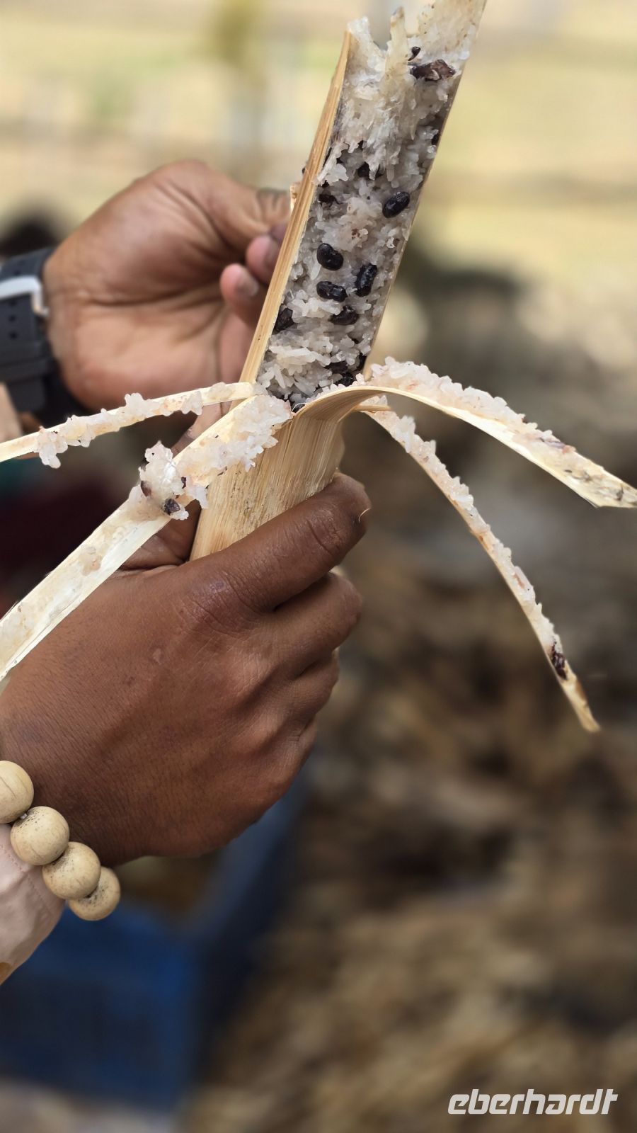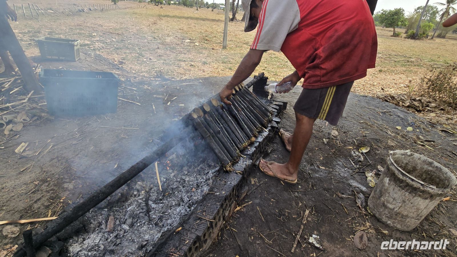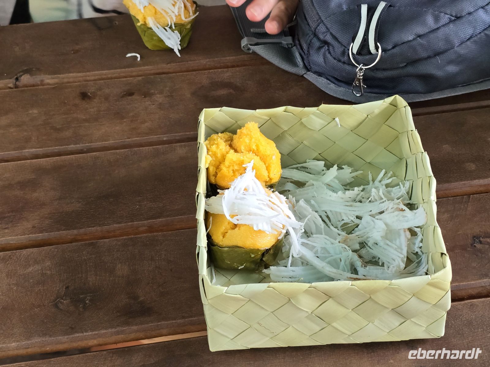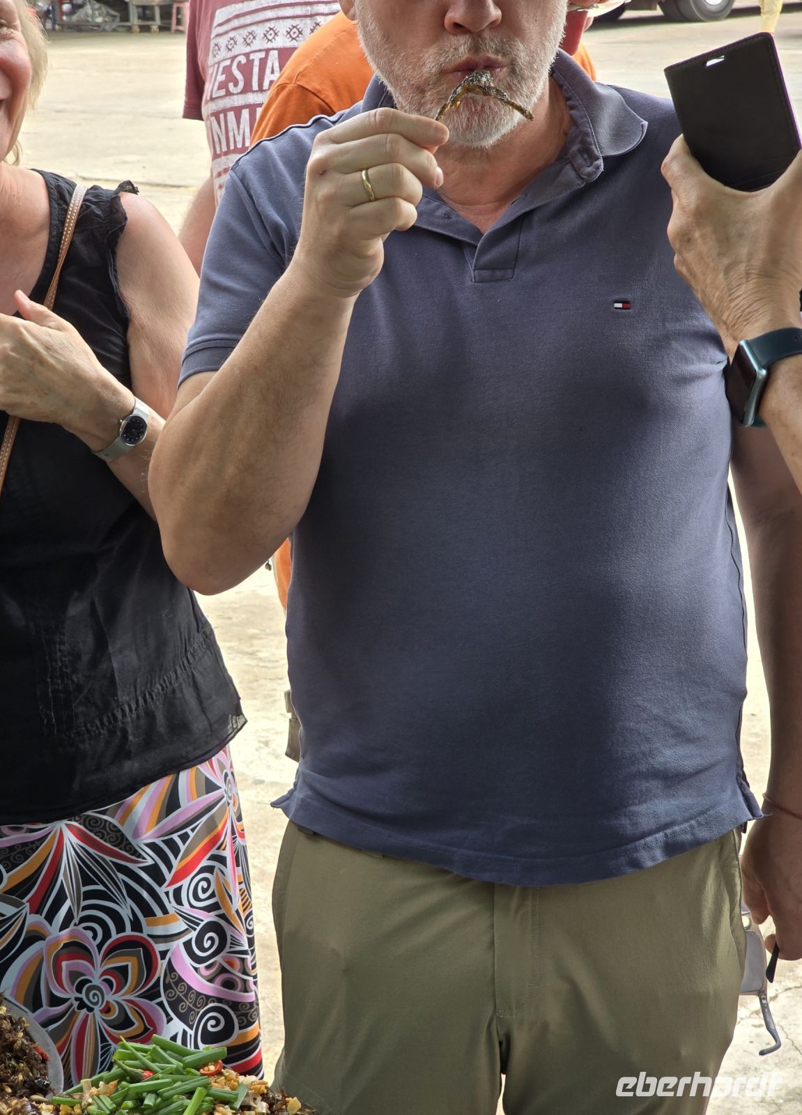 Als nächstes besuchen wir ein Bauerndorf dass ich für alle Besucher einen Namen gemacht hat. Nicht nur Touristen sondern auch sehr viele Besucher aus der näheren Umgebung kommen heute am Sonntag in das Dorf. Entlang der Durchfahrtsstraße werden links und rechts Gerichte angeboten, die man nicht jeden Tag findet. Berühmt ist der Ort zum Beispiel für seinen Fischkäse, ein Käse der mit klein gestampftem Fisch und Gewürzen gemischt wird und zur Reifung einige Tage stehen muss. Der Geruch wird dabei sehr intensiv, nicht jeder muss den haben. Wir halten uns zurück und verzichten auf eine Kostprobe. Aber für die frischgebackenen Kokoskuchenteile sind wir schon sehr offen. In aus Bananenblätter geformte Körbchen, wird dicke Kokusmilch und Reisteig eingefüllt und anschließend das Ganze im Wasserdampf gegart. Dadurch entstehen kleine Runde Küchlein die in der Mitte gefüllt sind mit flüssiger Kokospaste und einen sehr leckeren Geschmack haben. Diese kleinen Küchlein werden zu hunderten vorbereitet und bereitgestellt, wenn die Tagesgäste kommen. Viele Gäste bringen wohl einen großen Hunger mit, deswegen werden großflächige Grillroste mit ganzen Schweinen bestückt, die ausgenommen sind und flach abgerollt werden. damit wird circa ein halber Quadratmeter Schwein auf den Grill gespannt und bis zur Mittagszeit gebraten. Unser Guide Vannak ist hier auf dem Markt sehr bekannt. Er darf überall Kostprobe nehmen sie uns zeigen und für uns werden extra Portionen von Kostproben bereitgestellt. Wir freuen uns darüber, dass wir so einfach auf dem Markt bedient werden. Wir waren zwar schon auf vielen Märkten in den letzten 3 Wochen unsere Reise, aber dieser Straßenmarkt, in dem kleinen Bauerndorf ist was Besonderes.