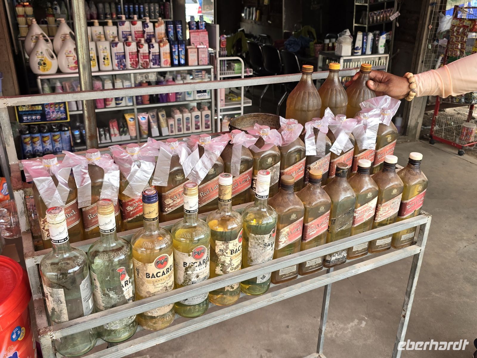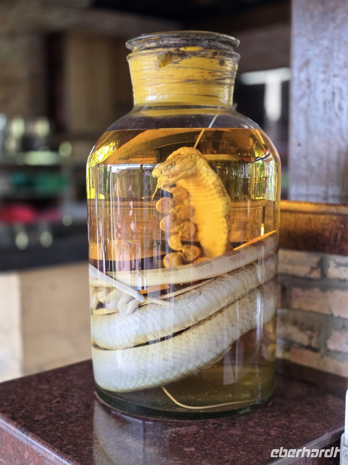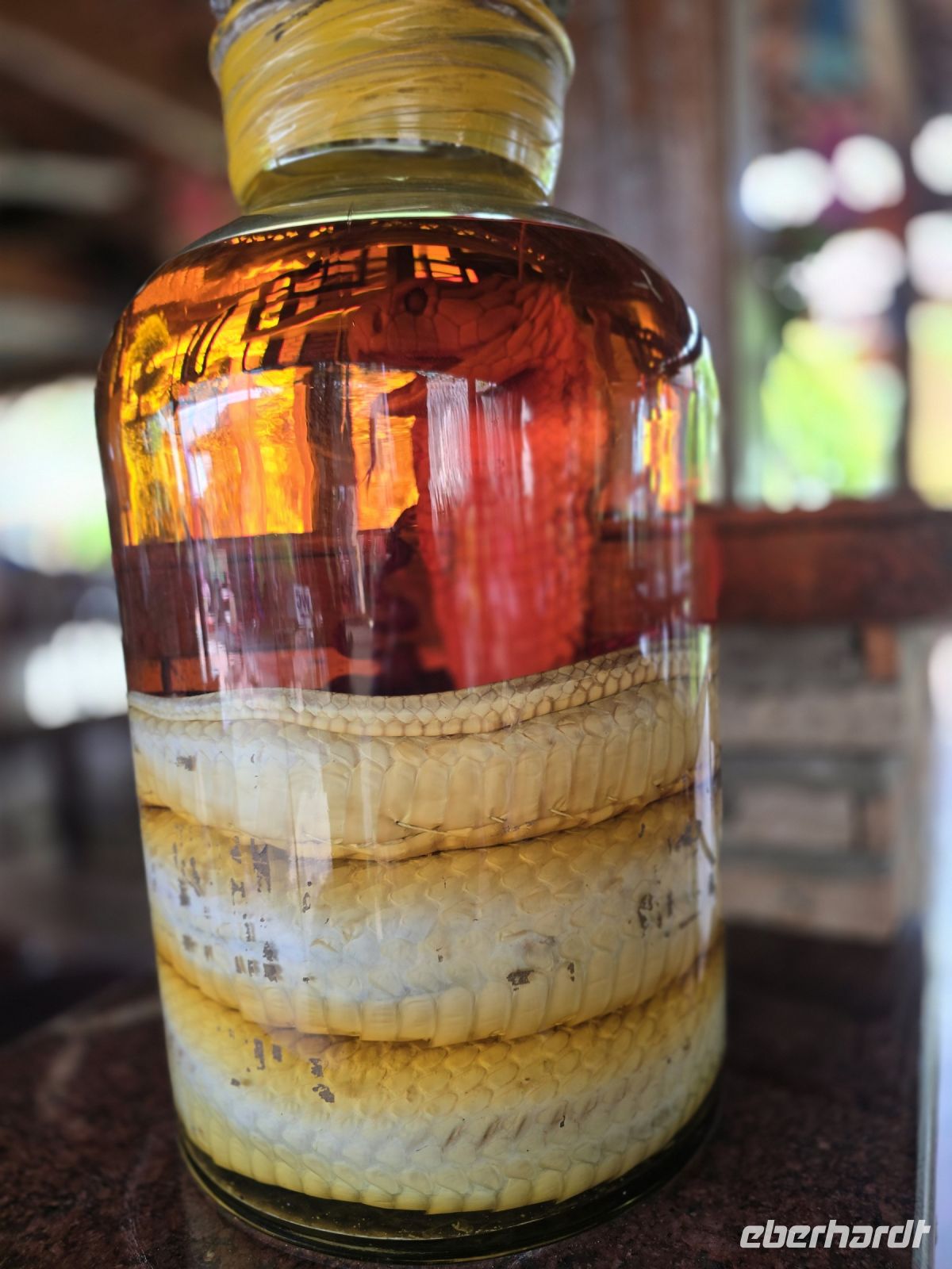 Die nächste Produktionsstätte ist wieder etwas kurioser, nämlich hier wird Schlangenschnaps hergestellt. Schlangen, unterschiedlicher Größe, werden getötet und in einem Glaszylinder eingelegt, mit Reisschnaps aufgefüllt und für mehrere Monate ruhig gestellt. Erst dann wird der Schnaps abgefüllt in kleine Flaschen und zum Verkauf angeboten. Angeblich ist diese Mischung gut bei allerhand Wehwehchen. Einige von uns wollten es wissen und Namen eine kleine Kostprobe von dem Elixier. Mal sehen was die nächsten Tage mit ihnen passiert.