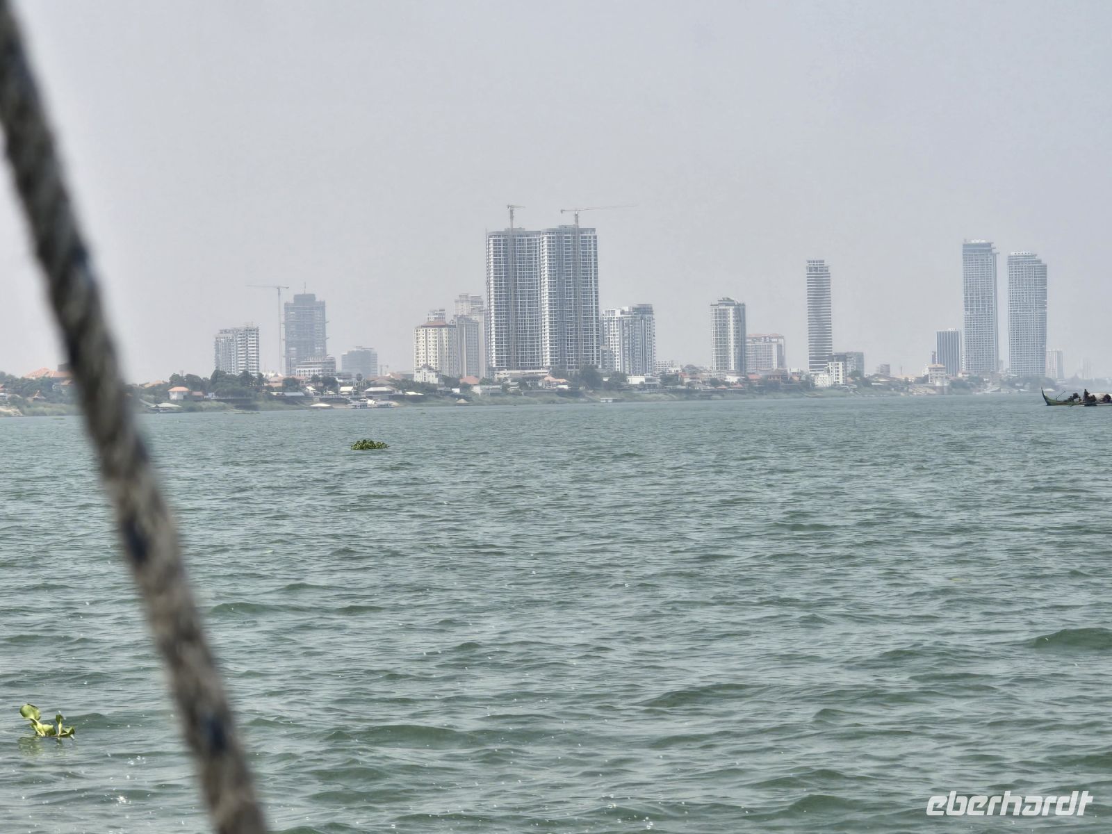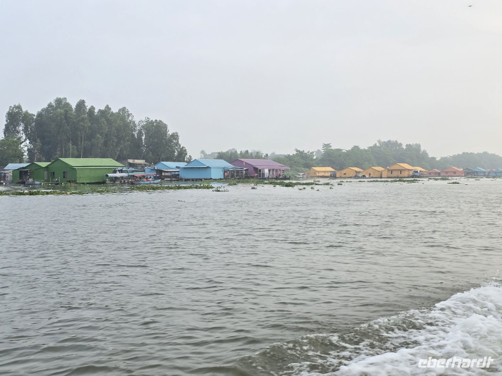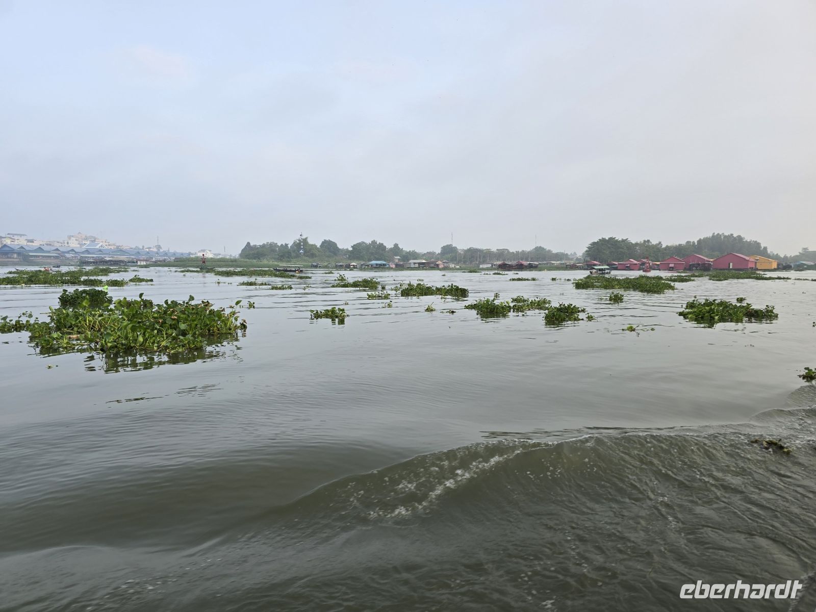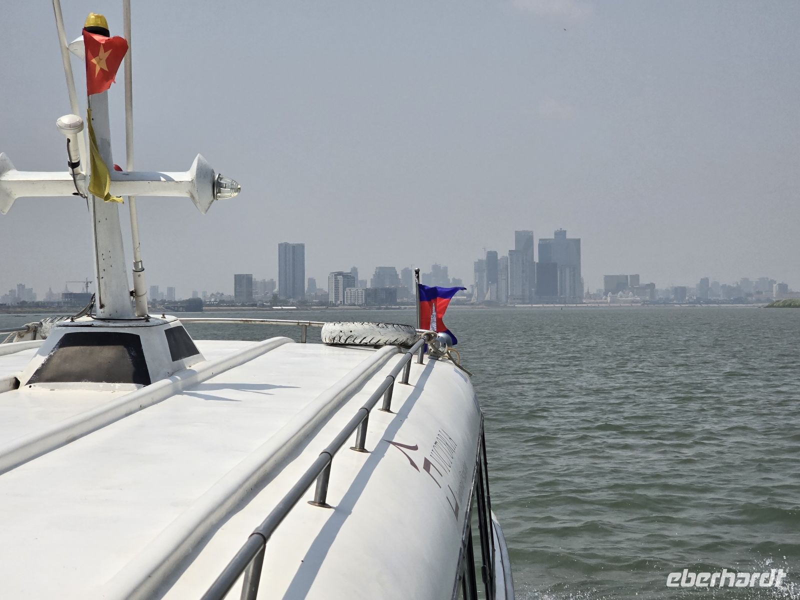 Ja, heute Morgen geht es wieder bald los. Von Chau Doc starten wir schon um 06:45 Uhr. Es steht der Bus bereit und wir fahren die kurze Strecke zur Anlegestelle des Schnellboots. Heute verlassen wir Vietnam und gehen über die Grenze nach Kambodscha. Die Fahrt machen wir auf dem Mekong, mit einem Schnellboot fahren wir bis in die Hauptstadt nach Phnom Penh. Von Chau Doc bist so Grenze fahren wir circa eine Stunde, erst fahren wir auf dem "unteren Mekong" und vor der Grenze wechseln wir auf den großen Mekong. Der Mekong ist eine richtige Lebensader, mit seinen über 4500 Kilometern fließt er durch 6 Länder Südostasiens und ist einer der 12 längsten Flüsse der Welt. Im Mekong Delta leben ganze Städte von dem Fluss, gleich am Beginn unserer Schiffsreise sehen wir viele Pegasus Farmen, hier leben Familien auf schwimmenden Häusern und um die Häuser herum befinden sich ihre Fischfarmen. Der Mekong mit seiner Breite von über einem Kilometer an manchen Stellen liefert fruchtbaren Boden und Wasser, so dass die Landwirtschaft gut gedeiht. Oft sehen wir am Ufer wie Bauern ihre Wasserbüffel in den Fluss führen, die sich dabei sehr wohl fühlen. An der Grenze von Vietnam müssen wir alle das Boot verlassen und versammeln uns in der kleinen Empfangshalle. Hier herrscht Trubel und reges Treiben, gleich links am Eingang werden Geldscheine getauscht, freifliegend balanciert eine Dame mit mehreren Währungen und wechselt in die kambodschanische Währung, den Riel. Es geht ihr sehr flink von der Hand und so richtig nachprüfen mit den ungewohnten Scheinen können des die meisten nicht.