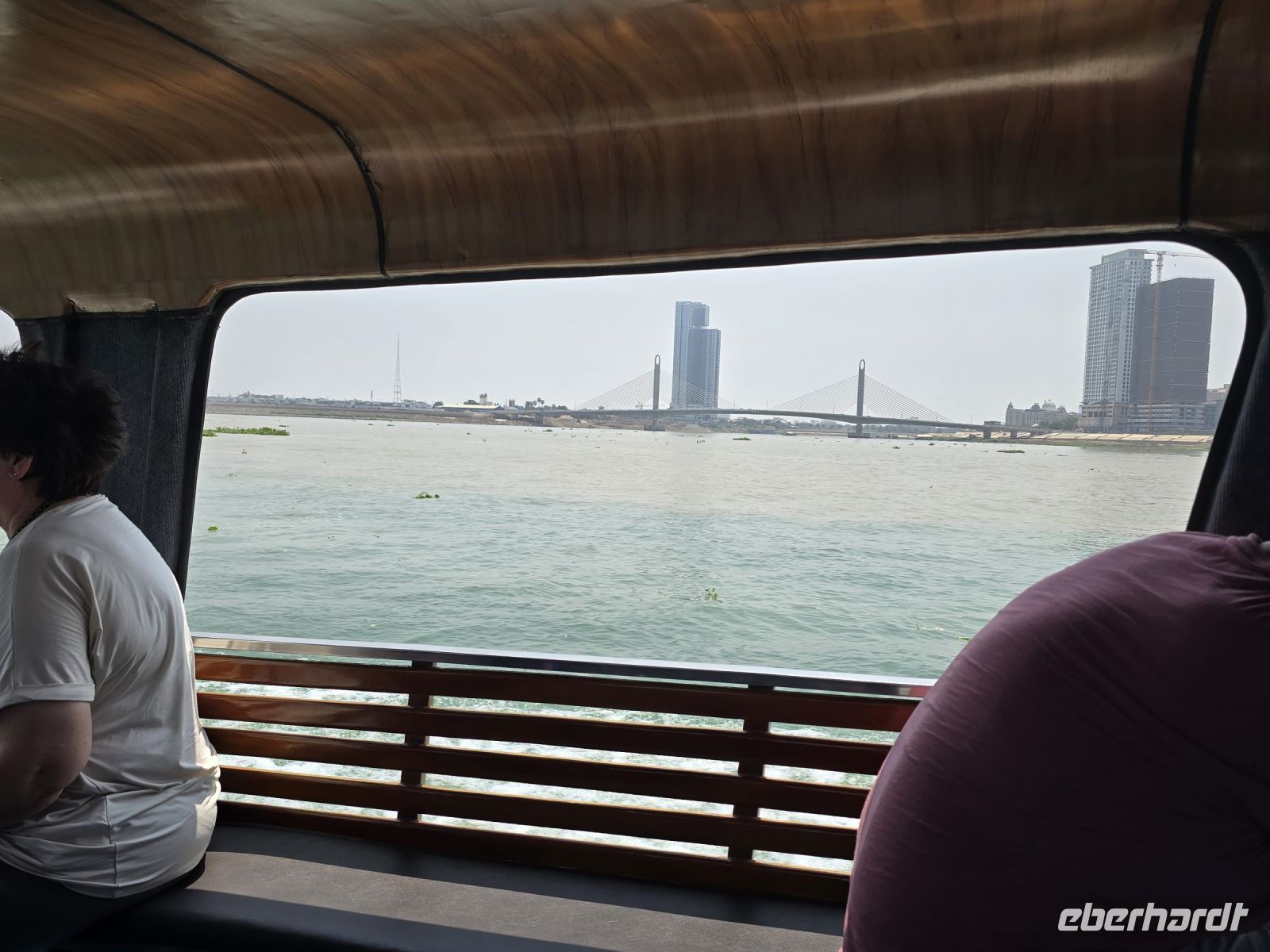 Bald geht es auch schon weiter, wir steigen wieder in das Schiff ein, fahren kurze 10 Minuten und kommen dann an der kambodschanischen Grenze an, wo wir auch wieder alle aussteigen. Hier müssen wir uns das Visa geben lassen. Wir sammeln alle Reisepässe ein, bezahlen die Visagebühr und hoffen das unser Schiffsreiseführer bald die Visa in unseren Pässen einkleben kann. Bevor die Visa gültig werden, müssen wir uns noch identifizieren, durch persönliches Erscheinen bei den Grenzbeamten und durch Abgleich der Fingerabdrücke. Hier sind wir ungefähr 45 Minuten beschäftigt bevor es mit unserer Schifffahrt weitergehen kann. Nun haben wir keinen geplanten Stopp mehr, für die nächsten 3 Stunden bis Phnom Penh fahren wir in rasantem Tempo und ohne Pause zu unserem Ziel. Während der Fahrt beobachten wir mehrmals am Ufer, wie die Bauern mit ihren Wasserbüffeln baden gehen. Die Temperaturen sind jetzt schon weit über 38 Grad, die Tiere brauchen Abkühlung und so werden sie an Handlinien in den Mekong geführt und der Bauer gleich vorne mit.