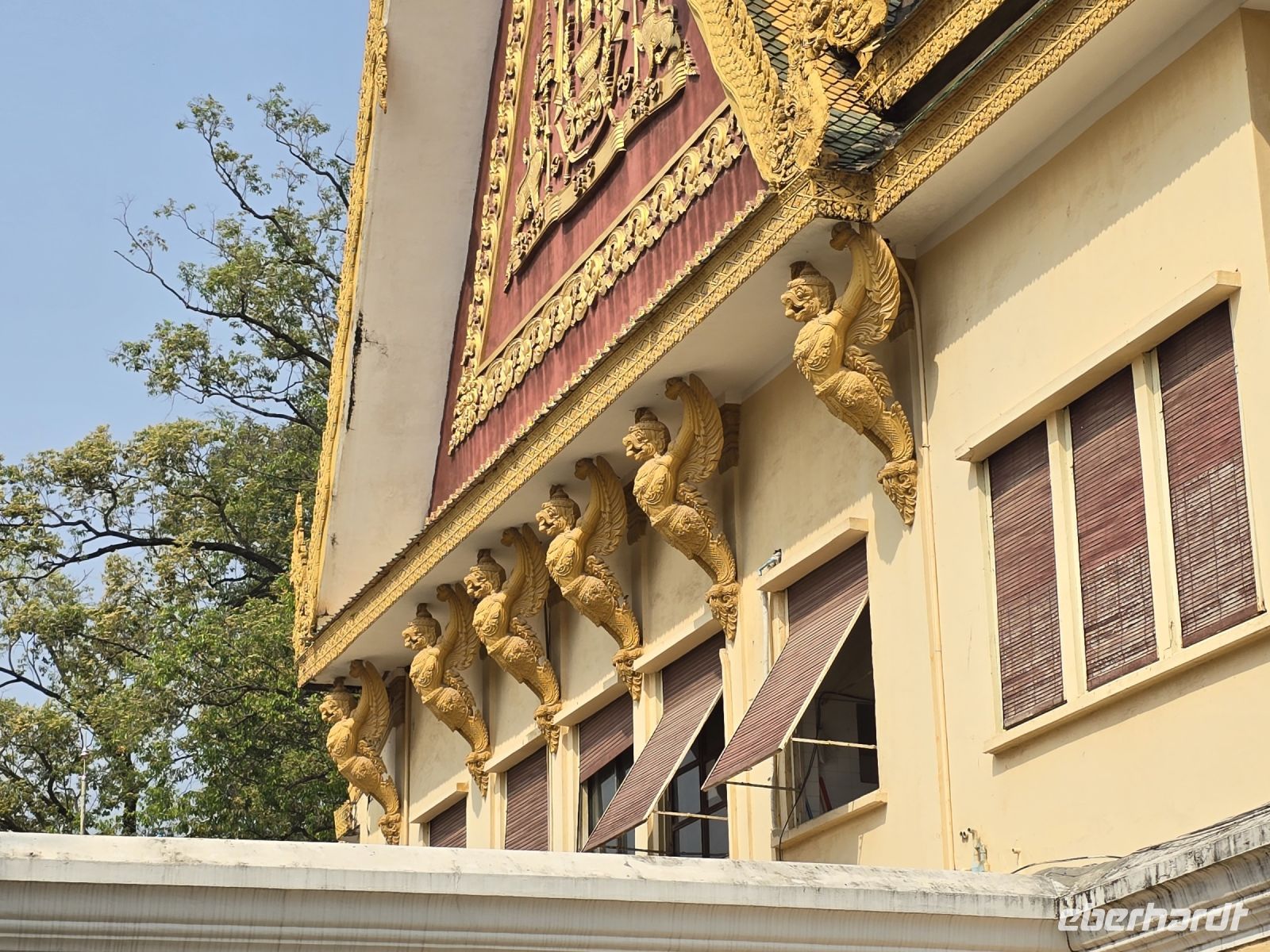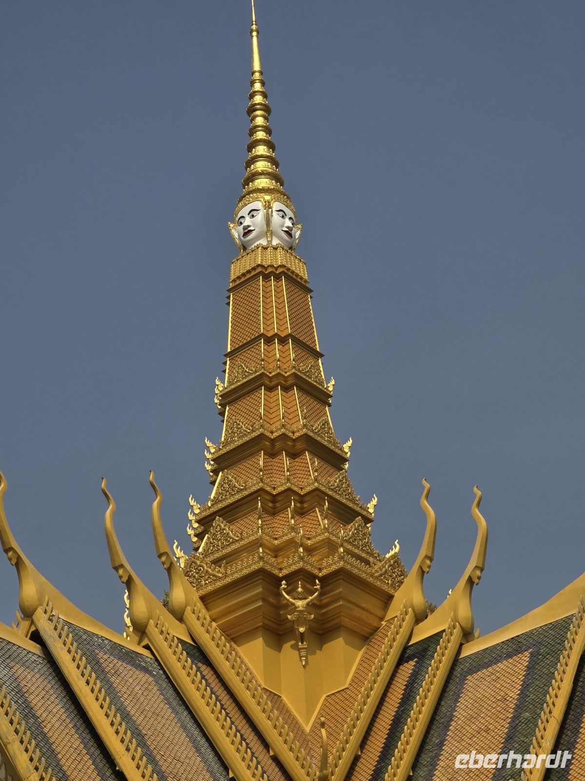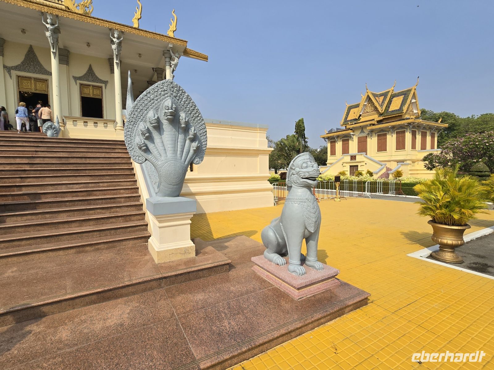 Immer wieder sehen wir das Symbol des Schlangenschildes, entweder im Rücken einer Frauenbüste oder alleinstehend am Eingang eines Palastes. Das Schlangenschild mit den 7 Schlangen symbolisiert die Bewährungszeit, die 7 Aufgaben die erfüllt werden müssen bevor man in das Nirwana gelangt, die Bewährungszeit auf der Erde ist im Buddhismus in 7 Prüfungen zusammengefasst. Die Anlage ist berauschend schön, der Königspalast beeindruckt uns alle, es ist eine wunderschöne Anlage mit freundlichen Farben und die Architektur sehr ansprechend, auch für uns Europäer, wir sind sehr angetan von diesem Besuch.