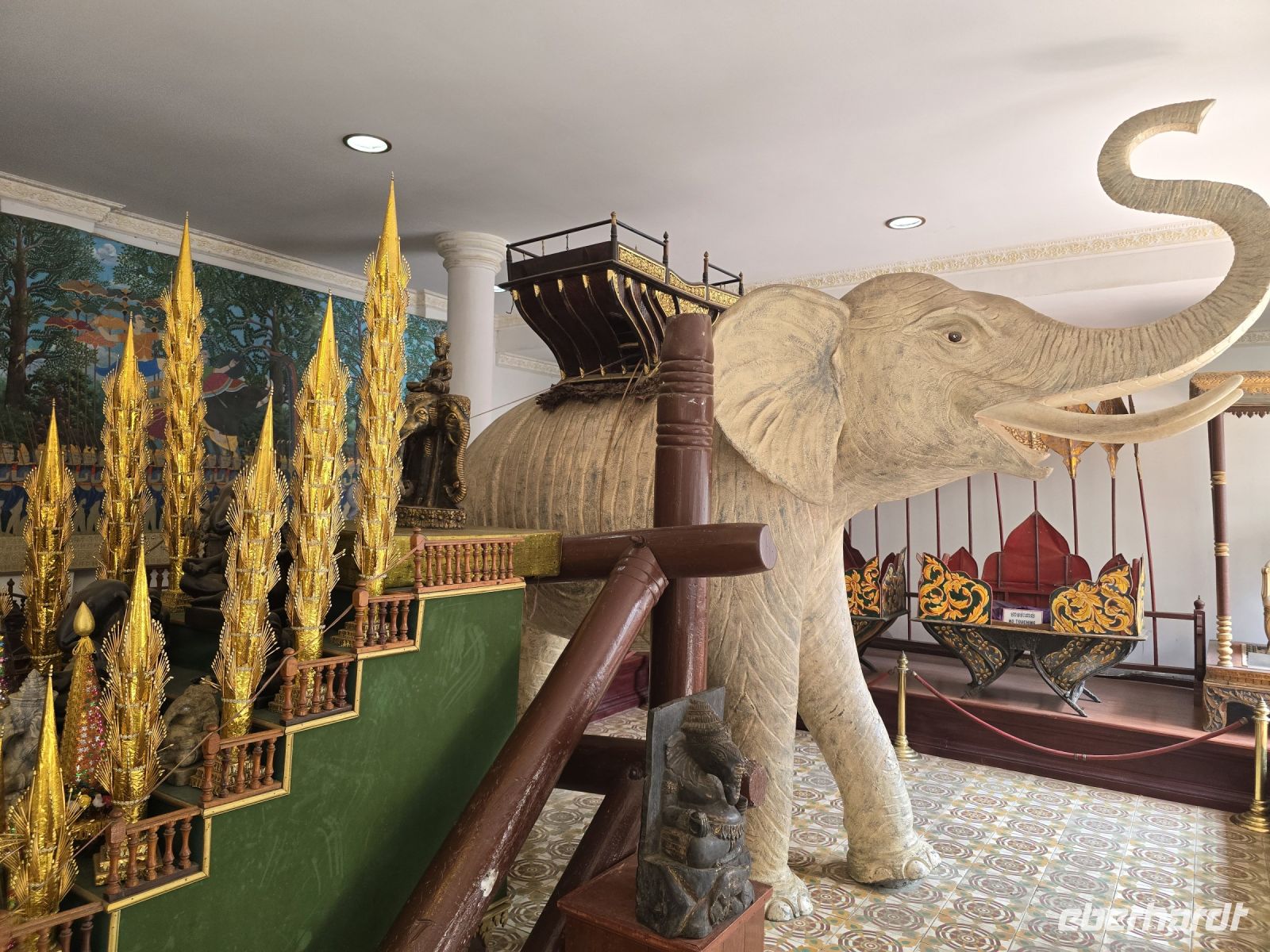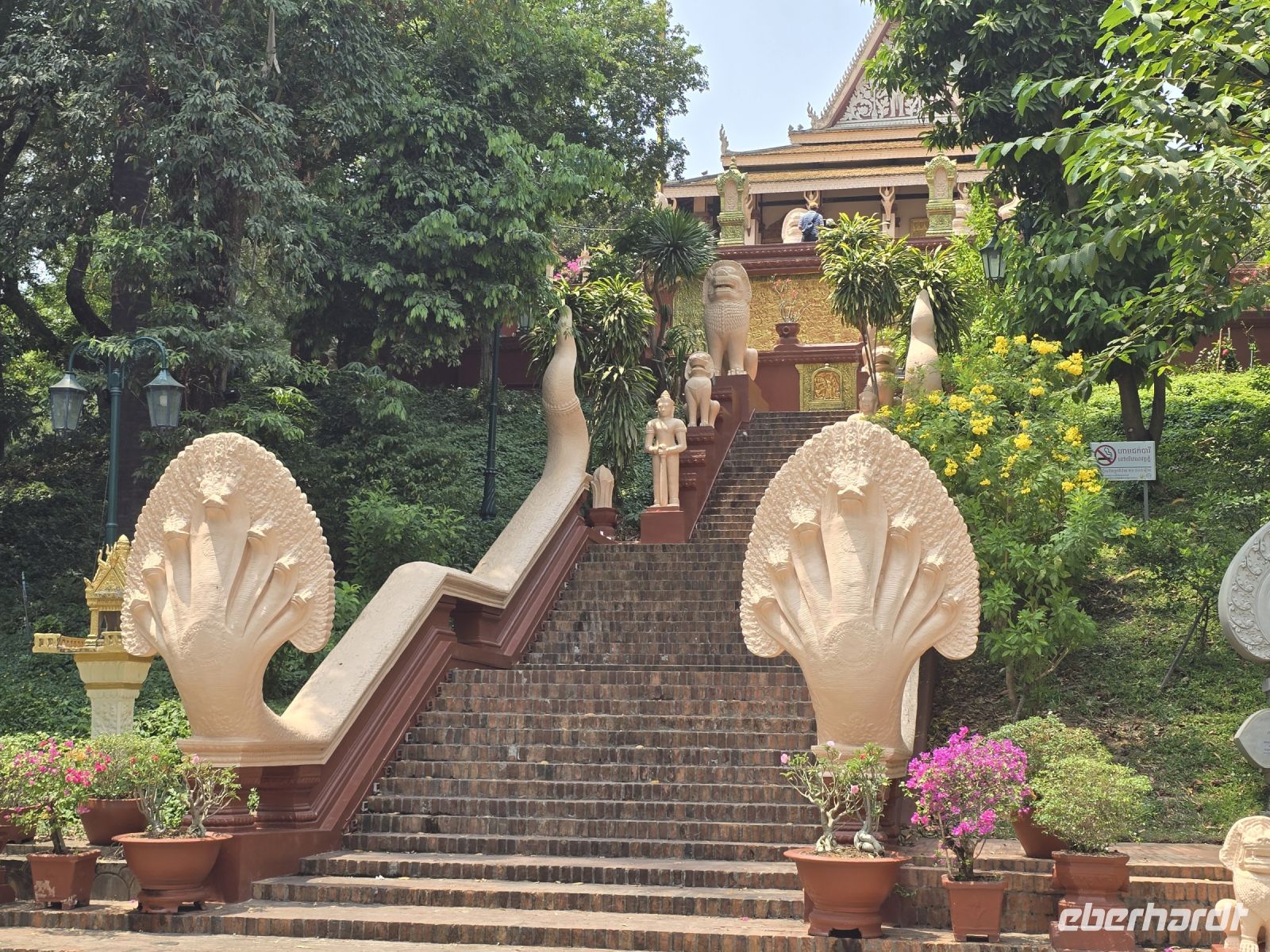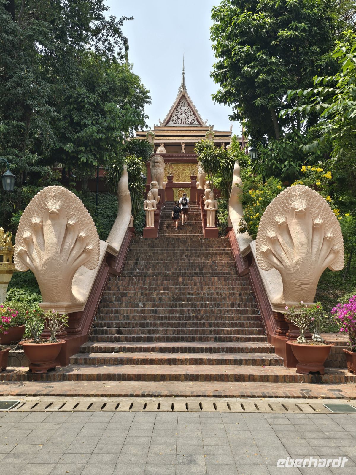 Was unser Guide Saushea, auf jeden Fall noch zeigen möchte ist der Ursprung der Stadt Phnom Penh, den Wat Penh. Hier wurde der Tempel auf dem Hügel Phnom gebaut, von einer Frau Penh. Als sich die Stadt am Fuße des Wat langsam entwickelte, wurde sie nach dem Hügel Phnom und nach der Stifterin des Wat, Penh, benannt als Phnom Penh.