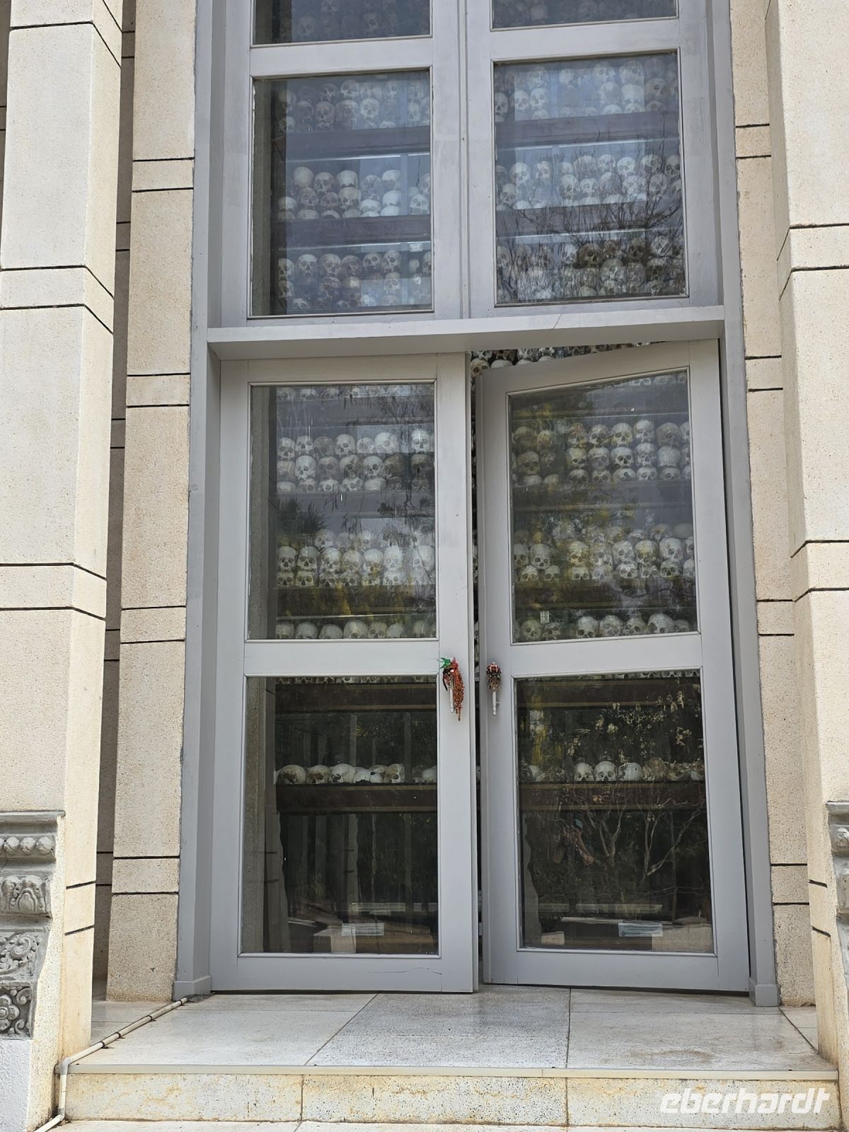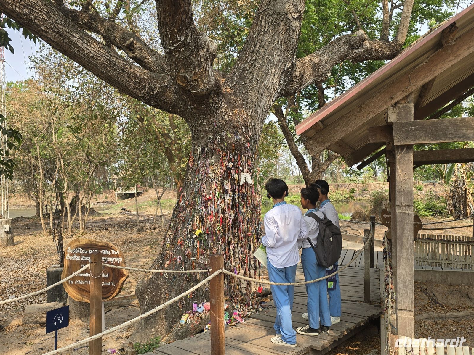 Zur Mittagszeit ist die Umgebungstemperatur wieder an der Schmerzgrenze angelangt, unsere Reisegruppe ist weitgehend erschöpft, und die meisten wünschen sich zurück ins Hotel. Nach einer kurzen Erholungszeit brechen manche auf eigen Faust, für weitere Erkundigungen in der Stadt, auf. Ein Besuch bei den Killing Fields, ca. 10km außerhalb von Phnom Penh gelegen, führt die die schrecklichen Taten der Roten Khmer in den Jahren 1972 bis 75 deutlich vor Augen. Es ist ein großer Kontrast zu den Kunstwerken, die wir am Vormittag angeschaut haben, aber es gehört auch zur Geschichte Kambodschas, vor allem ist es erst die jüngste Geschichte. Mit Schautafeln und offenen Massengräbern wird hier die Vorgehensweise des Pol Pot Regimes gezeigt, deren Absicht es war einen kommunistischen Bauerstaat zu erreichten. Alle Stadtbewohner, Intellektuelle und Menschen mit feinen Händen die offensichtlich keine Bauernarbeit verrichteten, wurden in der Nacht überfallartig in Lastwagen verladen und auf diese Internierungslager gebracht, und sogleich bestialisch ermordet. Auf diese Weise wurde ein Viertel der Bevölkerung Kambodschas in nur 5 Jahren ausgelöscht. Diese schreckliche Zeit wurde durch den Einmarsch vietnamesischer Truppen beendet.