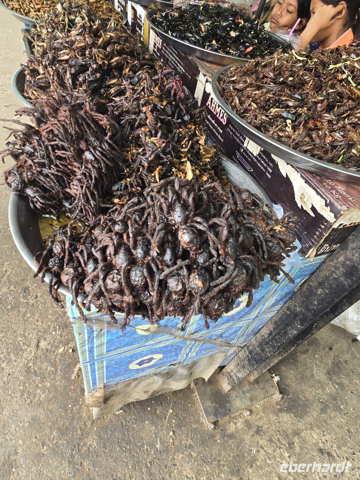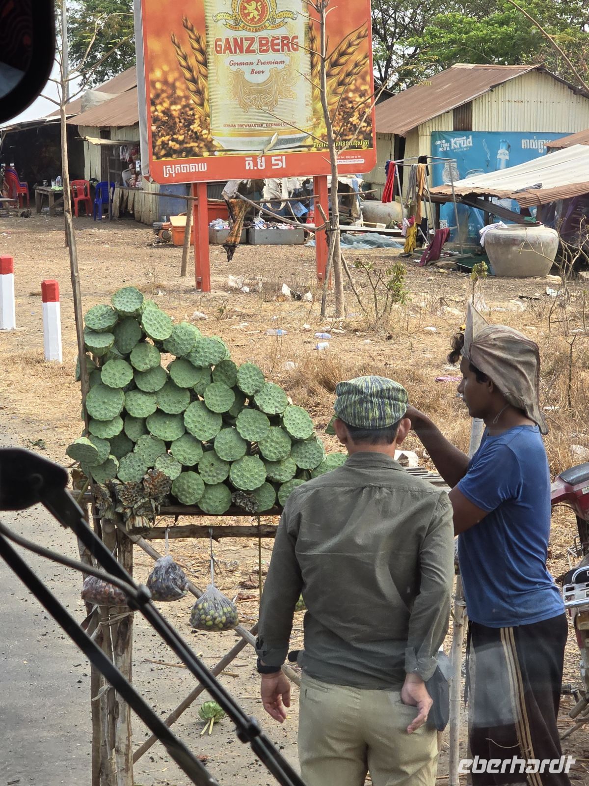 Nach den 2 Tagen in Phnom Penh geht es heute weiter in den Norden, nach Siem Reap, der Ort der sich neben der Tempelanlage Angkor Wat befindet. Für die 350 Kilometer werden wir wohl den ganzen Tag unterwegs sein. Schon bald nachdem wir die Stadt verlassen haben, sehen wir am Straßenrand Händler die Lotusblüten verkaufen, genau gesagt nur die Fruchtstempel der Blüten. Dort befinden sich die Samen, die man leicht herausheben kann und gegessen werden. Sie sehen aus wie Kichererbsen schmecken auch etwas mehlig und sind aber sehr vitaminreich und nahrhaft. Ein ganz anderes Kaliber kommt, als wir nach circa einer Stunde auf einem Insektenmarkt in Skunt stoppen. Kaum sind wir ausgestiegen stürmen schon Kinder auf uns zu, halten uns riesengroße Spinnen entgegen, wollen sie uns sogar auf Hemd und Bluse setzen, wir konnten gerade noch rechtzeitig abwehren. Diese Tarantel Spinnen werden von den Kindern und Bauern aus der Erde gegraben und zu Tausenden gegrillt. Wir sehen Sie auf einem Haufen gemeinsam mit Hunderten liegen, schwarz verkohlt ein grausiges Bild. Daneben liegen gegrillte Frösche, kleine zierliche Frösche, und nicht weit davon entfernt ein anderer Haufen mit Skorpionen und mit Kakerlaken, auch Erdwürmer und sonstige Kriechtiere, die hier in Kambodscha alle erstaunlich groß werden. Ich war erstaunt, es fand sich eine tapfere Gruppe aus unserer Reihe, die neugierig genug war, sich die schauerliche Vielfalt in den Mund zu schieben und geschmacklich zu beurteilen. Zum Glück gab es auch noch Obststände, frisch und getrocknet, so dass auch die anderen hier etwas zu essen finden. Neben dem Obst ist auf der Erde eine große Fläche mit frischen geernteten Cashewnüssen bedeckt, die noch in ihrer Schale sind und hier getrocknet werden.