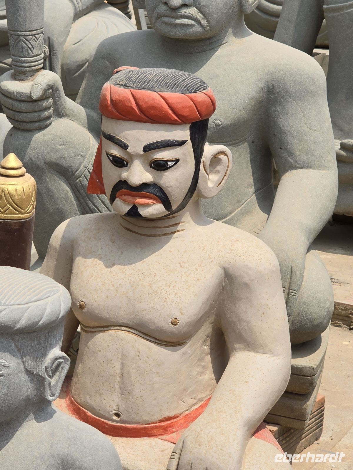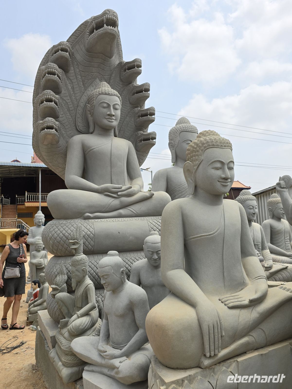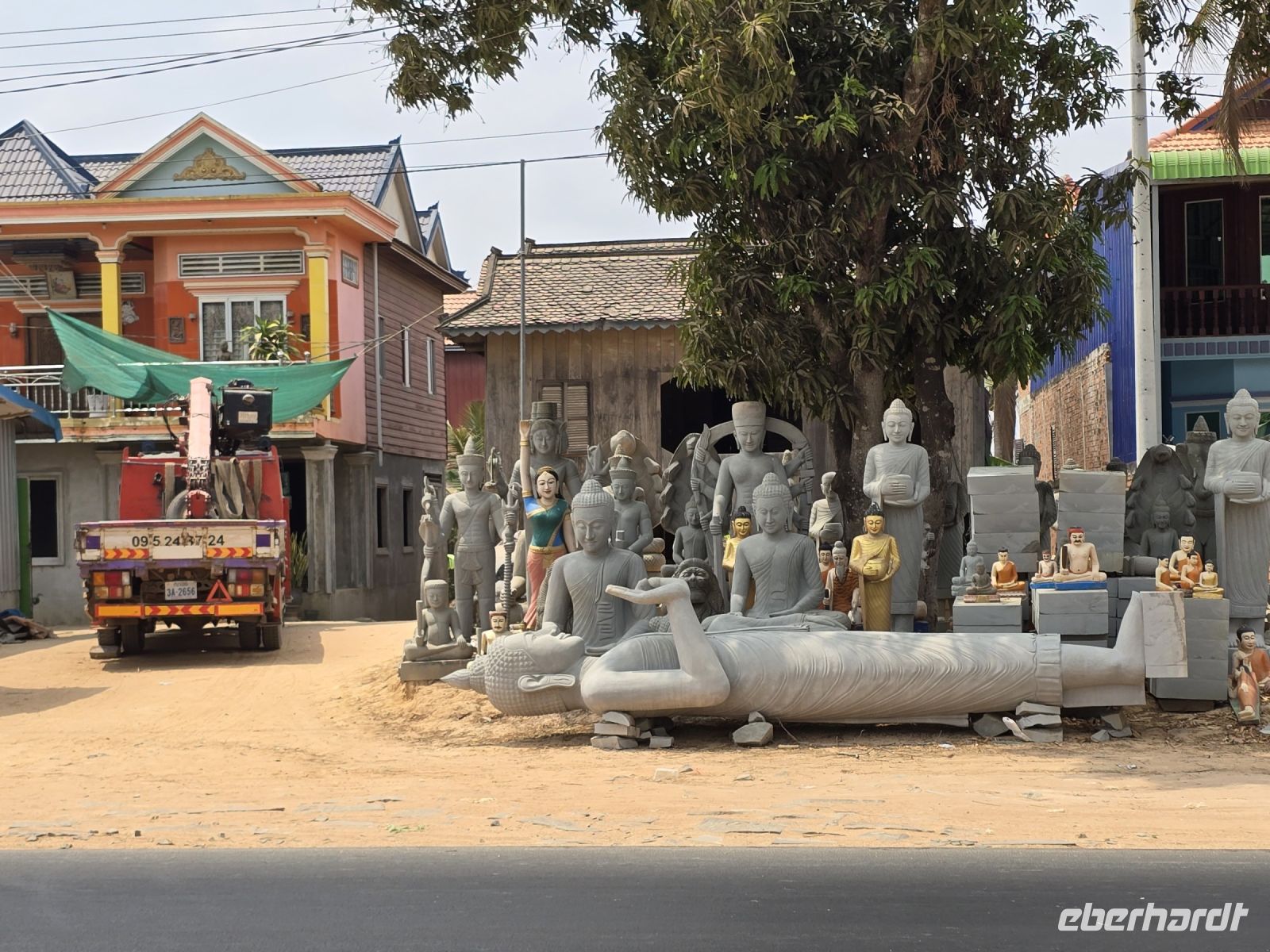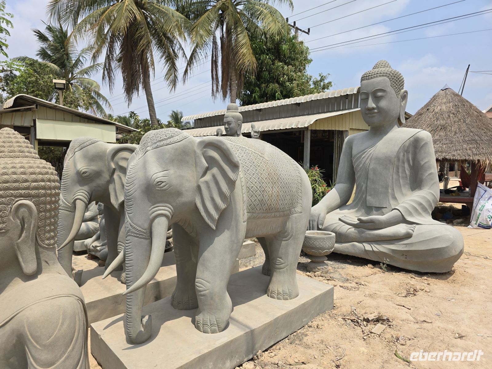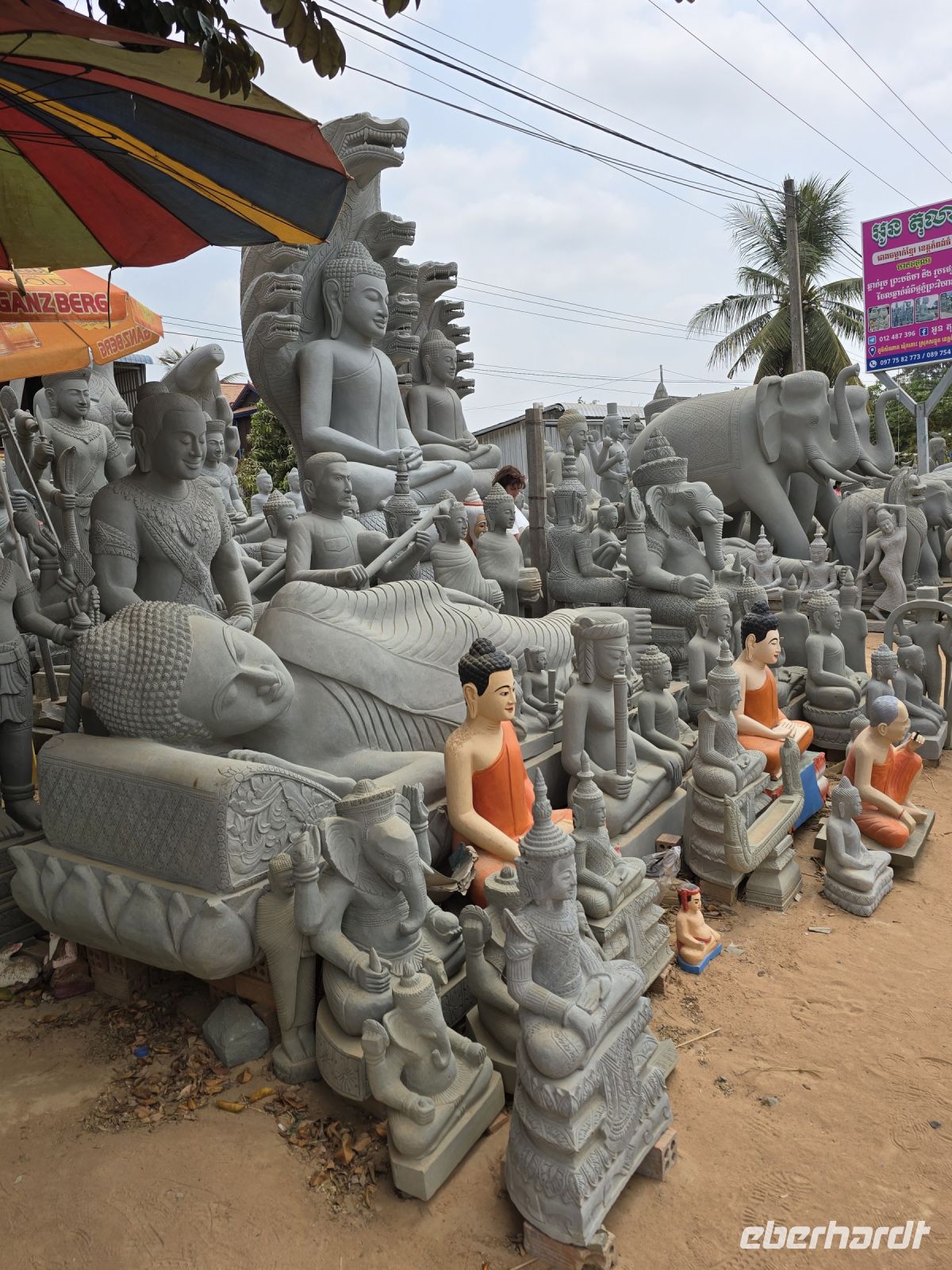 In dem Ort Santuk halten wir nochmal an und schauen uns hier die Steinmetzarbeiten an. Das Dorf zieht sich links und rechts der Straße lang und besteht fast nur aus Steinmetzen. Der Bedarf an Steinmetzarbeiten ist in Kambodscha relativ groß, durch die vielen buddhistischen und hinduistischen Tempel und Wat-Anlagen. Dafür passt auch das Angebot der Steinmetze , Buddhas in allen Größen, Naga Schlangengötter, Tiger, Tänzerinnen, Götter und Dämonen und natürlich Elefanten von klein bis riesengroß. Diese Steinmetzarbeiten werden hier mühsam von Hand gefertigt, die Arbeiter knien oder hocken auf der Erde und arbeitet sehr aufwendig an ihren Objekten. Die ungeheure Menge an Objekten, Tieren und Figuren die sich links und rechts an der Straße auf reihen ist kaum zu fassen.