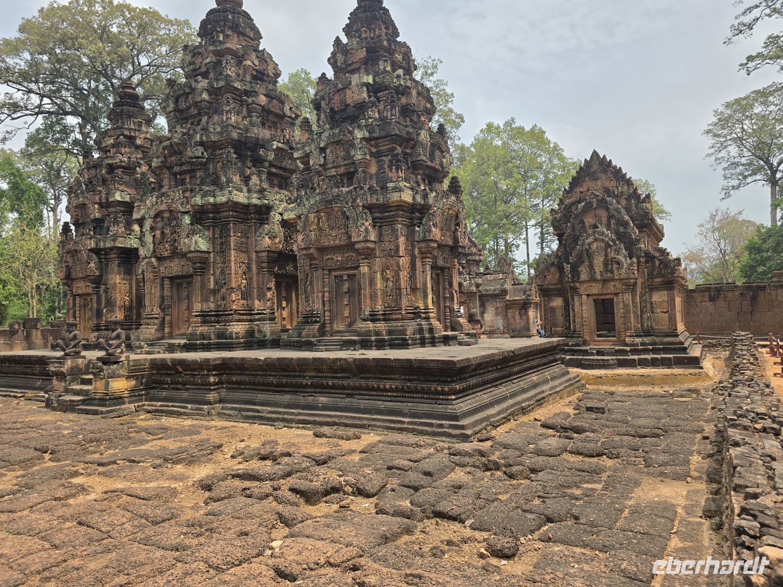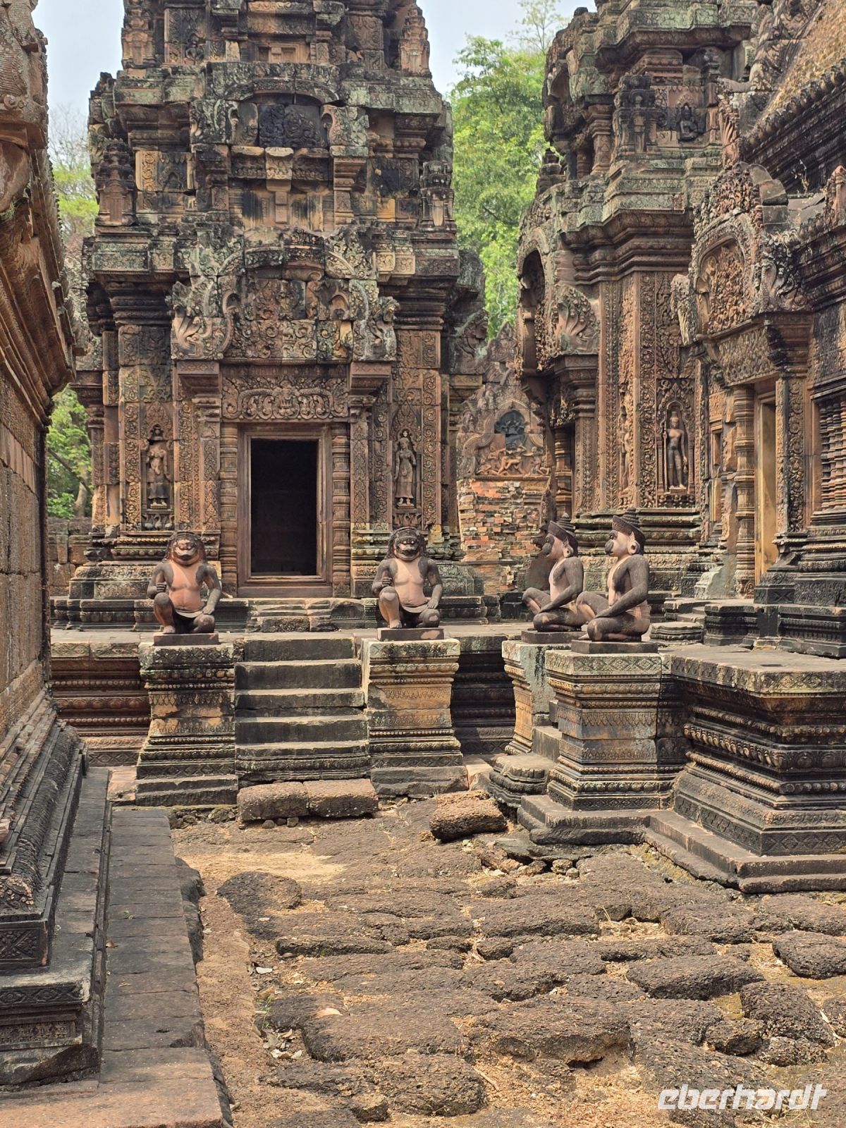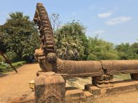 So nun geht es aber weiter zum nächsten Tempel, der den Namen Banteay Srei trägt, er wurde schon im 10. Jahrhundert erbaut und ist somit einer der ältesten Tempel in Kambodscha. Es ist ein kleinerer Tempel aber mit ganz besonderen Reizen. Das eine sind die Affengötter die hier auf Säulen, in einer wohl gruppierten Runde hocken. Das andere sind die vielen kleinen Türmchen die einzeln auf dem Areal stehen, und mit vielen Details verziert sind. Der nächste Stopp ist unsere Mittagspause große Auswahl in einem flinken Restaurant, zum Beispiel ein in einer geöffneten Kokosnuss gekochtes Curry, schmeckt wunderbar.