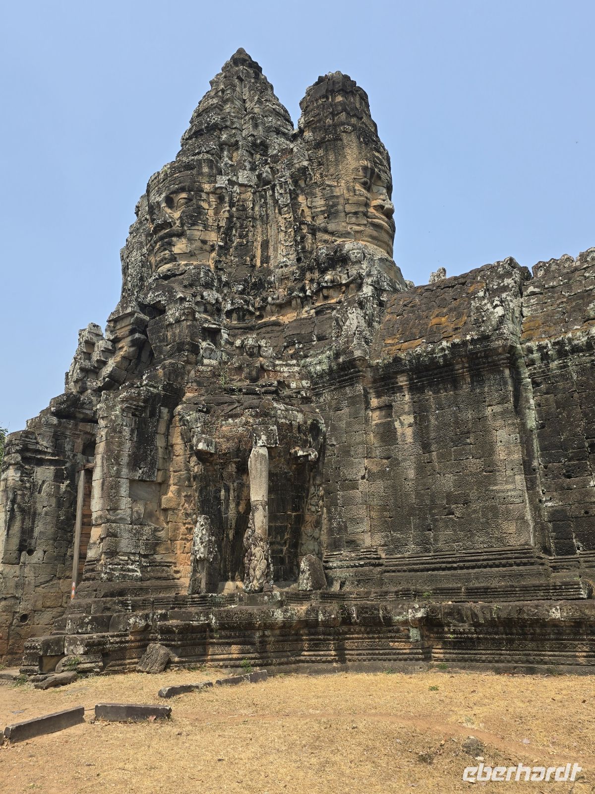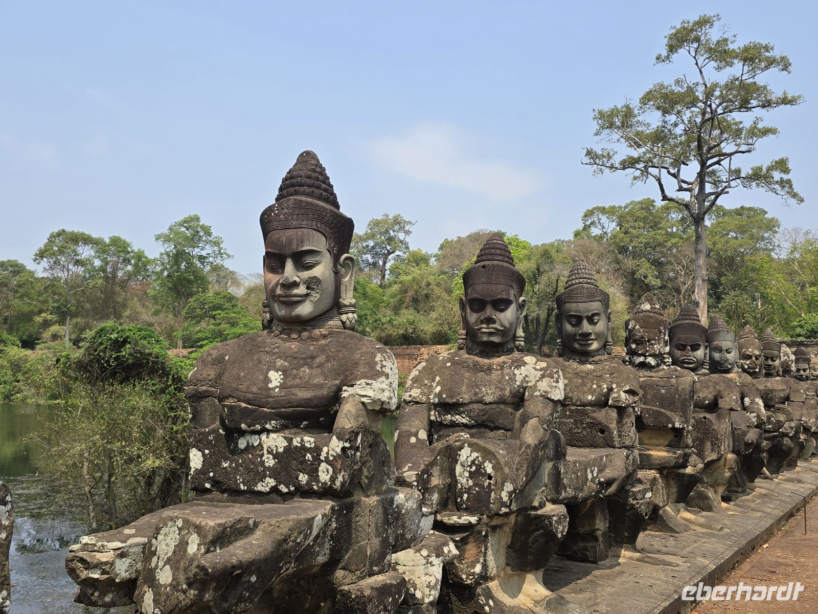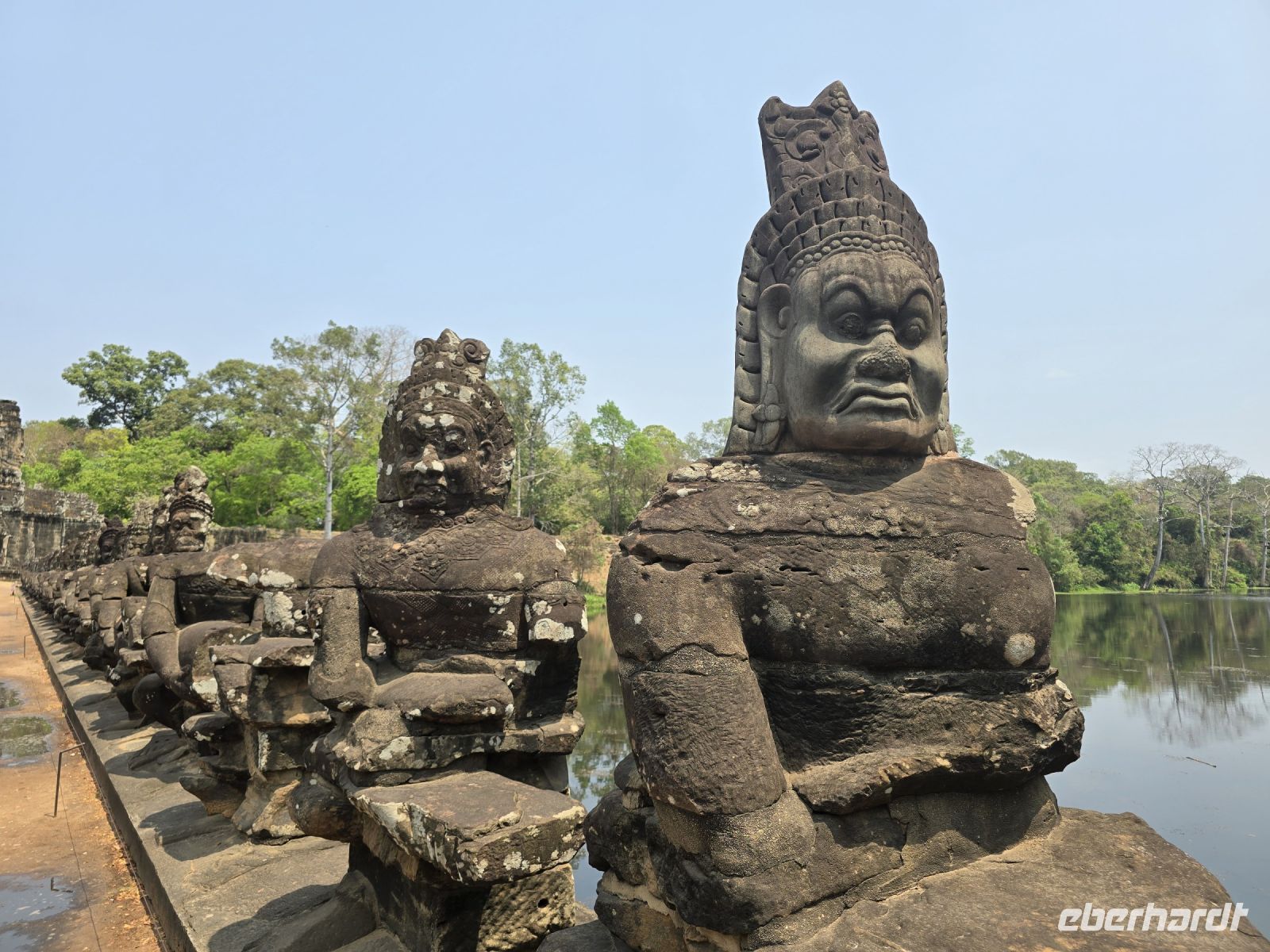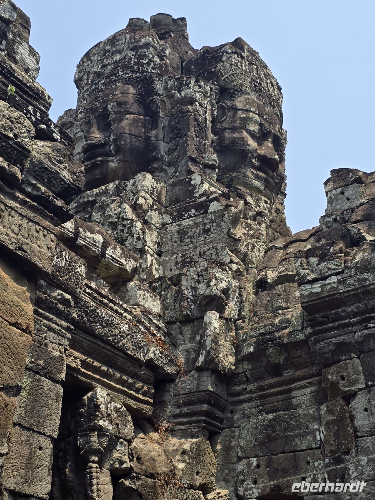 Mit dem Bus fahren wir ein Stück weiter zum Bayon Tempel. Über das Südtor, Tonle On, betreten wir diese Tempelanlage, davor liegt ein Wassergraben den wir mit einer historischen Brücke überqueren, die Brücke ist links mit Göttern geschmückt und rechts mit Dämonen. Aufgereiht dem Verlauf der Brücke folgend, jede Skulptur ist einmalig. Die ganze Tempelanlage besteht aus vielen Türmen und fast alle Türme sind mit Gesichtern dekoriert, die erst erkannt werden wenn man etwas länger hinschaut, aber dann schauen die Gesichter zurück und man erkennt ein Lächeln oder einen bösen Blick. Wir wechseln die Positionen, spielen mit den Schatten damit wir die Eindrücke auf unseren Fotos festhalten können. Unser Tempelguide weiß viele Details über diese Anlagen zu berichten, und zudem gibt er uns noch jede Menge Tipps wie wir diese etwas komplizierten Motive besser fotografieren können. Er hat in dieser Tempelanlage schon sehr viele Erfahrungen gemacht die er gern an uns weitergibt.
