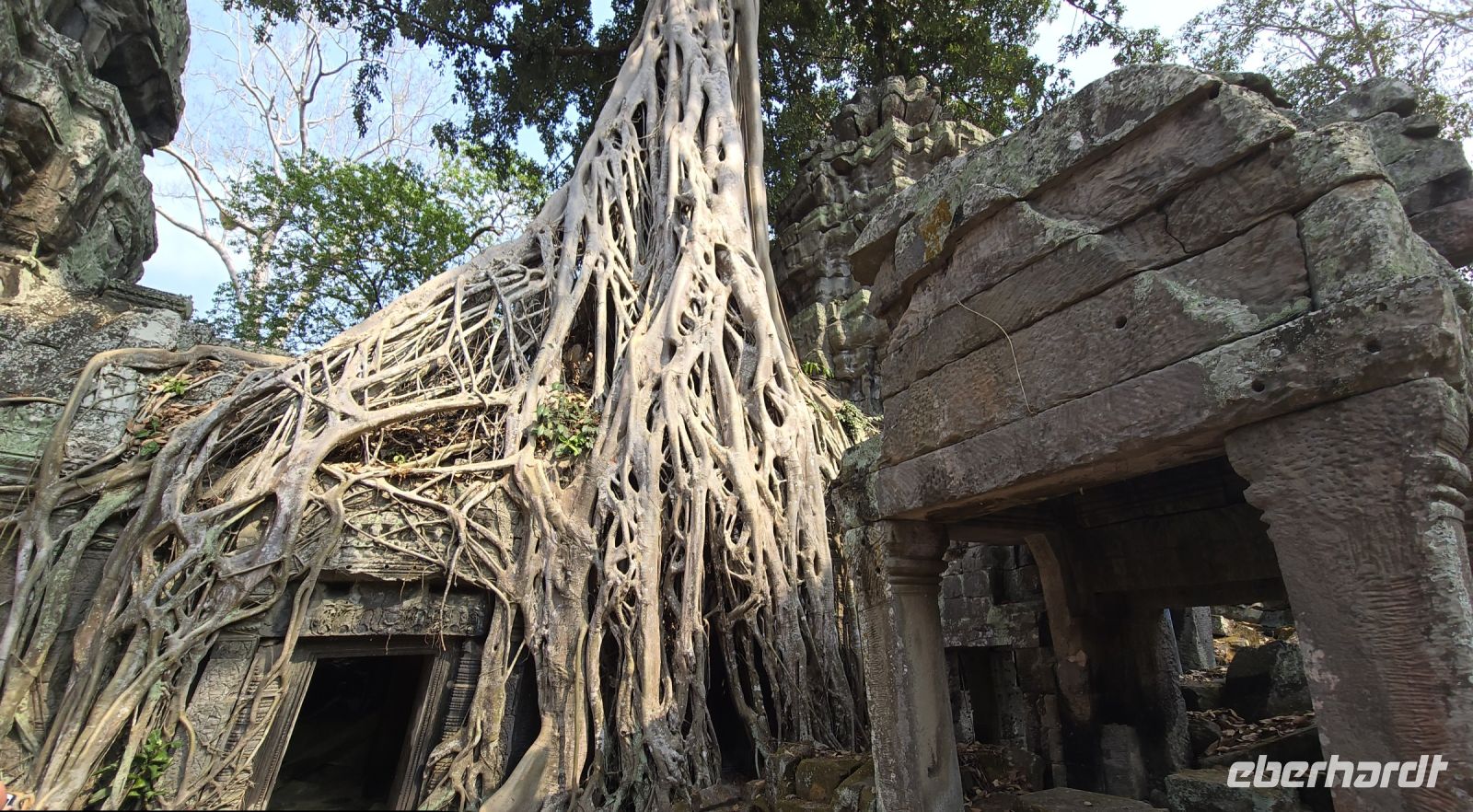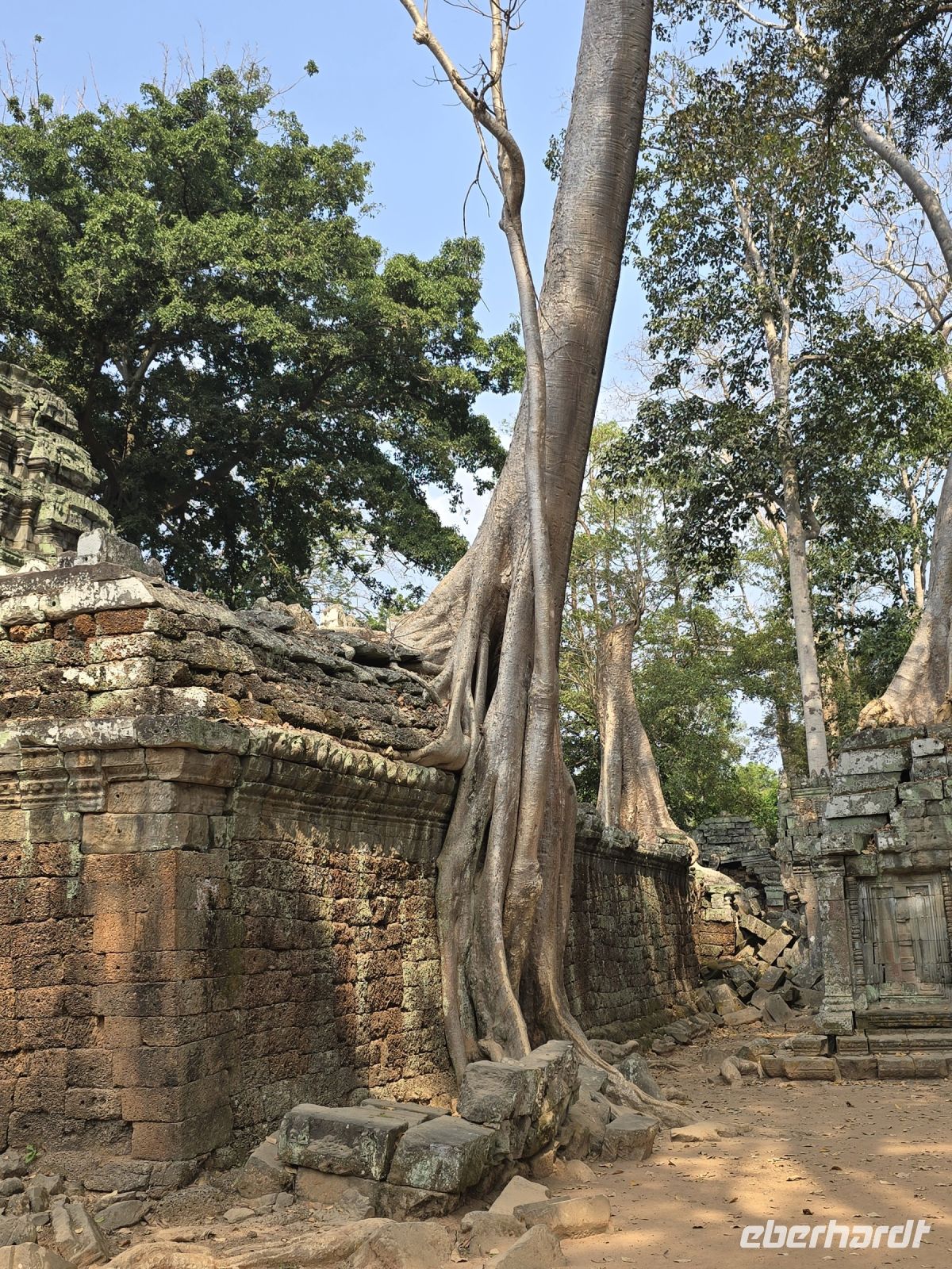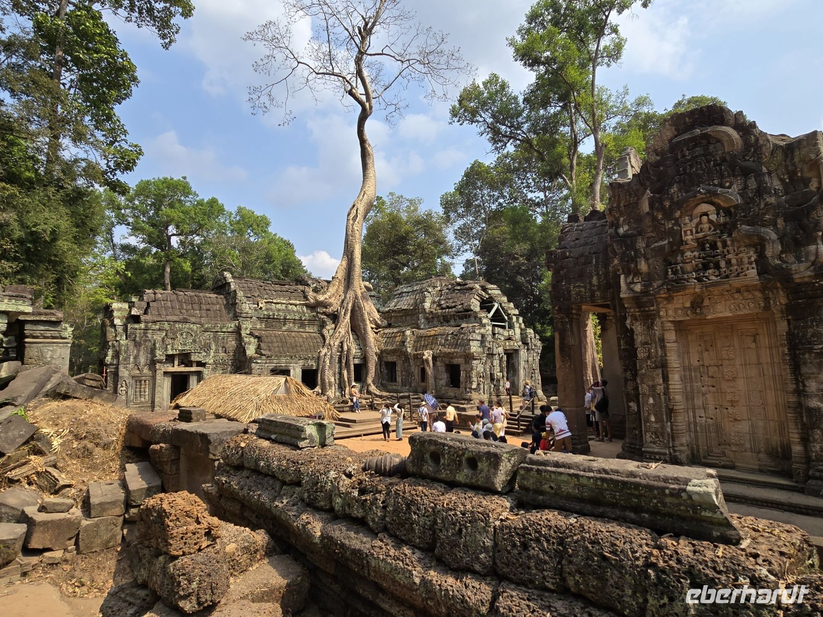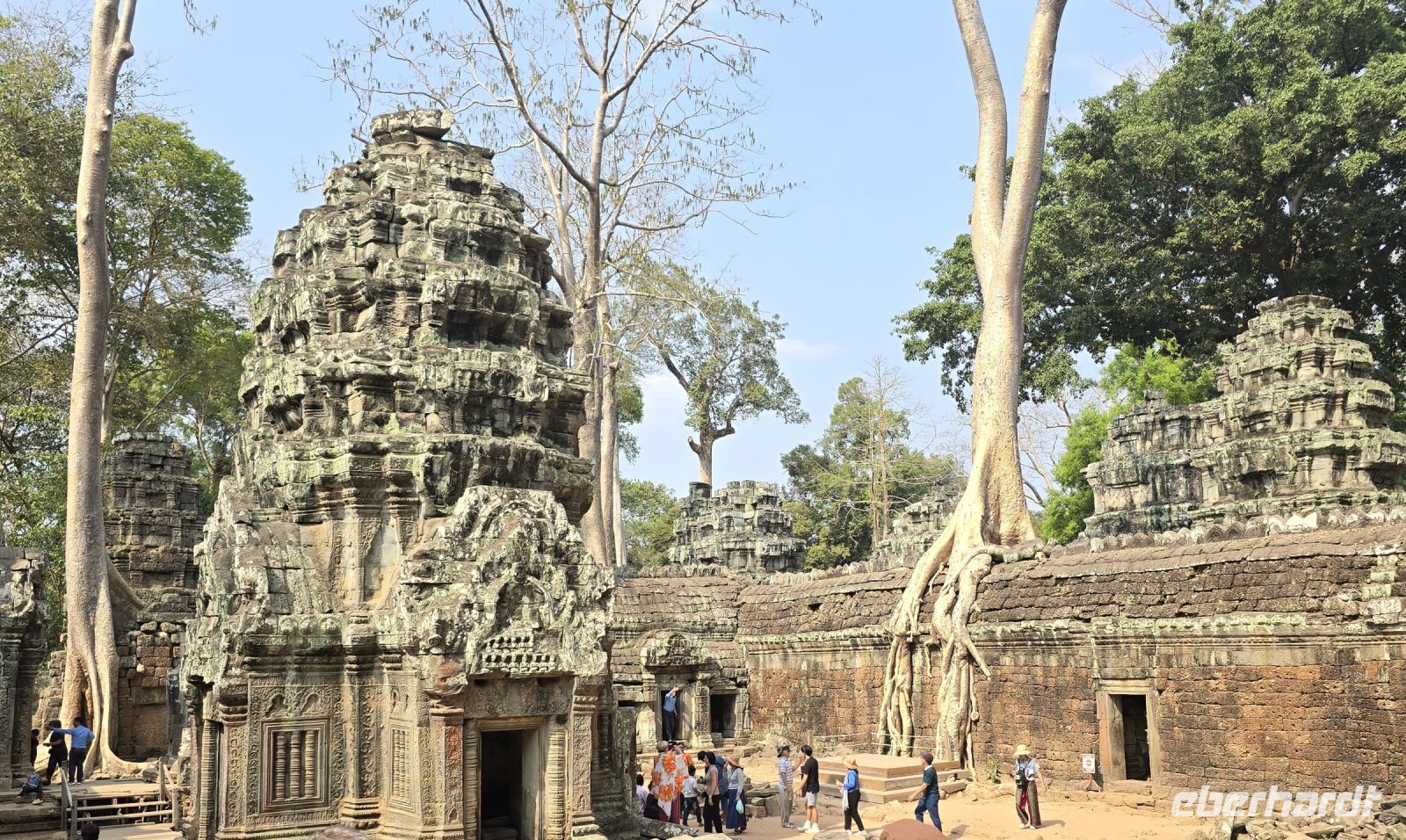 Nachdem wir eine kleine Mittagspause gemacht und wieder neue Energie getankt haben, brechen wir auf zu unserem dritten Tempel Abenteuer an diesem Tag. Wir fahren zum nahegelegenen Dschungeltempel oder auch Ta Prohm genannt. Manche nennen diesen Tempel in der Zwischenzeit auch Tomb Raider Tempel, weil hier der gleichnamige Spielfilm gedreht wurde. Diese Tempelanlage hat ganz besondere Reize, sie wurde 1000 Jahre ganz vergessen und niemand betrat diese Gebiet und die Natur vereinnahmte die Steine, Mauern und Türme komplett für sich. Die Vegetation fand ihren Raum, große Bäume trieben aus, dicke Wurzeln umschlingen die Gesteinsmassen, die Bäume stehen, gehalten durch die Mauern und im Gegenzug, halten die Wurzeln die Bäume die Mauern stabil. Es ist eine Symbiose die sich gemeinsam trägt eine Trennung ist nun unmöglich es würde alles kaputt gehen. Die mächtigen Bäume teilweise 30 Meter hoch, Wurzeln so stark wie normale Baumstämme klammern, schmiegen sich an die Mauern, es gibt unendlich tolle Fotomotive, wir alle sind begeistert, ganz besonders unsere ambitionierten Amateurfotografen, die am liebsten noch weitere Stunden in dieser Anlage verbringen würden. Aber die Hitze und die Sonne begrenzt unsere Zeit und wir kommen an unsere Leistungsgrenze und fahre deshalb mit dem Bus wieder zurück zum großen Parkplatz steigen in unseren Reisebus um und lassen uns zum Hotel zurückfahren. Den Nachmittag brauchen wir definitiv zur Erholung. Erst am Abend tauchen die meisten wieder auf und dann gehen wir gemeinsam Abendessen. Bei gegenseitigen Erzählungen wird das Erlebte nochmal wiedergespiegelt, es war ein unglaublich spannender Tag.