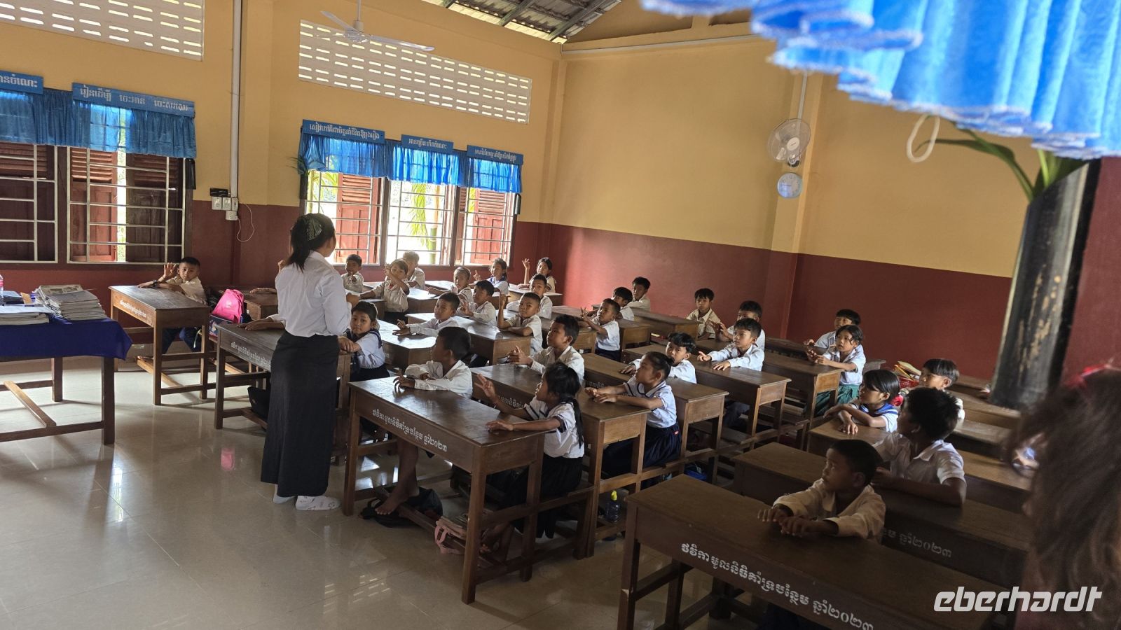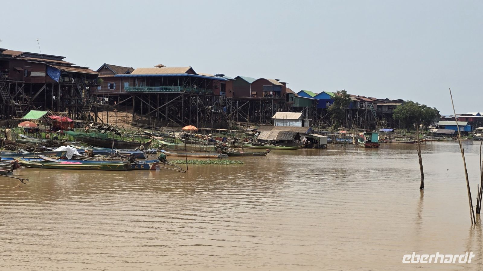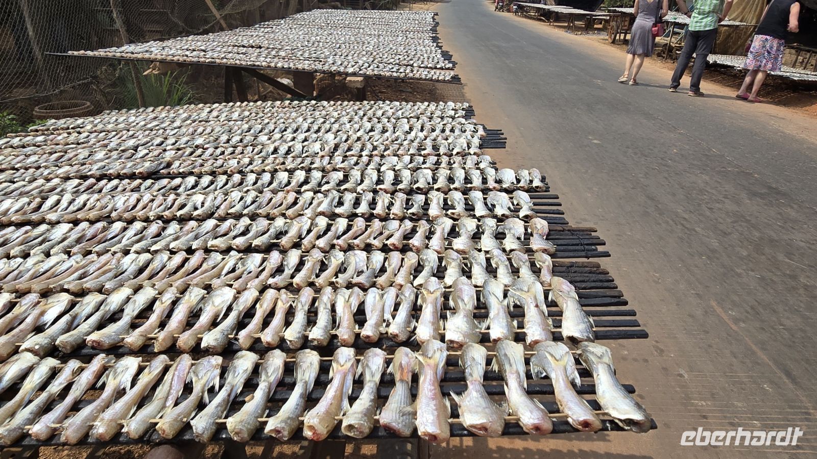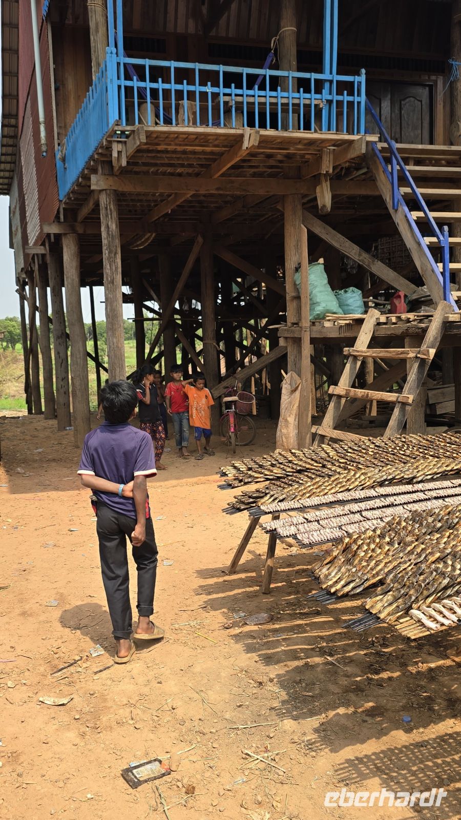Heute ist der letzte Tag in Kambodscha und auch schon fast der letzte unseres Urlaubs. Wir haben aber noch etwas Wichtiges zu erledigen, wir wollen heute Morgen die Vessvan Primary School besuchen und ihnen eine kleine Unterstützung für ihren Schulbetrieb spenden. Wir fahren pünktlich morgens um 08:00 Uhr los, nehmen gleich unsere Koffer mit, denn wir werden dann direkt zum Flughafen am Abend fahren. Als wir an der Vessvan Primary School ankommen, werden wir schon ungeduldig erwartet. Die Direktorin steht am Eingangstor, zusammen mit dem Vertreter unserer lokalen Agentur und warten auf unsere Ankunft. Nachdem wir uns alle freundlich begrüßt haben, sehen wir das noch einige mehr auf uns warten. Der Schulhof war gefüllt mit Kindern die alle in Reih und Glied, genauer gesagt in 4 Reihen aufgestellt hintereinander, uns mit neugierigen Augen ansahen. Während unserer Anfahrt heute Vormittag, hat unsere Gruppe beschlossen, dass wir das übrige Trinkgeld ebenfalls an die Schule spenden, somit kann ich der Direktorin € 235.- zusätzlich übergeben, was sie sichtlich freut. Aber wir merken, dass die Kinder immer ungeduldiger werden, denn für sie stehen schon Schulbücher, Stifte, Mandarinen, Apfel und Orangensaft bereit. Wir beeilen uns die Sachen endlich auszupacken, es ist alles ist gut vorbereitet von der Partner Agentur, jedes der Kinder bekommt ein kleines Geschenk und die Rektorin bekommt nochmal Geld überreicht das von Eberhardt Travel gespendet wurde, zum Erhalt des Schulbetriebs. Es folgen ein paar Ansprachen und die Frau Rektorin erklärt uns wie der Schulbetrieb funktioniert. Das am Vormittag die erste Hälfte der Kinder kommen und am Nachmittag die die zweite Hälfte, somit werden die Klassenzimmer doppelt genutzt und die insgesamt 700 Schüler können in normalen Klassengrößen unterrichtet werden. Ich frage sie nach der Bedeutung der Spenden für die Schule, wieviel Anteil die Spenden an der Finanzierung der Schule ausmachen. Daraufhin erklärt sie uns, dass der Staat das Gehalt für die Lehrer und den Kindern ein warmes Essen am Tag bezahlt, aber für sonstige Kosten und für Gebäudeerweiterung und Reparaturen steht kein Geld vom Staat zur Verfügung. Daraufhin entschließen sich spontan 3 Ehepaare von unserer Gruppe, der Schule eine größere Spende zu machen. Sie fragen welche Dinge in der Schule am wichtigsten gemacht werden müssen, daraufhin wurde das Einrichten von neuen Toiletten, 2 neuen Klassenzimmer und Umkleideräume genannt. Unsere 6 Gönner erklärten sich sofort bereit all diese Kosten zu übernehmen und sobald die Kontonummern und E-Mail-Adressen ausgetauscht sind, wird das Geld überwiesen. Die Direktorin kann ihr Glück gar nicht fassen. Sie sagt, das hätte sie bisher noch nicht erlebt, dass eine Reisegruppe vorbeikommt und dann spontan so eine große zusätzliche Spende bereitstellt. Wir sind alle ein bisschen gerührt und uns ist bewusst das ohne das Engagement der Direktorin die Schule weit schlechter dastehen würde. Es wird vereinbart das die Partneragentur von Eberhardt die Aufsicht über die Verwendung der Gelder übernimmt und den Kontakt in beide Richtungen herstellt. Damit ist die Grundlage für eine wichtige Hilfe für die Schule gelegt. Wir wenden uns zum Abschluss den Kindern noch etwas zu, schauen in Ihre Klassenzimmer, wie sie ordentlich aufgereiht in ihren Schuluniformen dasitzen und einige schon in den neuen Schulbüchern schreiben. Aber jetzt geben wir uns einen Ruck, denn wir wollen den Schulbetrieb nicht noch länger aufhalten, machen uns jetzt auf den Weg zum größten Binnensee Kambodschas, dem Tonle Sap See. Der See ist ein riesengroßes Wasserreservoir in dieser Region. In der Trockenzeit hat der See, eine Fläche von 3000 Quadrat Kilometern und in der Regenzeit wächst er auf über 10.000 Quadrat Kilometer an. Am See sind Dörfer angesiedelt, hier wohnen die armen Leute, erklärt uns Vannek, traditionelle Fischer und Bauern leben hier. Sie arbeiten und leben fast noch genau so, wie vor hundert Jahren, die Entwicklung Kambodschas und der Fortschritt kommen bei Ihnen nicht an. Sie Leben in ihren traditionellen Stabhäusern, 3 bis 4 m über der Erde. Den wenn der See in der Regenzeit wächst, sind ihre Häuser und das ganze Dorf überflutet. Dann ziehen sich die Menschen in das oben liegende Stockwerk zurück, Leben von Ihren Vorräten und warten bis die Regenzeit vorüber ist. Einer Ihrer Vorräte ist der getrocknete und geräucherte Fisch der hier in großen Paletten an der Straße entlang zum Trocknen aufgestellt ist.