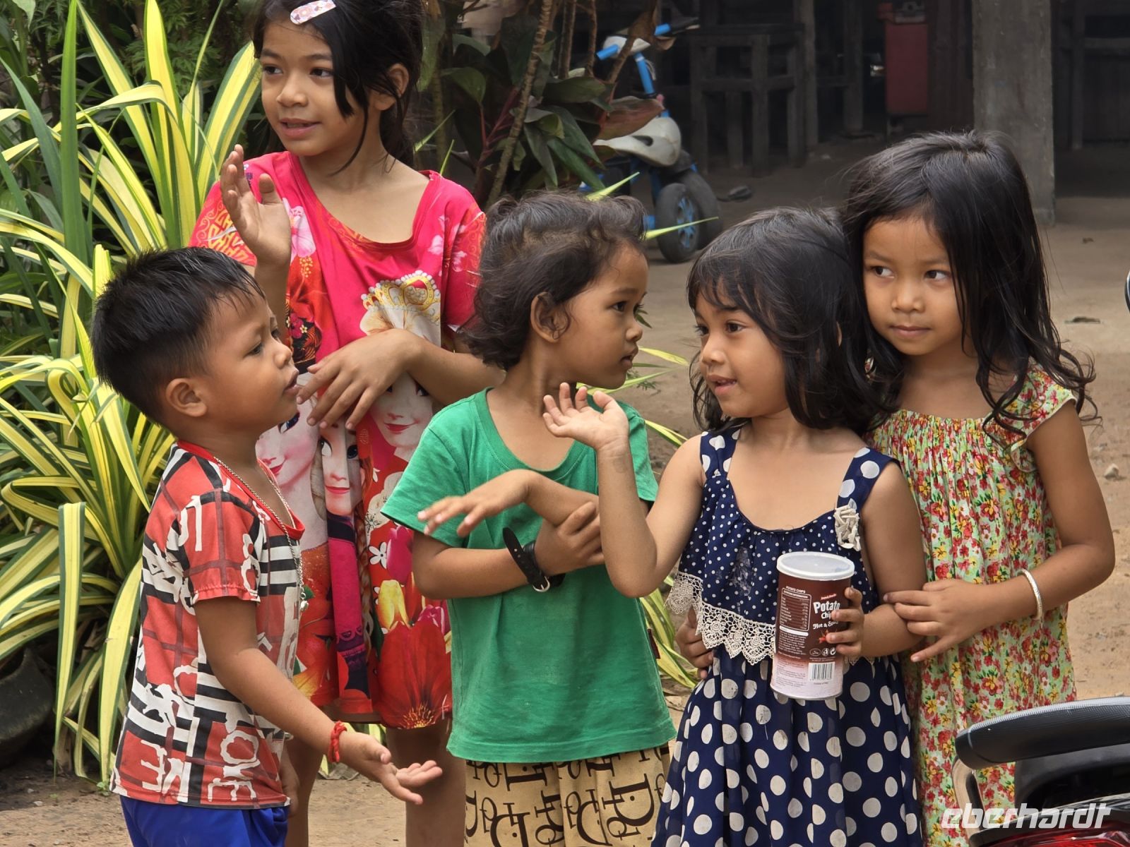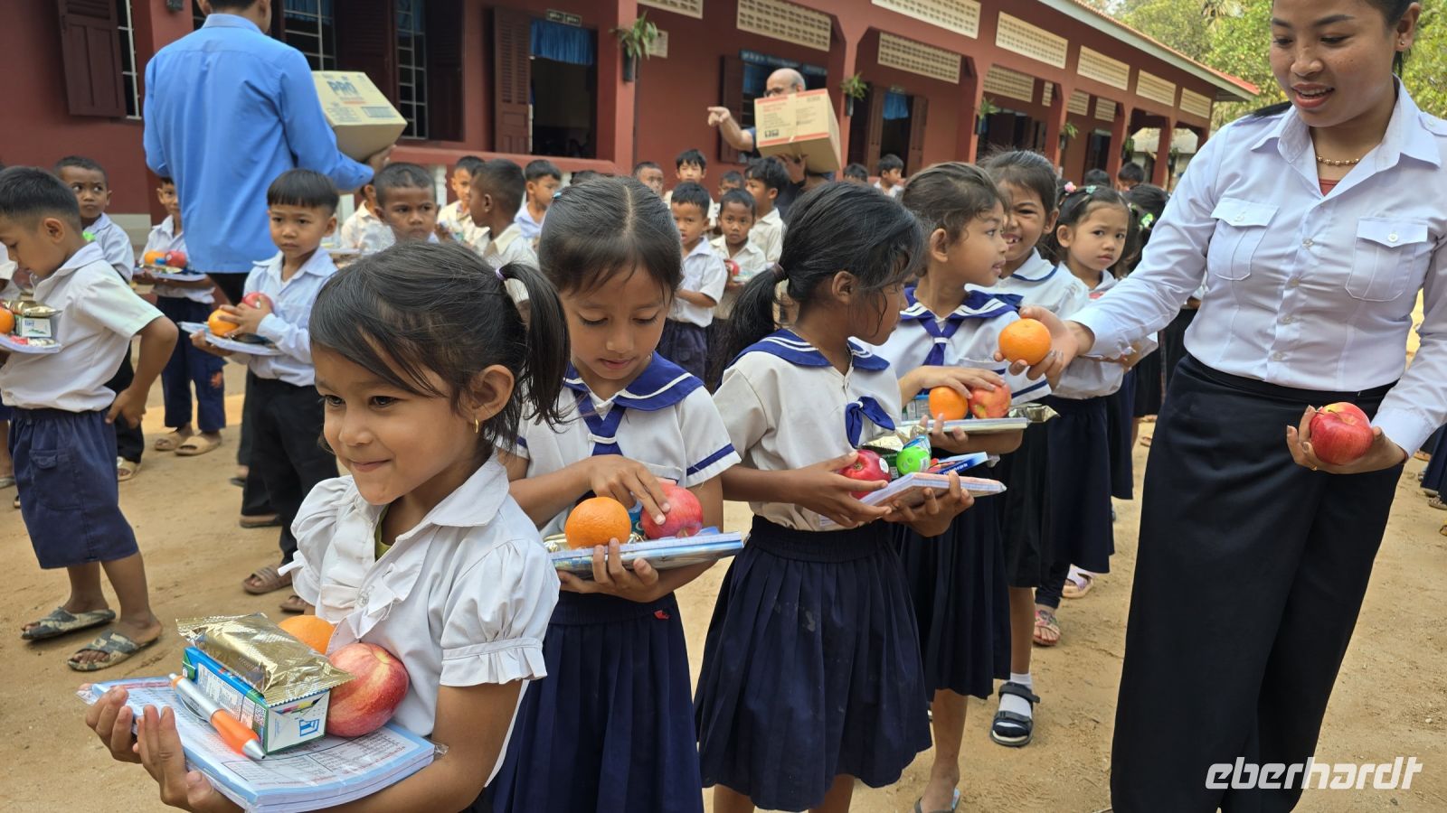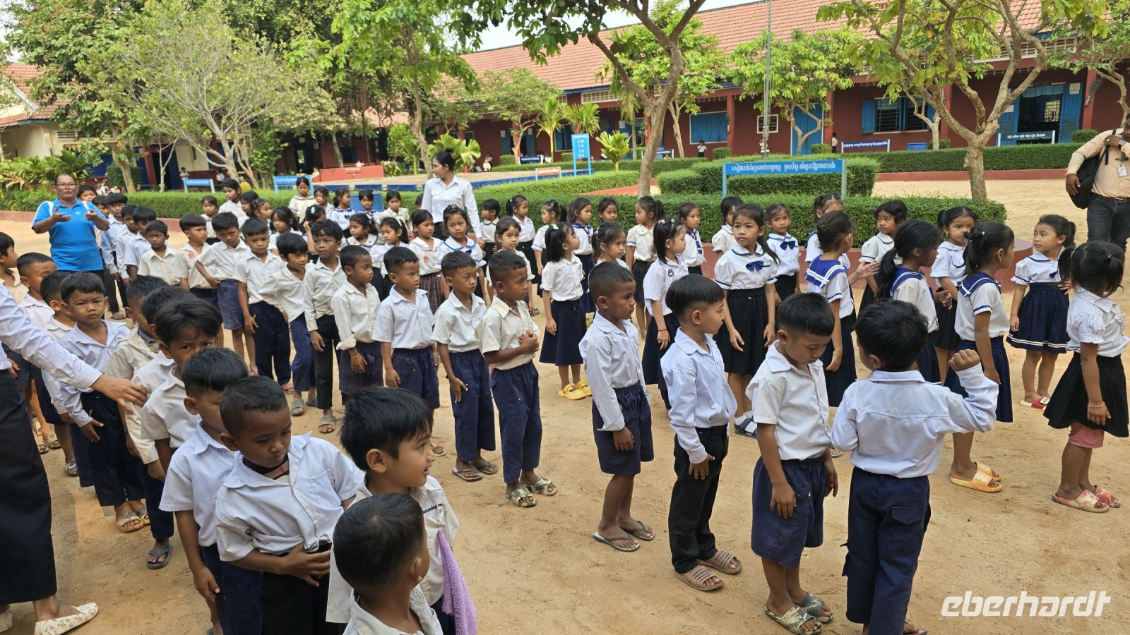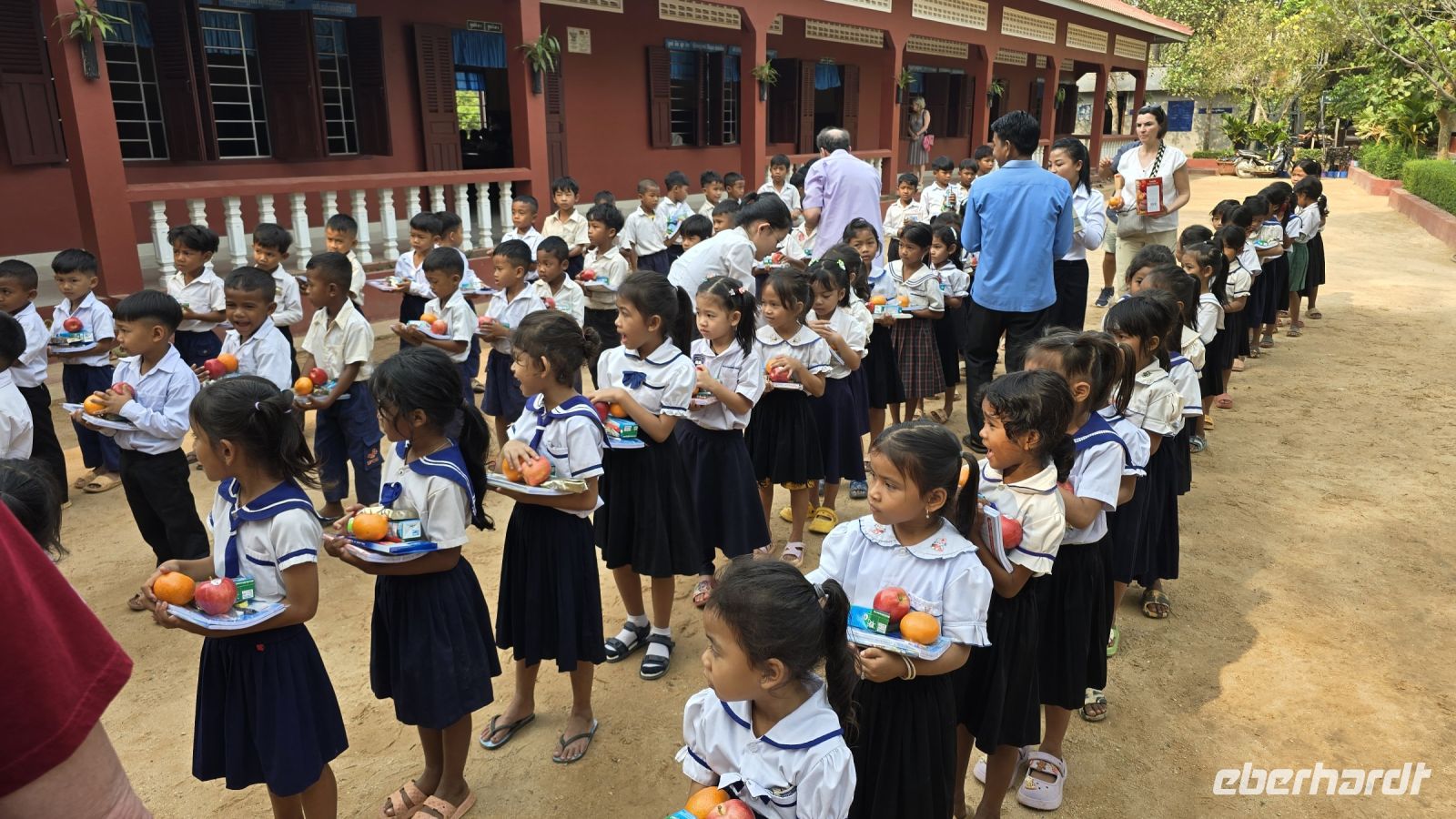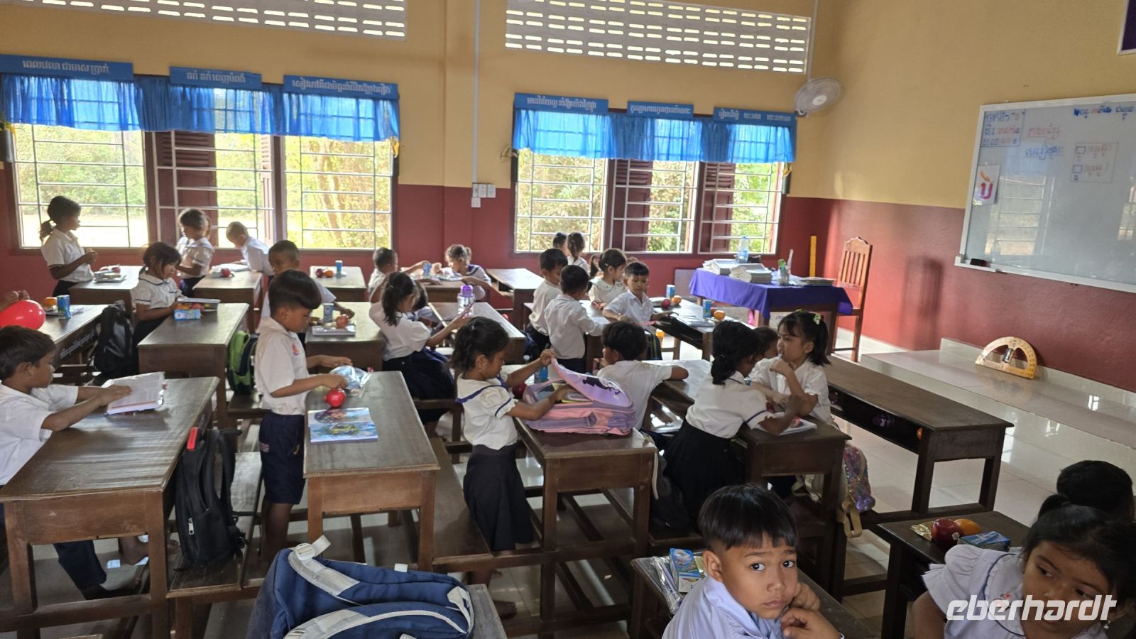 Heute ist der letzte Tag in Kambodscha und auch schon fast der letzte unseres Urlaubs. Wir haben aber noch etwas Wichtiges zu erledigen, wir wollen heute Morgen die Vessvan Primary School besuchen und ihnen eine kleine Unterstützung für ihren Schulbetrieb spenden. Wir fahren pünktlich morgens um 08:00 Uhr los, nehmen gleich unsere Koffer mit, denn wir werden dann direkt zum Flughafen am Abend fahren. Als wir an der Vessvan Primary School ankommen, werden wir schon ungeduldig erwartet. Die Direktorin steht am Eingangstor, zusammen mit dem Vertreter unserer lokalen Agentur und warten auf unsere Ankunft. Nachdem wir uns alle freundlich begrüßt haben, sehen wir das noch einige mehr auf uns warten. Der Schulhof war gefüllt mit Kindern die alle in Reih und Glied, genauer gesagt in 4 Reihen aufgestellt hintereinander, uns mit neugierigen Augen ansahen. Während unserer Anfahrt heute Vormittag, hat unsere Gruppe beschlossen, dass wir das übrige Trinkgeld ebenfalls an die Schule spenden, somit kann ich der Direktorin € 235.- zusätzlich übergeben, was sie sichtlich freut. Aber wir merken, dass die Kinder immer ungeduldiger werden, denn für sie stehen schon Schulbücher, Stifte, Mandarinen, Apfel und Orangensaft bereit. Wir beeilen uns die Sachen endlich auszupacken, es ist alles ist gut vorbereitet von der Partner Agentur, jedes der Kinder bekommt ein kleines Geschenk und die Rektorin bekommt nochmal Geld überreicht das von Eberhardt Travel gespendet wurde, zum Erhalt des Schulbetriebs. Es folgen ein paar Ansprachen und die Frau Rektorin erklärt uns wie der Schulbetrieb funktioniert. Das am Vormittag die erste Hälfte der Kinder kommen und am Nachmittag die die zweite Hälfte, somit werden die Klassenzimmer doppelt genutzt und die insgesamt 700 Schüler können in normalen Klassengrößen unterrichtet werden. Ich frage sie nach der Bedeutung der Spenden für die Schule, wieviel Anteil die Spenden an der Finanzierung der Schule ausmachen. Daraufhin erklärt sie uns, dass der Staat das Gehalt für die Lehrer und den Kindern ein warmes Essen am Tag bezahlt, aber für sonstige Kosten und für Gebäudeerweiterung und Reparaturen steht kein Geld vom Staat zur Verfügung. Daraufhin entschließen sich spontan 3 Ehepaare von unserer Gruppe, der Schule eine größere Spende zu machen. Sie fragen welche Dinge in der Schule am wichtigsten gemacht werden müssen, daraufhin wurde das Einrichten von neuen Toiletten, 2 neuen Klassenzimmer und Umkleideräume genannt. Unsere 6 Gönner erklärten sich sofort bereit all diese Kosten zu übernehmen und sobald die Kontonummern und E-Mail-Adressen ausgetauscht sind, wird das Geld überwiesen. Die Direktorin kann ihr Glück gar nicht fassen. Sie sagt, das hätte sie bisher noch nicht erlebt, dass eine Reisegruppe vorbeikommt und dann spontan so eine große zusätzliche Spende bereitstellt. Wir sind alle ein bisschen gerührt und uns ist bewusst das ohne das Engagement der Direktorin die Schule weit schlechter dastehen würde. Es wird vereinbart das die Partneragentur von Eberhardt die Aufsicht über die Verwendung der Gelder übernimmt und den Kontakt in beide Richtungen herstellt. Damit ist die Grundlage für eine wichtige Hilfe für die Schule gelegt. Wir wenden uns zum Abschluss den Kindern noch etwas zu, schauen in Ihre Klassenzimmer, wie sie ordentlich aufgereiht in ihren Schuluniformen dasitzen und einige schon in den neuen Schulbüchern schreiben. Aber jetzt geben wir uns einen Ruck, denn wir wollen den Schulbetrieb nicht noch länger aufhalten, machen uns jetzt auf den Weg zum größten Binnensee Kambodschas, dem Tonle Sap See. Der See ist ein riesengroßes Wasserreservoir in dieser Region. In der Trockenzeit hat der See, eine Fläche von 3000 Quadrat Kilometern und in der Regenzeit wächst er auf über 10.000 Quadrat Kilometer an. Am See sind Dörfer angesiedelt, hier wohnen die armen Leute, erklärt uns Vannek, traditionelle Fischer und Bauern leben hier. Sie arbeiten und leben fast noch genau so, wie vor hundert Jahren, die Entwicklung Kambodschas und der Fortschritt kommen bei Ihnen nicht an. Sie Leben in ihren traditionellen Stabhäusern, 3 bis 4 m über der Erde. Den wenn der See in der Regenzeit wächst, sind ihre Häuser und das ganze Dorf überflutet. Dann ziehen sich die Menschen in das oben liegende Stockwerk zurück, Leben von Ihren Vorräten und warten bis die Regenzeit vorüber ist. Einer Ihrer Vorräte ist der getrocknete und geräucherte Fisch der hier in großen Paletten an der Straße entlang zum Trocknen aufgestellt ist.