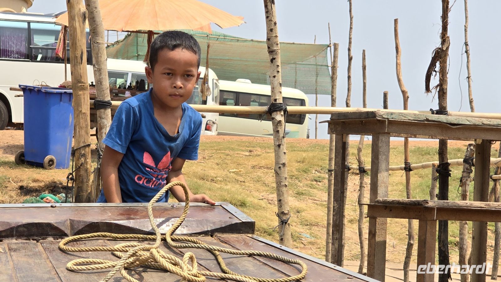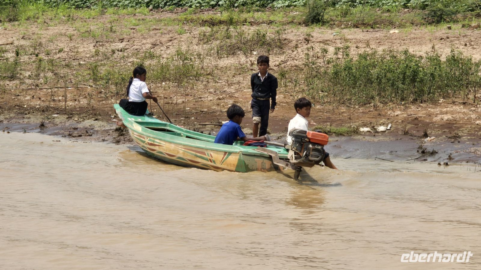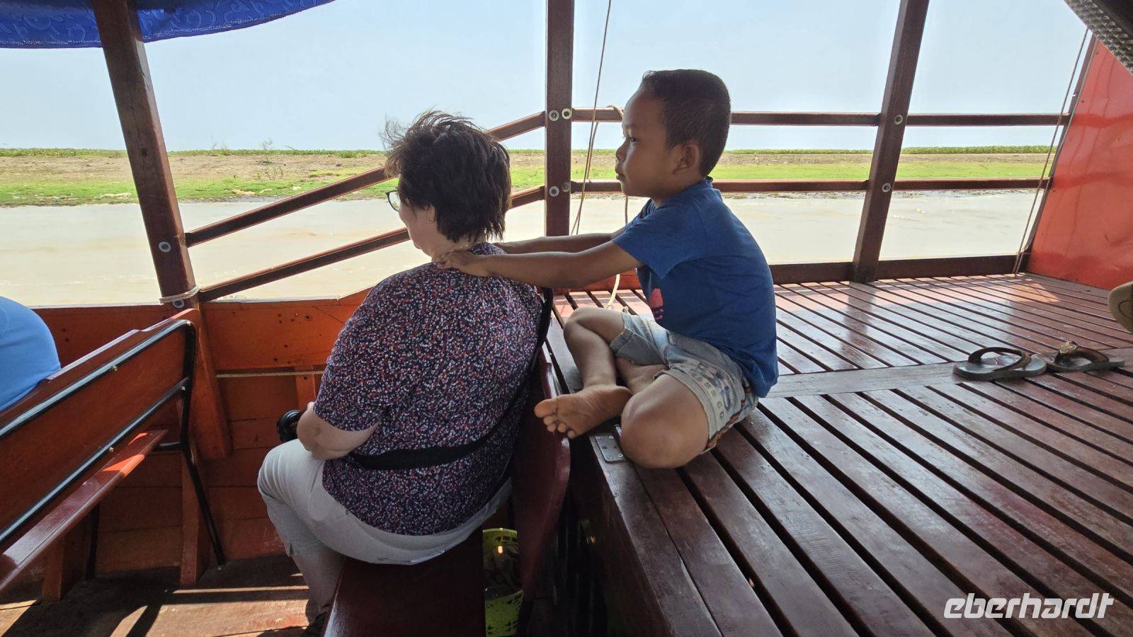 Die junge Frau und ihr kleiner Junge, die uns mit ihrem Boot auf den See hinausfahren, haben mit dem niederen Wasserstand ziemlich zu kämpfen. Immer wieder, laufen wir auf Grund und stecken im Schlamm fest, oder die Schiffsschraube verheddert sich in alten Fischernetzen und sonstigen Müll der sich im Wasser befindet. Wenn die Schiffsschraube mal wieder blockiert ist, dann steigt sie hinten ans Heck und befreit die Motorschraube mit einer Schere von alldem Ballast der sich um sie Schraube herumgewickelt hat. Ich beschließe, dass ich das geplante Trinkgeld für Sie nochmal verdoppeln muss. Sie hat deutlich zu kämpfen um uns trocken über den See zu bringen. Nach einer Weile als wir uns schon wieder auf der Rückfahrt befinden, beginnt ihr kleiner Junge uns eine Nacken- und Rückenmassage zu verabreichen. Ganz ohne Worte geht er von einem zum anderen und gibt jedem gekonnt eine kleine Massage, die die meisten von uns genießen. Ein kleines Trinkgeld dafür nimmt er bescheiden entgegen. Ich denke den Kleinen haben wir ein bisschen ins Herz geschlossen.