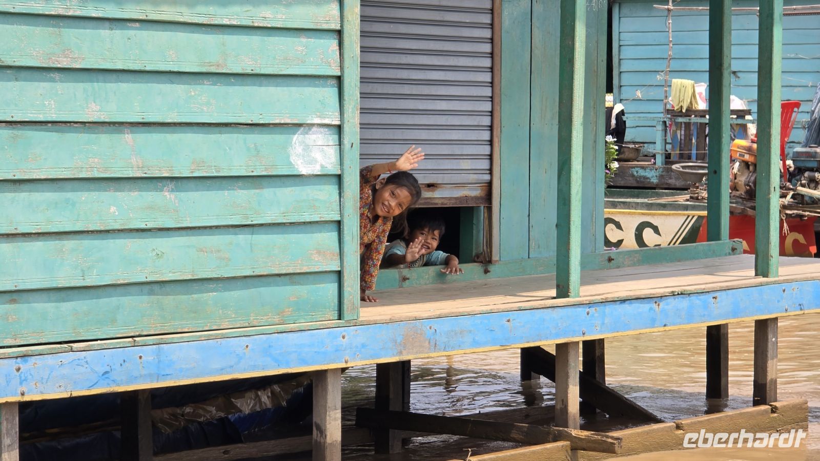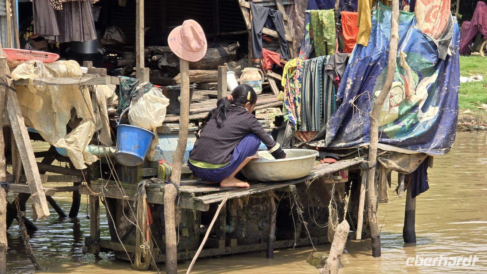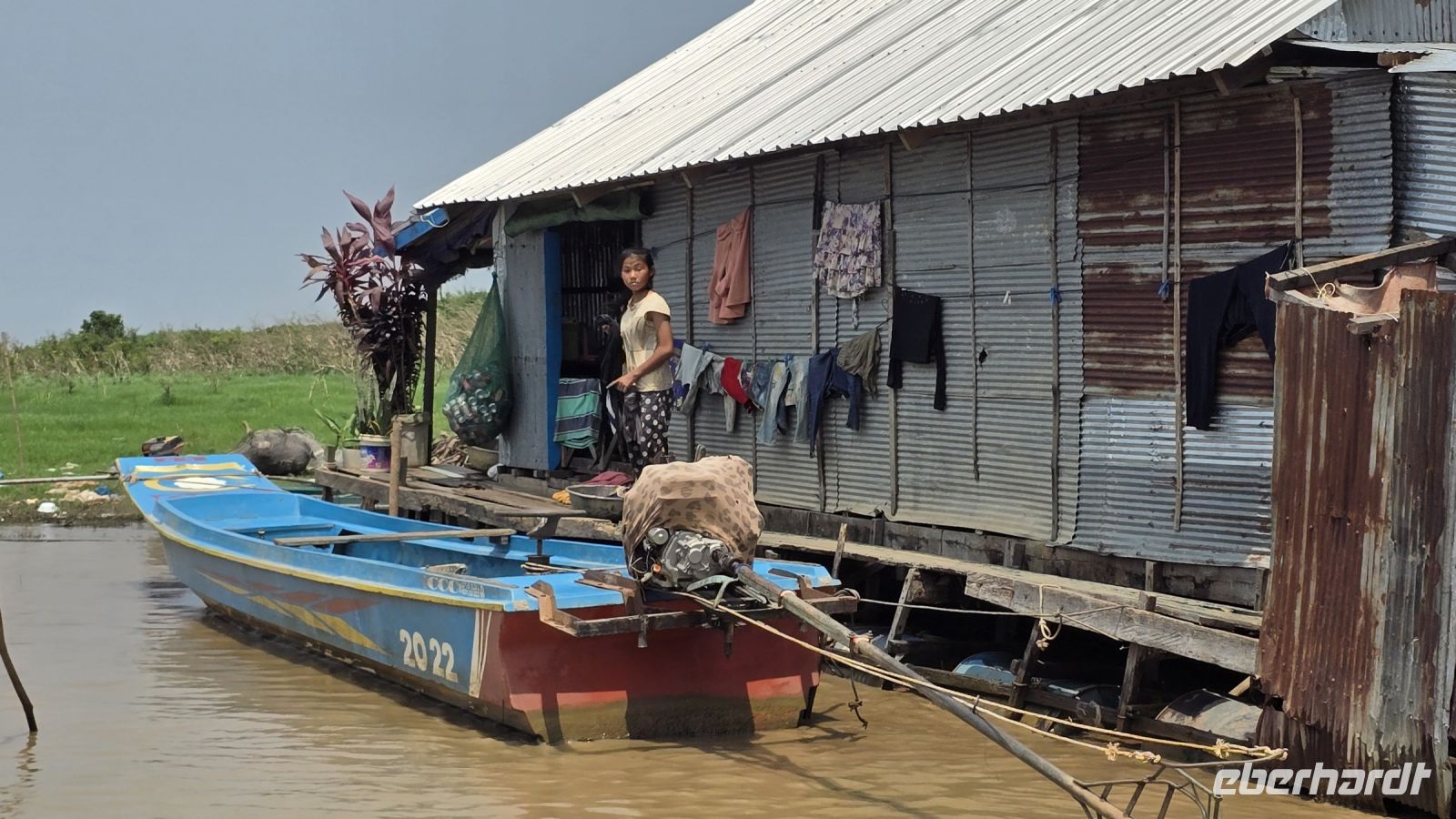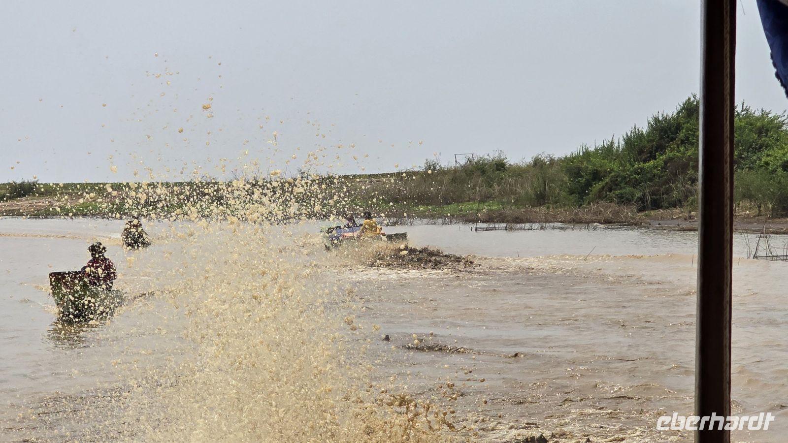 Die junge Frau und ihr kleiner Junge, die uns mit ihrem Boot auf den See hinausfahren, haben mit dem niederen Wasserstand ziemlich zu kämpfen. Immer wieder, laufen wir auf Grund und stecken im Schlamm fest, oder die Schiffsschraube verheddert sich in alten Fischernetzen und sonstigen Müll der sich im Wasser befindet. Wenn die Schiffsschraube mal wieder blockiert ist, dann steigt sie hinten ans Heck und befreit die Motorschraube mit einer Schere von alldem Ballast der sich um sie Schraube herumgewickelt hat. Ich beschließe, dass ich das geplante Trinkgeld für Sie nochmal verdoppeln muss. Sie hat deutlich zu kämpfen um uns trocken über den See zu bringen. Nach einer Weile als wir uns schon wieder auf der Rückfahrt befinden, beginnt ihr kleiner Junge uns eine Nacken- und Rückenmassage zu verabreichen. Ganz ohne Worte geht er von einem zum anderen und gibt jedem gekonnt eine kleine Massage, die die meisten von uns genießen. Ein kleines Trinkgeld dafür nimmt er bescheiden entgegen. Ich denke den Kleinen haben wir ein bisschen ins Herz geschlossen.