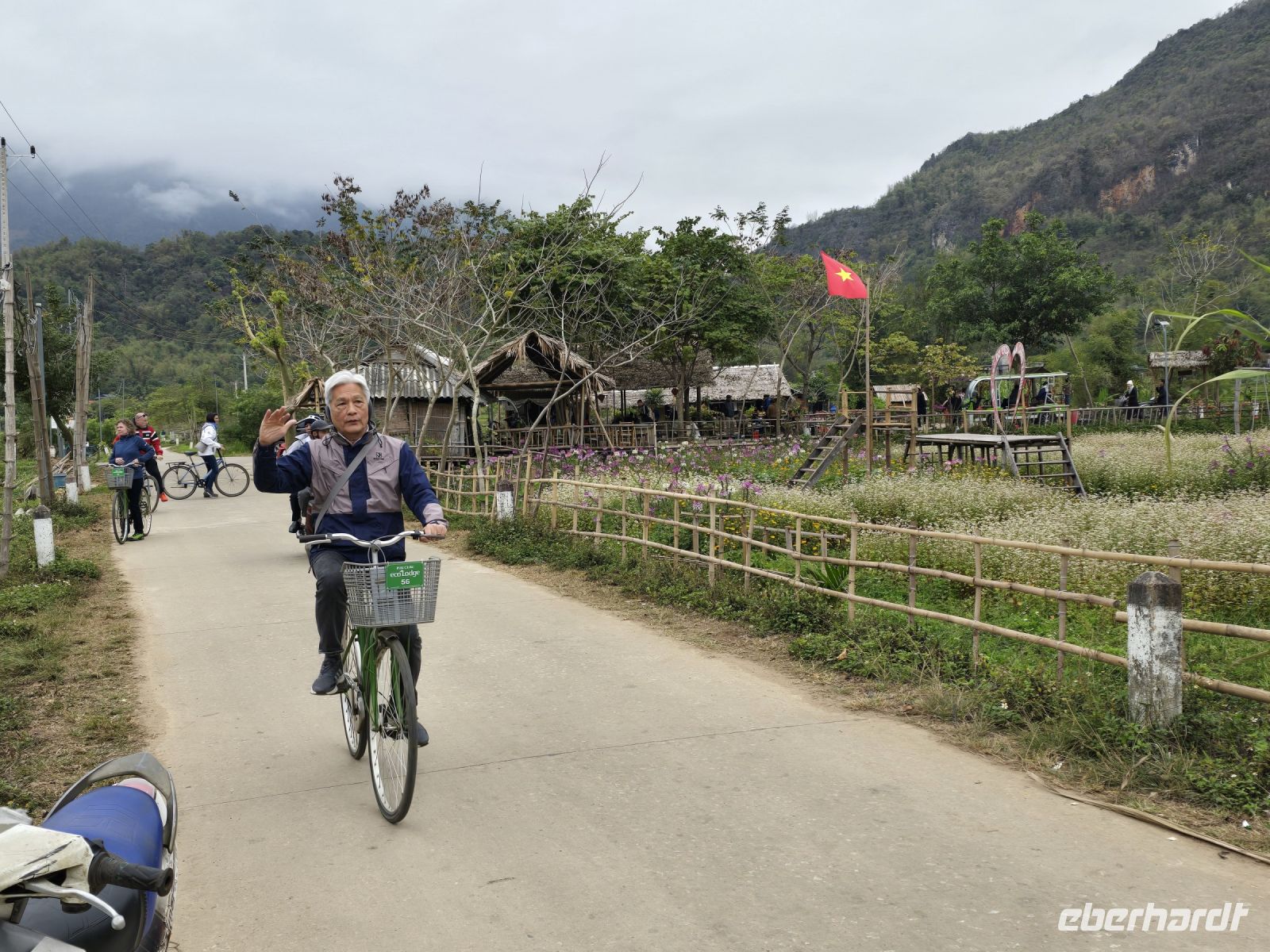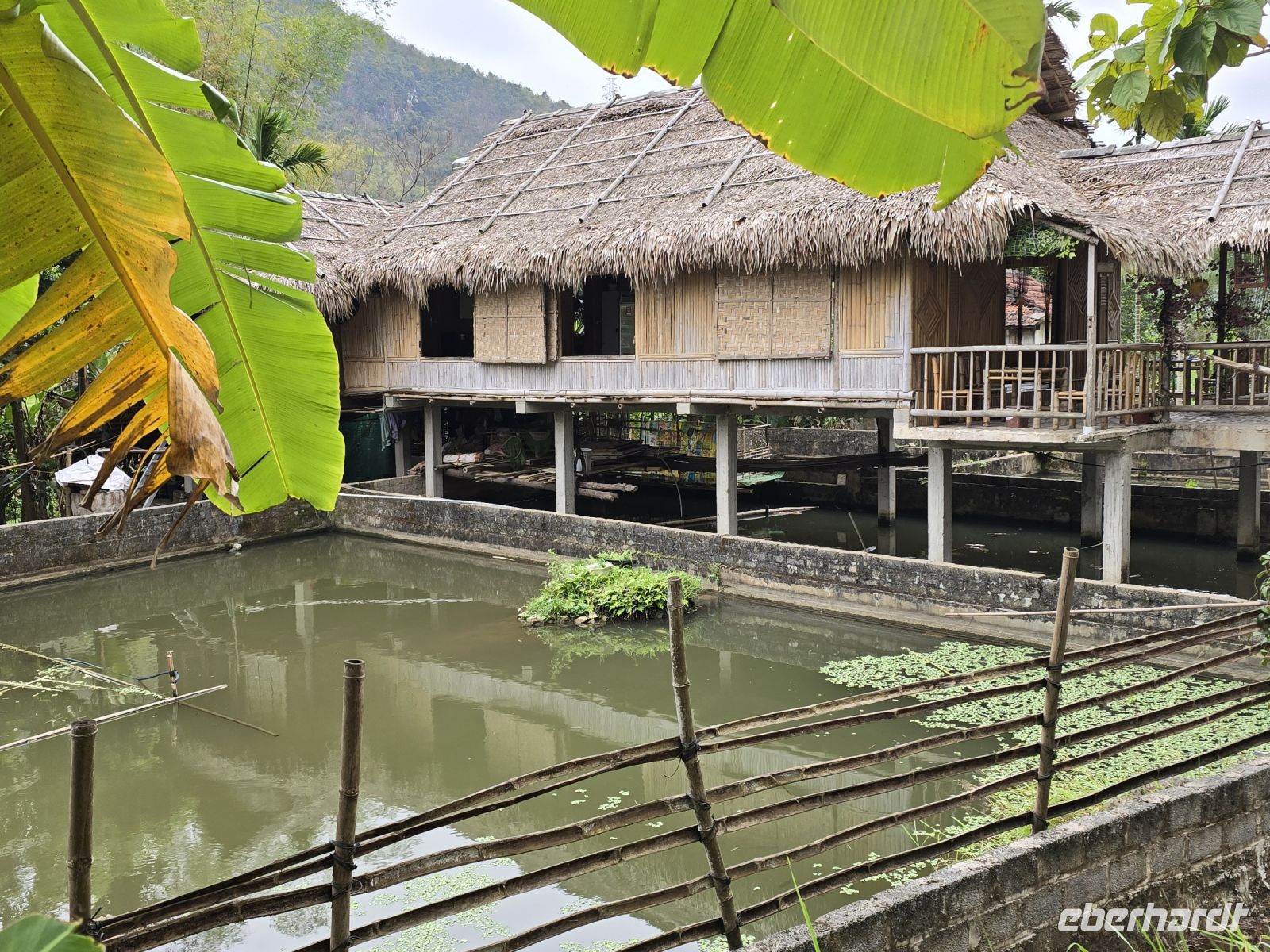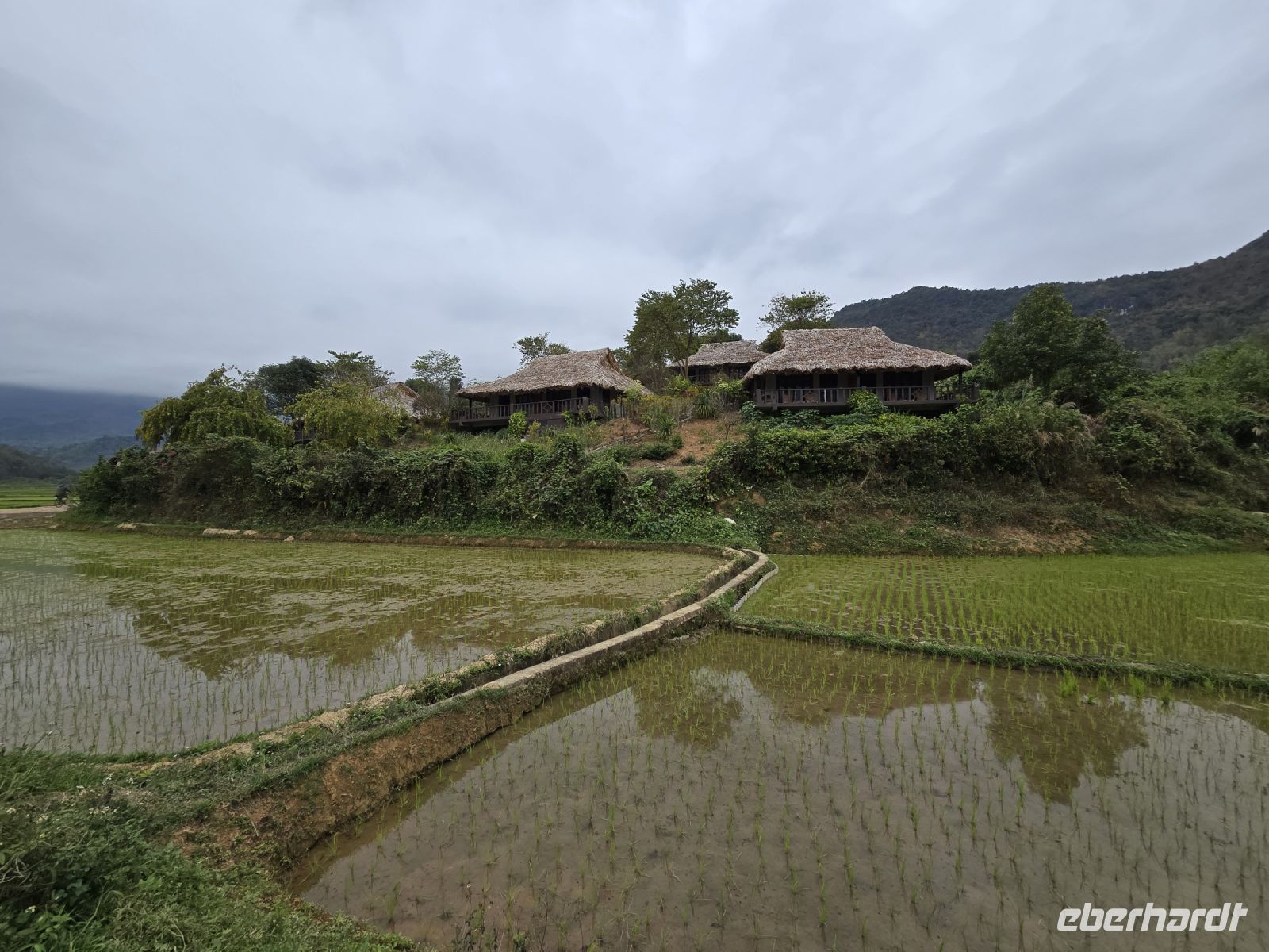Vom Hotel leihen wir uns Fahrräder und erkunden damit die Landschaft um das Hotel herum. Durch die Reisfelder vorbei an den Stelzenhäusern der Bergbewohner, erfreuen wir uns ein den schönen grünen Farben und der Freundlichkeit der Bevölkerung. Die weißen Thai, wie das Volk hier genannt wird, stammen ursprünglich aus Thailand, haben ihren traditionellen Hausbau beibehalten und auch ihre herzliche Freundlichkeit wie man es von Thailand auch kennt. Die Stelzenhäuser erfüllen den Zweck das unter dem Wohnraum ein großer Freiraum entsteht, überdacht und durch den Regen geschützt können hier Vorräte, Werkzeuge und Sitzmöbel platziert werden. Und bei der Regenzeit, wenn das Land teilweise überflutet wird, dann sind die Wohnräume vor dem Wasser sicher.