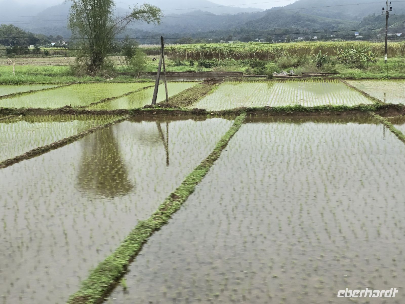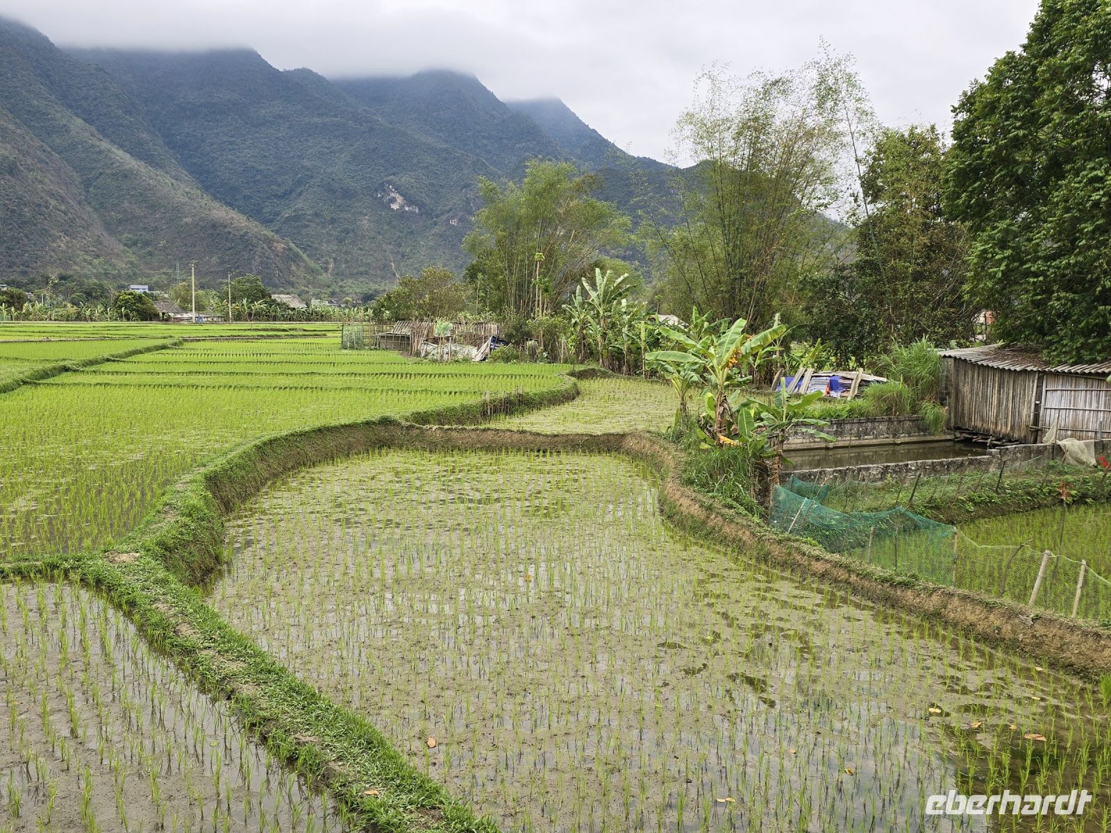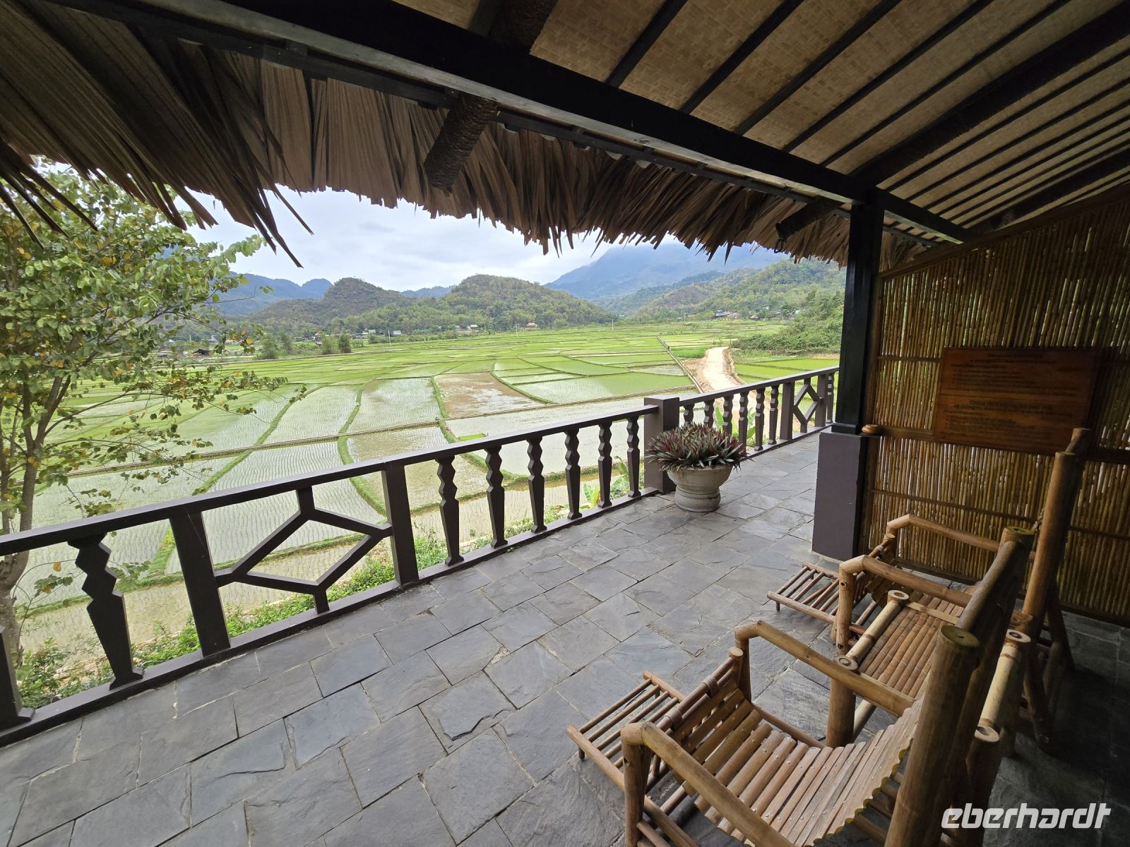 Vom Hotel leihen wir uns Fahrräder und erkunden damit die Landschaft um das Hotel herum. Durch die Reisfelder vorbei an den Stelzenhäusern der Bergbewohner, erfreuen wir uns ein den schönen grünen Farben und der Freundlichkeit der Bevölkerung. Die weißen Thai, wie das Volk hier genannt wird, stammen ursprünglich aus Thailand, haben ihren traditionellen Hausbau beibehalten und auch ihre herzliche Freundlichkeit wie man es von Thailand auch kennt. Die Stelzenhäuser erfüllen den Zweck das unter dem Wohnraum ein großer Freiraum entsteht, überdacht und durch den Regen geschützt können hier Vorräte, Werkzeuge und Sitzmöbel platziert werden. Und bei der Regenzeit, wenn das Land teilweise überflutet wird, dann sind die Wohnräume vor dem Wasser sicher.