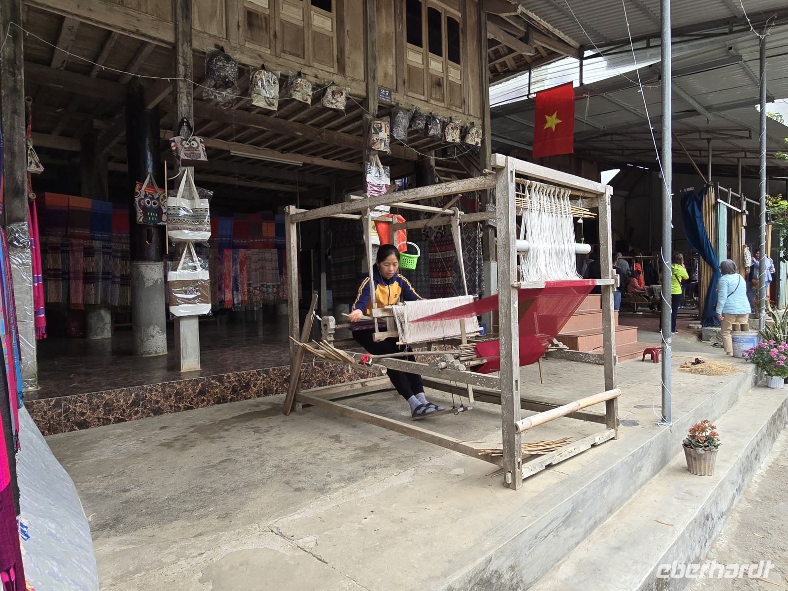 Gegen 12:00 Uhr Mittag kommen wir in der Bergregion Mai Chau an und beschließen, dass wir in einem kleinen regionalen Lokal zu Mittagessen. Zuvor schauen wir noch einige Frauen beim Stoffe weben zu und einige von unserer Gruppe nehmen gern ein paar Geschenke mit und unterstützen damit die Bergbevölkerung.