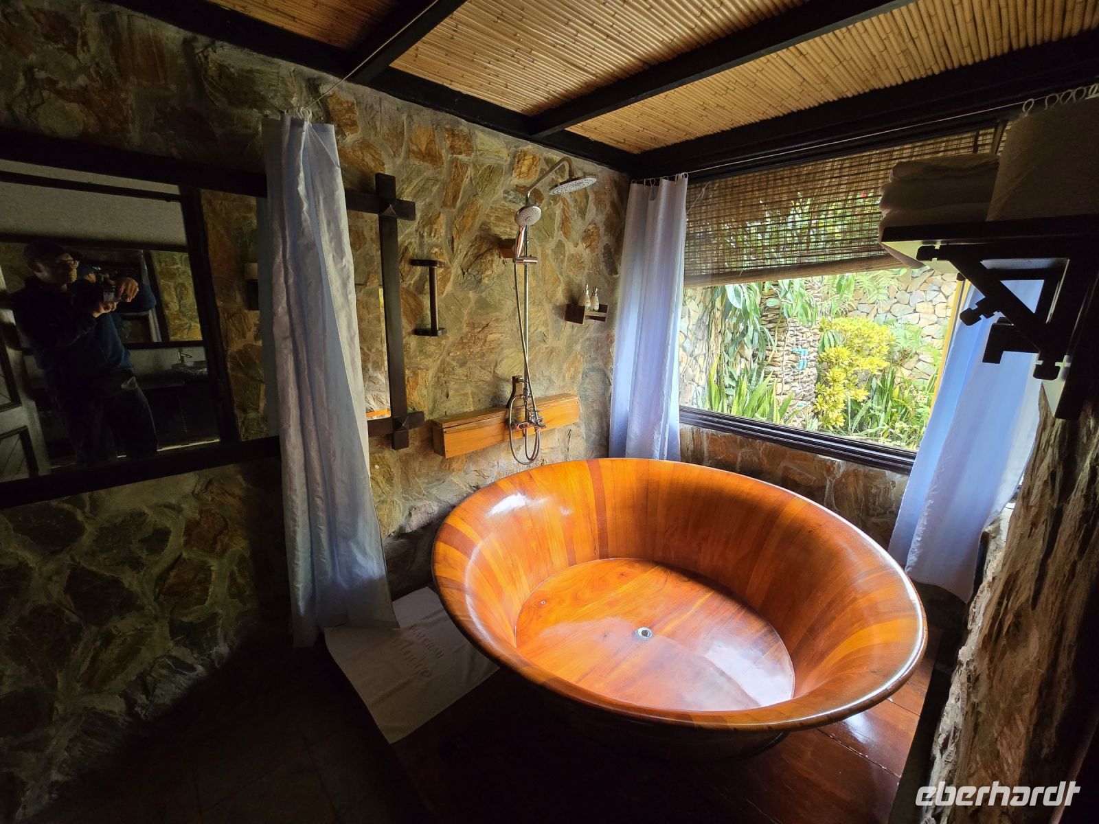Nach dem Essen fahren wir in unser Hotel, es ist diesmal eine Ecolodge das in einem Hügel über den Reisfeldern angesiedelt ist. Die Zimmer sind sehr großzügig und phantasiereich gestaltet, das Badezimmer ist groß, hat einen Zugang zu einer Duschterrasse und ist dominiert von einer kreisrunden, aus Holz geformten, Badewanne.