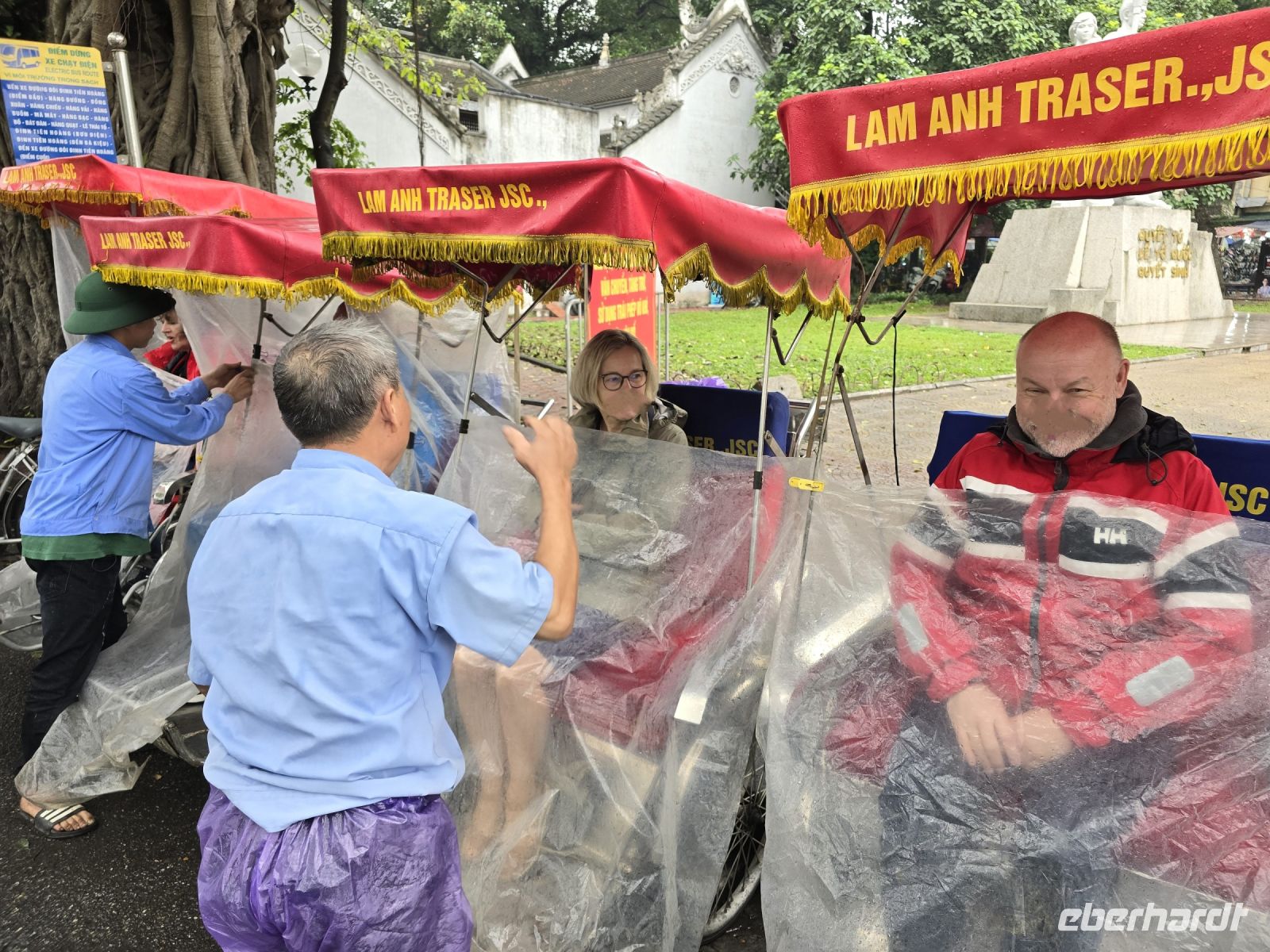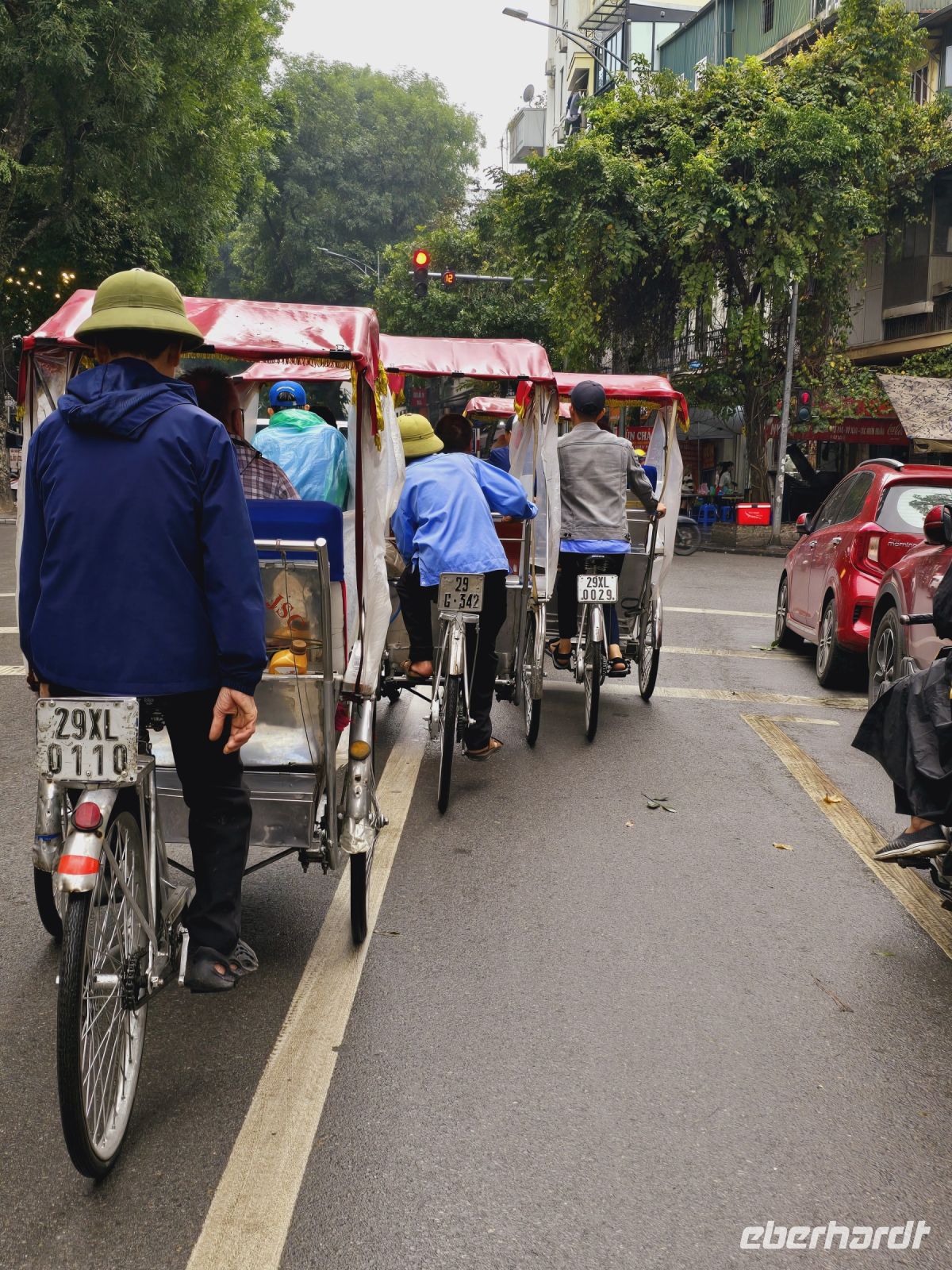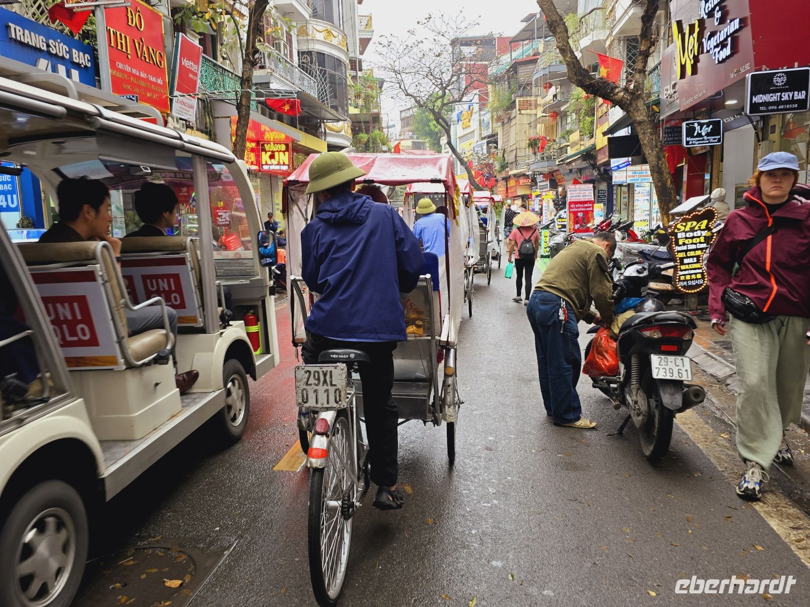 Wir sind alle ein bisschen müde vom Nachtflug, deshalb wollen wir heute gleich mal etwas Witziges Unternehmen. Wir mieten uns 20 Fahrrad Rikscha und lassen uns damit durch die Altstadt kutschieren. Von diese Perspektive wird es einem ganz Angst und Bange, wir sind die Fahrweise, das dichte Durchschlängeln zwischen Autos, Fahrradfahrern, Moped und Fußgängern hat man hier ganz dicht vor Augen. Außerdem ist es uns bewusst, dass die dreirädrigen Rikscha ganz schnell umfallen würden, wenn einer der Verkehrsteilnehmer uns tuschiert. Die Altstadt von Hanoi ist wie ein Bienennest. Auf den Straßen summen die Motorroller, die Mopeds und an den Häuserfassaden reihen sich die kleinen Shops, Werkstätten und Garküchen in großer Anzahl auf.
