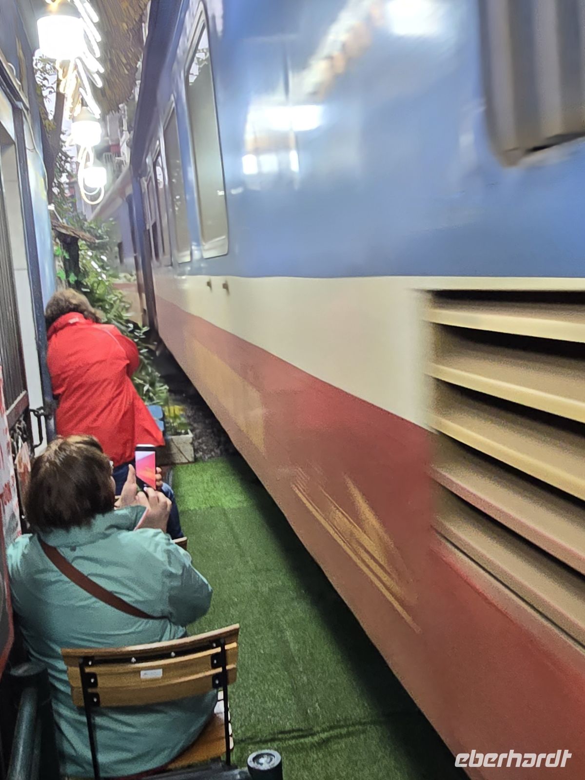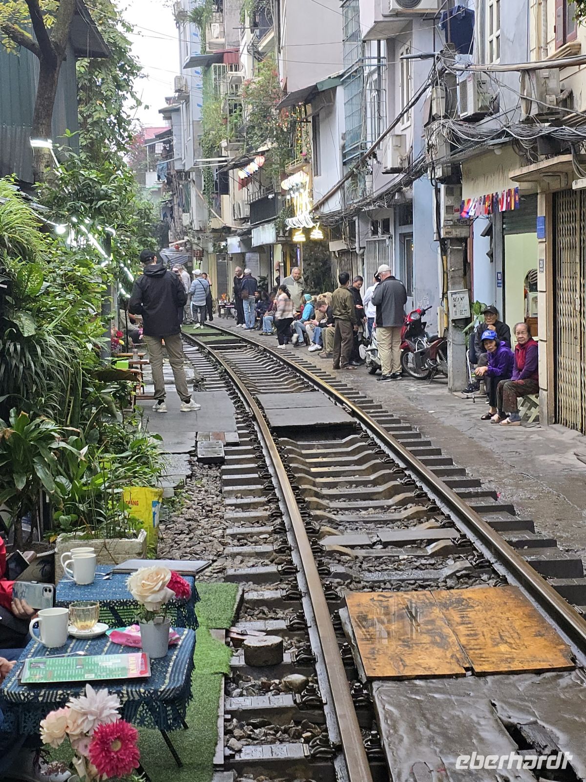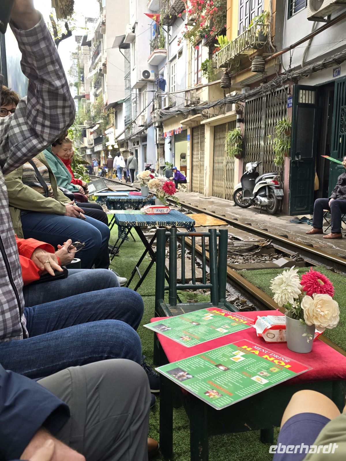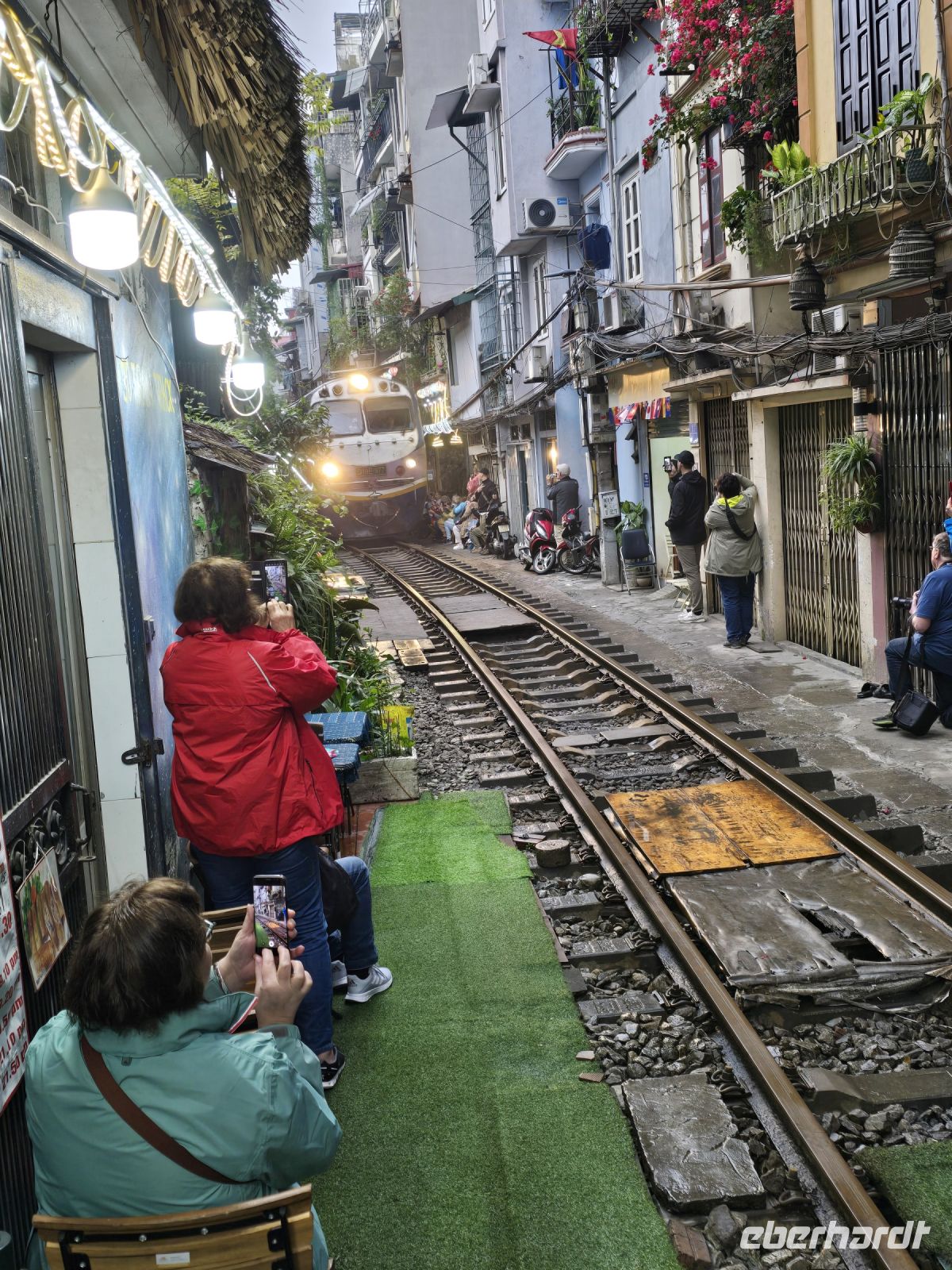 Ein weiteres Highlight bietet uns der Besuch der Strecke des Street Trains, der sich mitten durch die Gassen von Hanoi schlängelt. Ursprünglich wurde die Bahnstrecke von der französischen Besatzungsmacht in der Kolonialzeit gebaut, später haben denn die Anwohner ihre Häuser immer dichter an die Gleise gebaut. Heute reihen sich zusätzlich noch kleine Cafés entlang der Bahngleise. Kleine Tische stehen vor den Cafés, aber so eng dass man beim Sitzen aufpassen muss, dass nicht die Zehenspitzen auf die Gleise ragen oder dass mein sonst irgendwie vom Zug gestreift wird. Es hat an dieser Strecke, in den kleinen Gassen schon mehrere Tote und Verletzte gegeben, meist dann wenn Touristen vor lauter Begeisterung nach dem besten Foto nicht beachten wie breit der Zug ist und wie dicht er am Körper vorbei fährt. Eigentlich hat die Polizei in Hanoi den Aufenthalt auf den Gleisen und den Betrieb der kleinen Cafés verboten, aber ganz typisch für Vietnam sind die vielen Ausnahmen und die kreativen Wege um doch, zumindest zeitweise, das Spektakel zu beobachten zu können. Unser Reiseleiter Chau hat sich Mühe gegeben eine Café zu finden, dass wir mit unserer großen Gruppe besuchen können und trotzdem einigermaßen sicher tolle Fotos vom vorbeifahrenden Zug zu machen. Es war wirklich spektakulär, wie der mächtige Zug rasant zwischen den Häuser durchschlängelt und ich dachte nicht das der Zug so nah an uns herankommt und wie weit er über die Gleise hinausragt.
