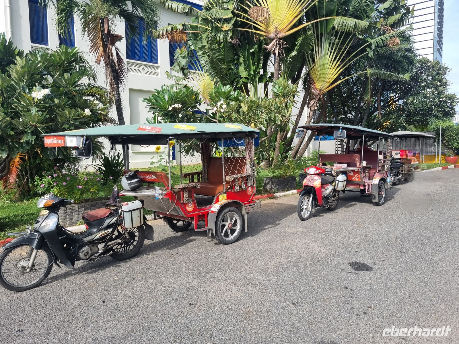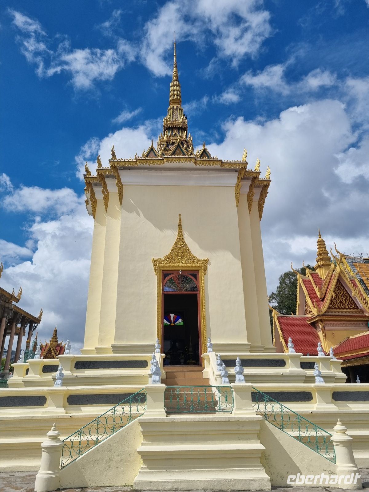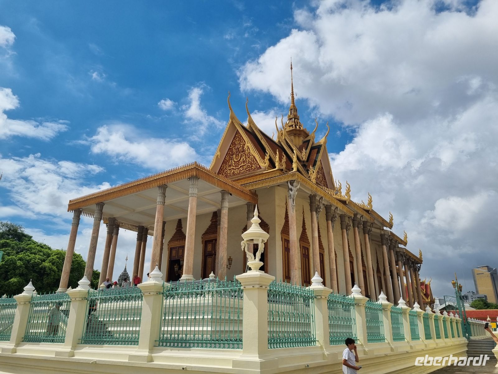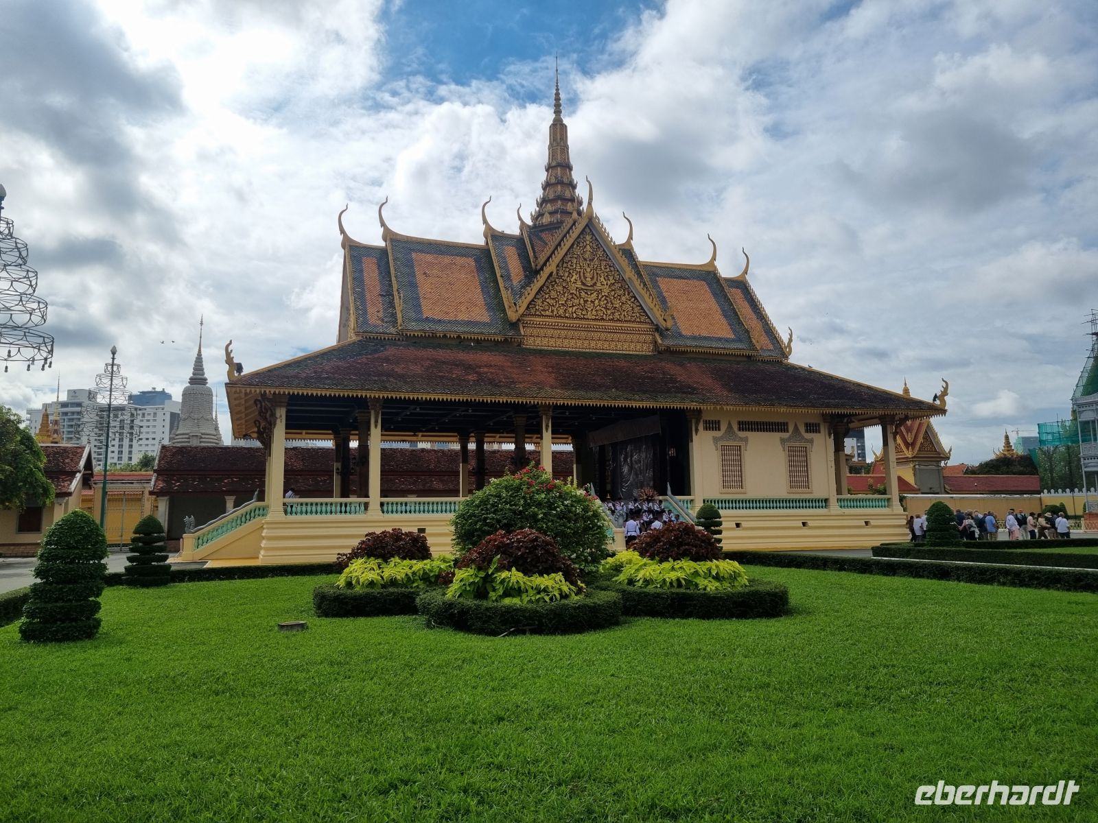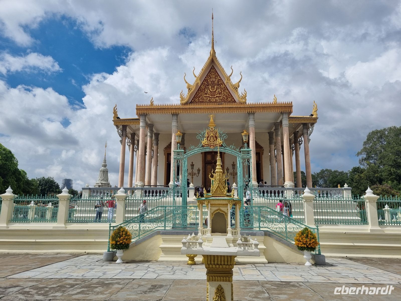 Der Tag begann sehr früh mit einem Frühstück im Hotel. Bereits kurz danach fuhren wir nur eine kleine Strecke zur Bootsanlegestelle in Châu Đốc, wo unser Gepäck verladen wurde. Anschließend setzten wir unsere Reise mit einem Speedboot fort. Die Fahrt führte uns rund eine Stunde lang einen Seitenarm des Mekong-Flusses hinauf, vorbei an kleinen Dörfern, schwimmenden Häusern und üppig grünen Uferlandschaften. Schließlich erreichten wir die vietnamesisch-kambodschanische Grenze, wo die Ausreiseformalitäten auf vietnamesischer Seite begannen. Nachdem wir offiziell aus Vietnam ausgereist waren, stiegen wir bereits nach weiteren fünf Minuten Fahrtzeit erneut aus dem Boot aus, um bei den Grenzbeamten unser Visum zu erhalten und damit nach Kambodscha einreisen zu können. Die Formalitäten zogen sich etwas hin, doch unser Bootsguide kümmerte sich um sämtliche organisatorische Details, sodass wir nichts weiter tun mussten, als geduldig zu warten. Nachdem schließlich alles erledigt war, ging es wieder an Bord. Für weitere gut drei Stunden fuhren wir nun weiter stromaufwärts auf dem Mekong, bis wir gegen Mittag Phnom Penh erreichten. Schon von der Wasserseite aus bot sich uns ein beeindruckender Blick auf die Skyline der Stadt – ein spannender erster Eindruck der kambodschanischen Hauptstadt. Am Bootsanleger wurden wir herzlich von unserer örtlichen Reiseleiterin Frau Phu Samnang empfangen. Gemeinsam mit ihr fuhren wir zunächst ins Hotel, um uns etwas frisch zu machen und kurz auszuruhen. Am Nachmittag unternahm der Großteil unserer Gruppe eine Tuk-Tuk-Tour durch die Straßen der Stadt. Auf diese Weise bekamen wir einen ersten Eindruck vom lebhaften Treiben Phnom Penhs – eine Mischung aus kolonialer Architektur, modernen Neubauten, geschäftigen Märkten und unzähligen Mopeds. Wir besuchten unter anderem den Russenmarkt, das neue Bahnhofsgebäude sowie das altehrwürdige Postamt.