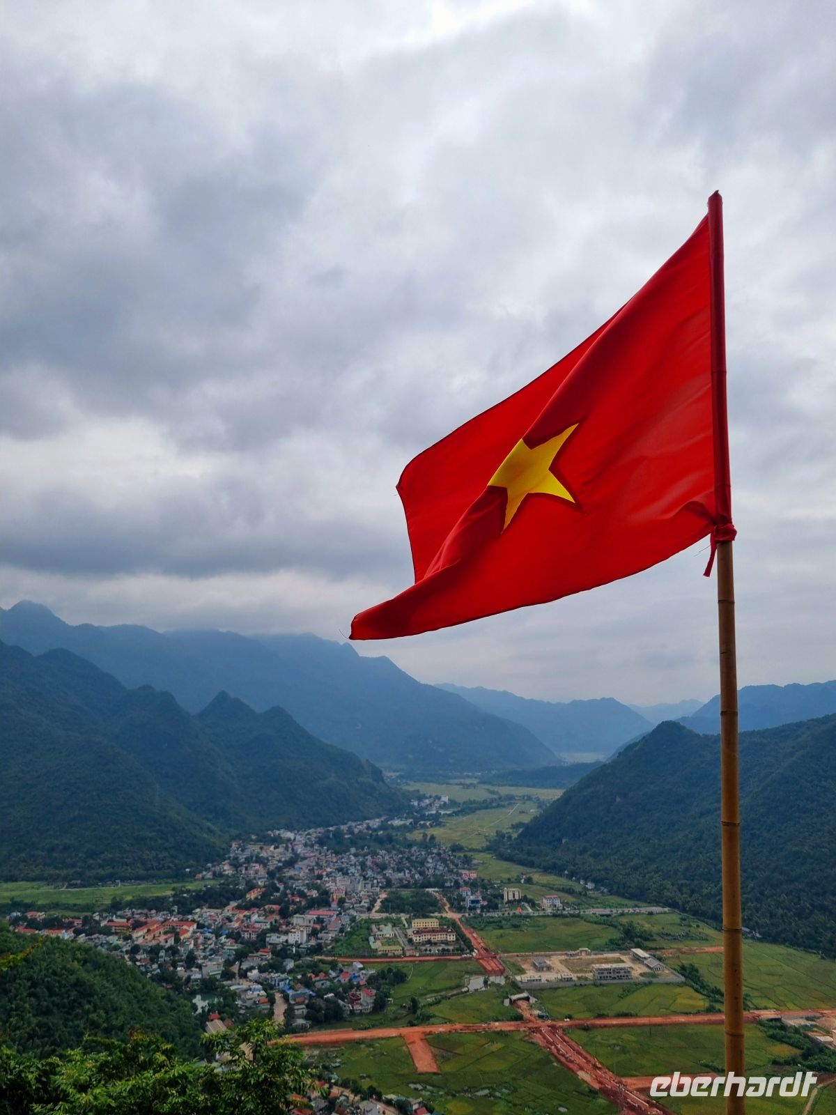 Am Morgen startete unsere etwa dreistündige Busfahrt von Ninh Binh nach Mai Chau. Schon kurz nach der Abfahrt öffnete sich vor uns eine beeindruckende Landschaft – endlose Felder, in denen der Reis in sattem Grün leuchtete. Immer wieder passierten wir kleine Dörfer, in denen das Leben gemächlich seinen Lauf nahm. Die Strecke führte uns schließlich über den Thung Khe Pass, eine kurvenreiche Straße, die sich hoch in die Berge windet. Oben angekommen bot sich ein atemberaubender Aussichtspunkt – der Blick weit hinunter ins Mai Chau-Tal war schlicht überwältigend. Die grünen Reisfelder, die strohgedeckten Häuser und die sanften Hügel formten ein friedliches Panorama, das uns sofort in seinen Bann zog. Gegen Mittag erreichten wir das