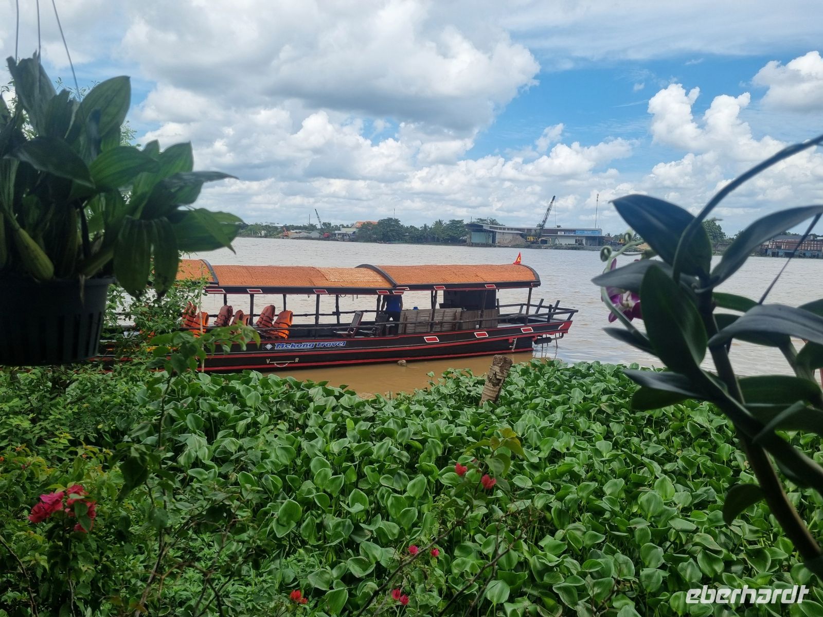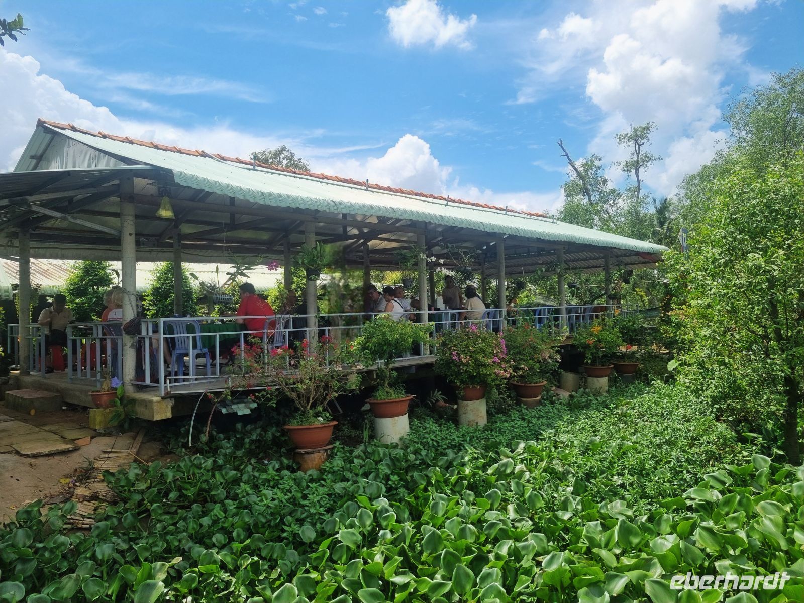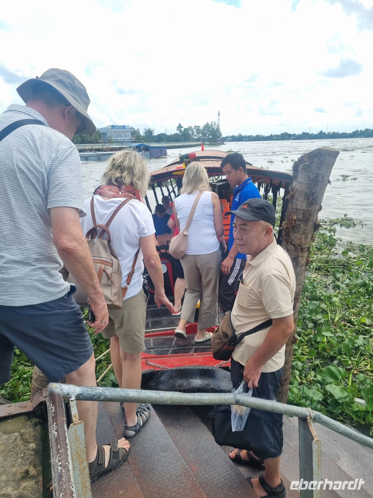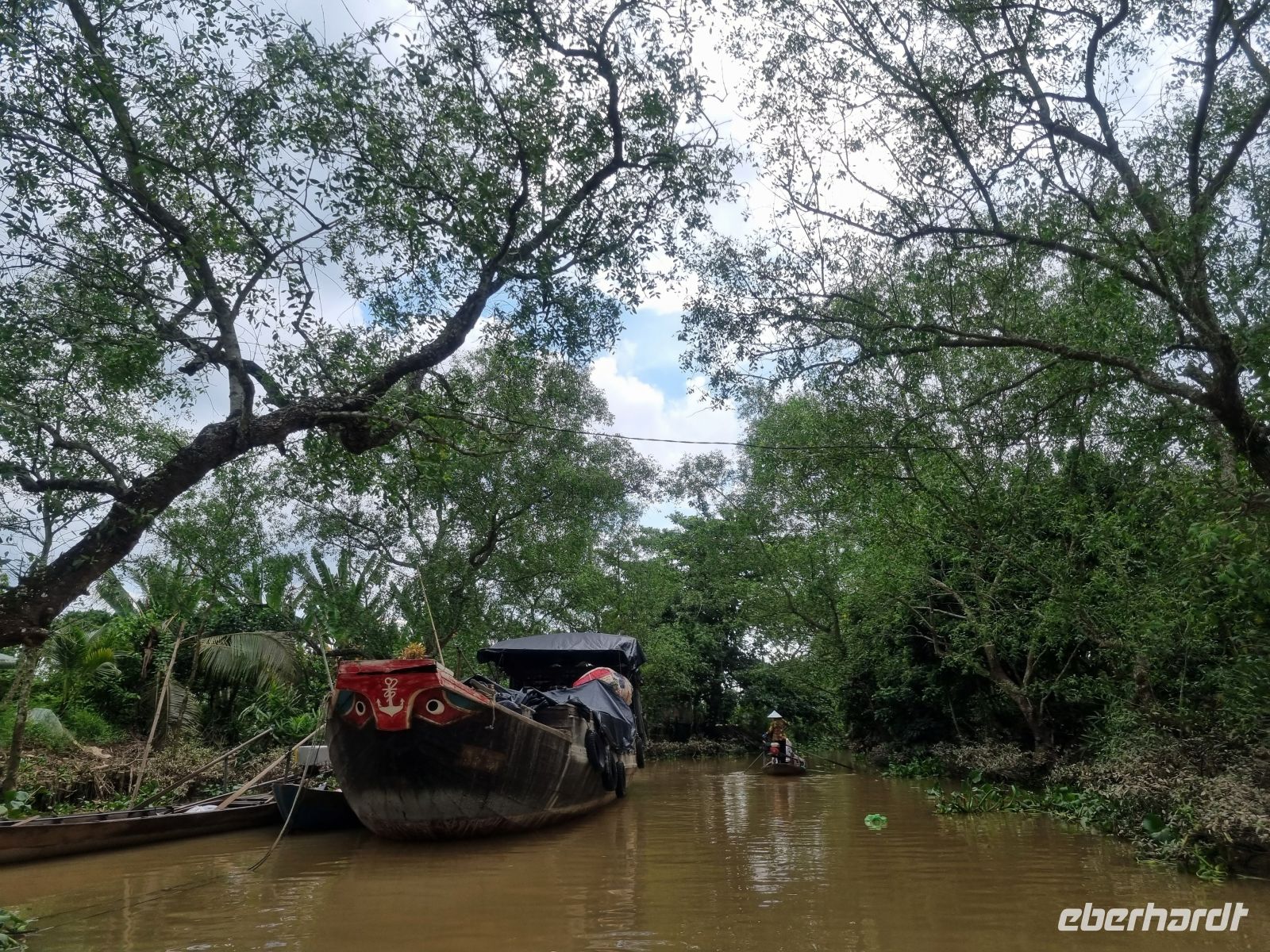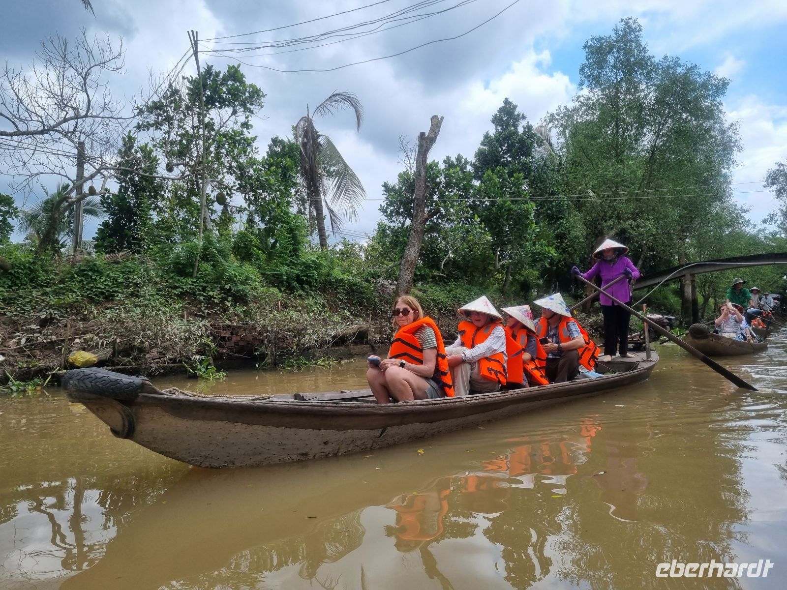 Göttin der Seefahrerinnen gewidmet ist. Zwischen unzähligen Räucherspiralen und kunstvollen Holzschnitzereien herrschte eine friedliche, fast mystische Atmosphäre. Anschließend setzten wir unsere Fahrt mit dem Bus in Richtung Mekong-Delta fort. Nach einer knapp zweistündigen Fahrt erreichten wir den Ort Cai Be, wo wir ein überdachtes Boot bestiegen, um unseren Ausflug im weitverzweigten Delta zu beginnen. Es war sehr warm, und hin und wieder zeigte sich sogar die Sonne – welch ein Glück! Während unserer Bootstour legten wir mehrere Stopps ein. Besonders schön war der Aufenthalt auf der Insel Tan Phong, wo uns Einheimische mit frischem, süßem Obst bewirteten und ein kleines, charmantes Kulturprogramm mit traditioneller Musik darboten. Wenig später stiegen wir in kleine Ruderboote um und glitten für etwa 40 Minuten durch enge Kanäle, vorbei an üppigen Mangrovenwäldern und tropischer Vegetation. Die Szenerie war unglaublich idyllisch – fast ein wenig wie im Spreewald, nur eben mit Palmen statt Birken.