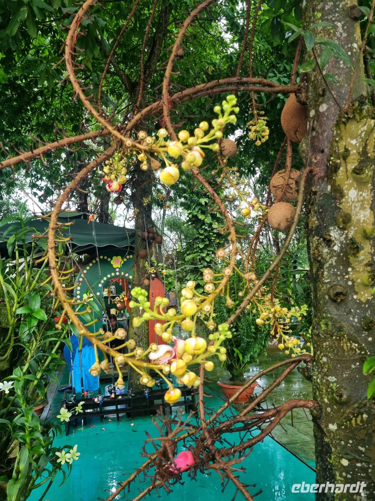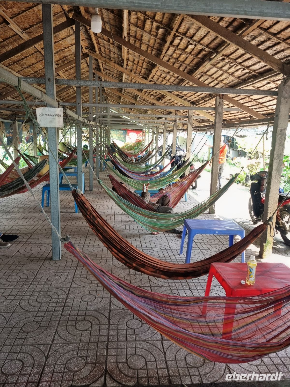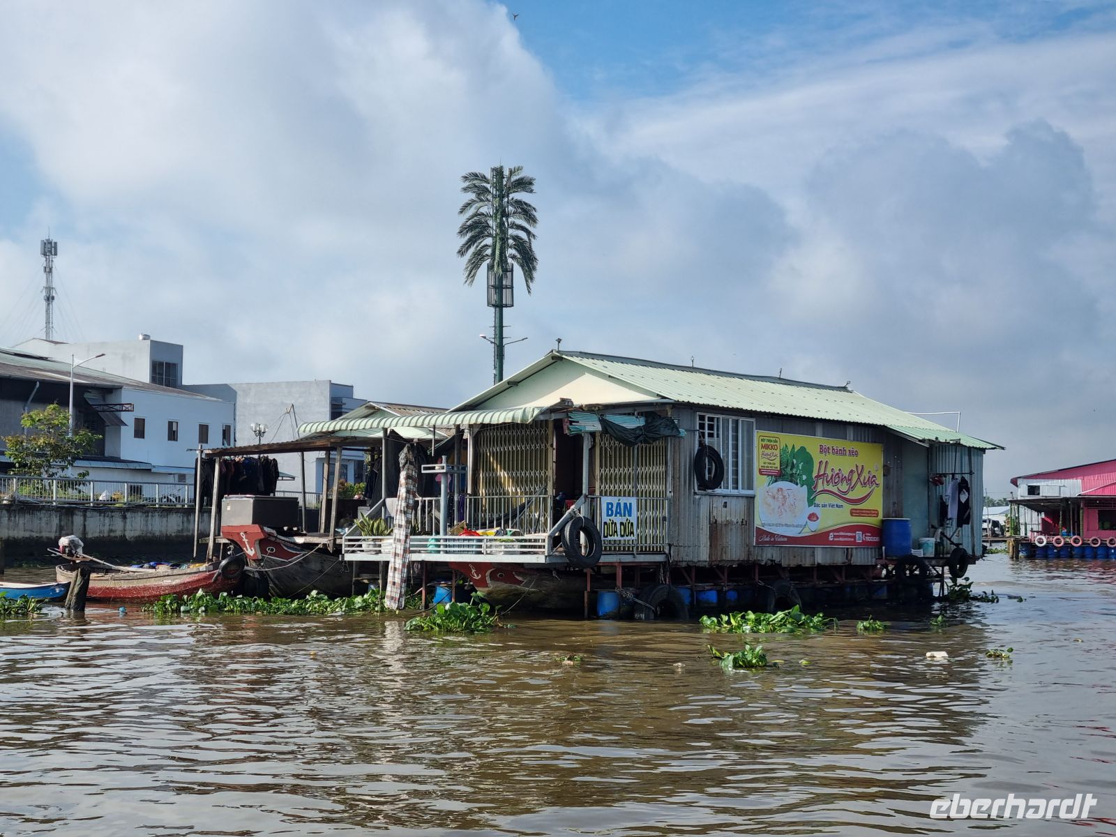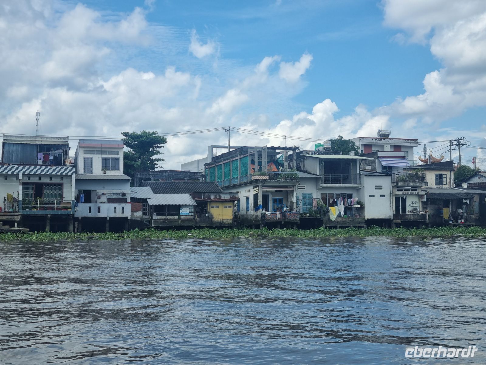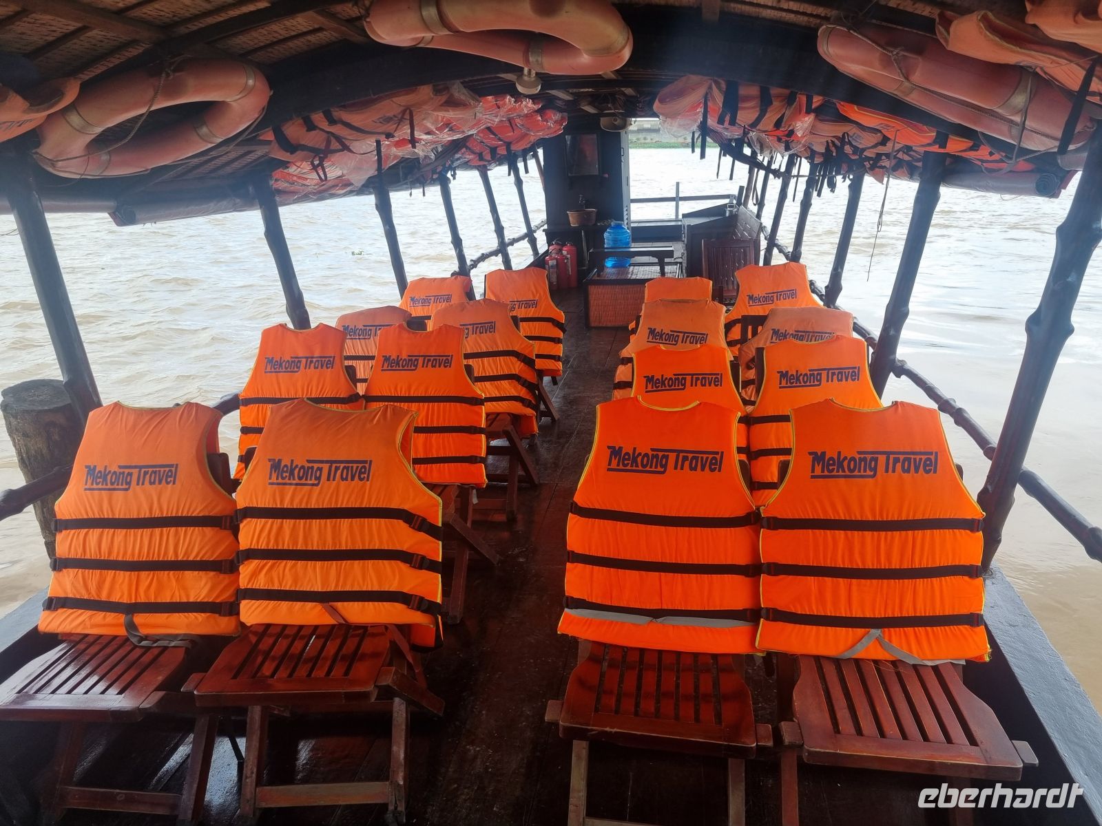 Göttin der Seefahrerinnen gewidmet ist. Zwischen unzähligen Räucherspiralen und kunstvollen Holzschnitzereien herrschte eine friedliche, fast mystische Atmosphäre. Anschließend setzten wir unsere Fahrt mit dem Bus in Richtung Mekong-Delta fort. Nach einer knapp zweistündigen Fahrt erreichten wir den Ort Cai Be, wo wir ein überdachtes Boot bestiegen, um unseren Ausflug im weitverzweigten Delta zu beginnen. Es war sehr warm, und hin und wieder zeigte sich sogar die Sonne – welch ein Glück! Während unserer Bootstour legten wir mehrere Stopps ein. Besonders schön war der Aufenthalt auf der Insel Tan Phong, wo uns Einheimische mit frischem, süßem Obst bewirteten und ein kleines, charmantes Kulturprogramm mit traditioneller Musik darboten. Wenig später stiegen wir in kleine Ruderboote um und glitten für etwa 40 Minuten durch enge Kanäle, vorbei an üppigen Mangrovenwäldern und tropischer Vegetation. Die Szenerie war unglaublich idyllisch – fast ein wenig wie im Spreewald, nur eben mit Palmen statt Birken.