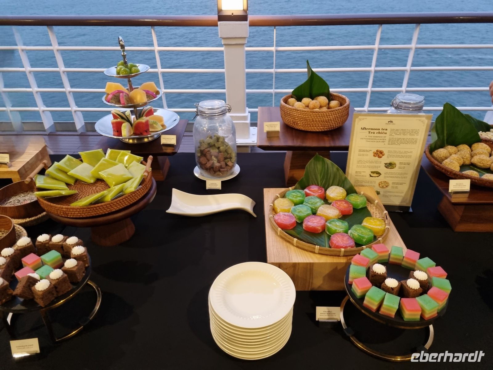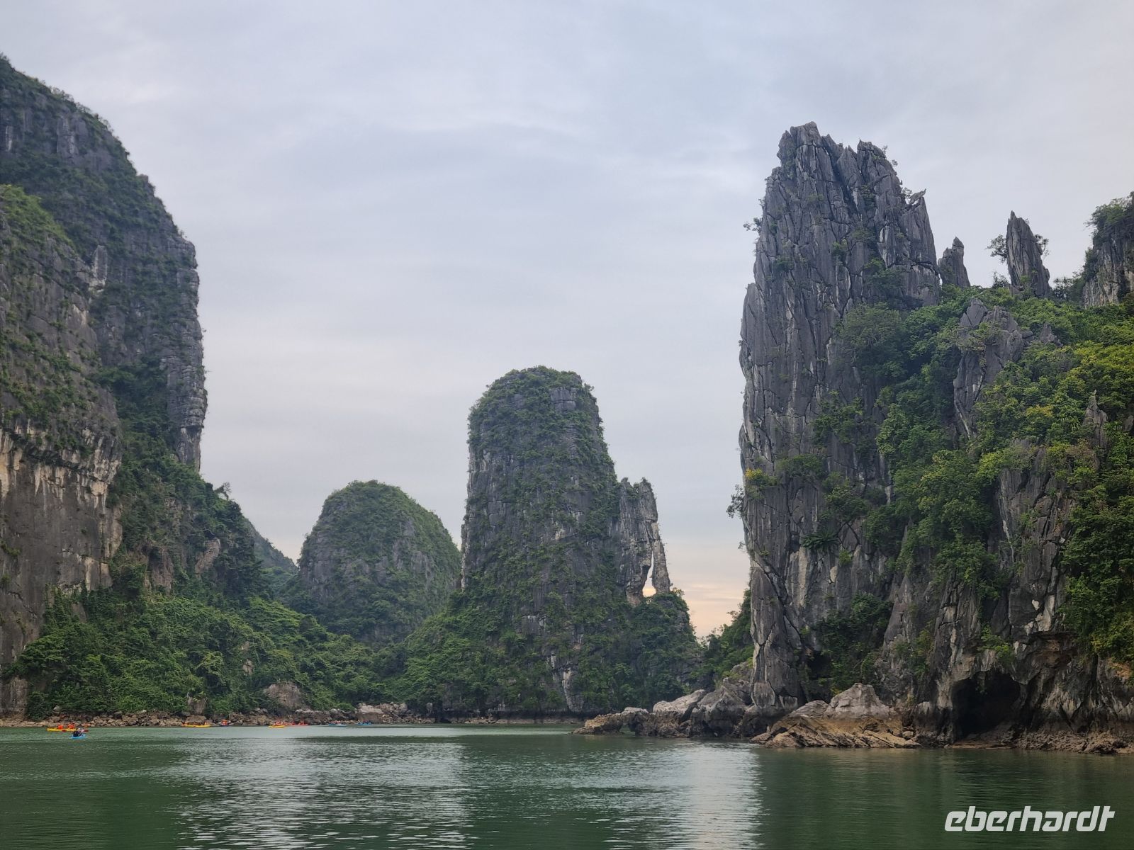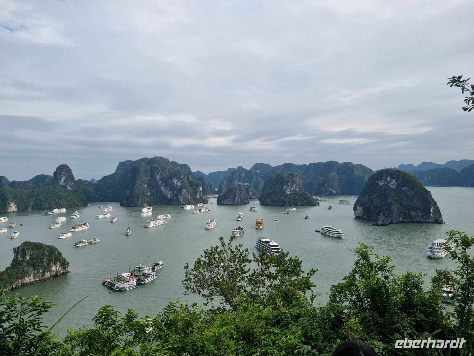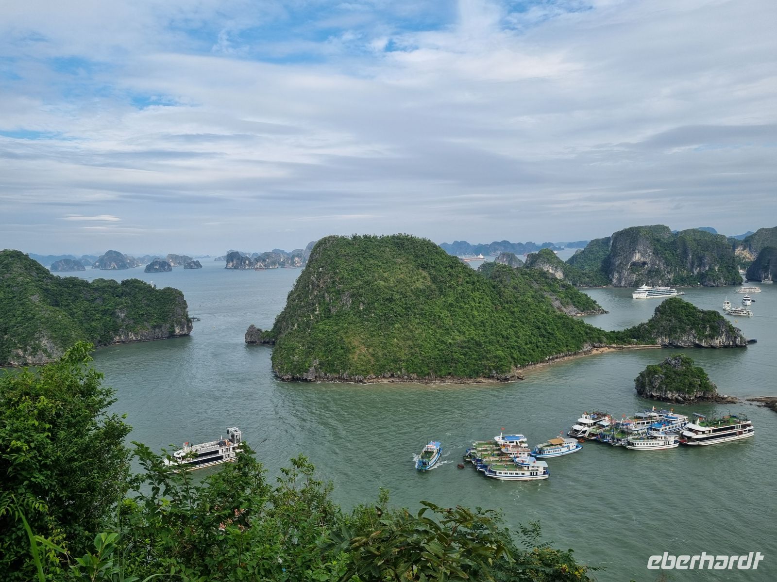 Der Tag begann mit recht kühlem Wetter – etwa 20 Grad und einem frischen Wind, der an einen frühen Herbsttag erinnerte. Am Morgen starteten wir mit dem Bus in Richtung Osten, vorbei an der geschäftigen Hafenstadt Hải Phòng, bis wir schließlich Halong erreichten. Unser erster Stopp dort war das Juweliergeschäft Legend Pearl, wo wir interessante Einblicke in die Kunst der Perlenzucht erhielten. Die Erklärungen zur Herstellung und Verarbeitung der edlen Schmuckstücke waren sehr anschaulich und vermittelten einen Eindruck von der Sorgfalt, die hinter jeder einzelnen Perle steckt. Anschließend setzten wir unsere Fahrt fort zur Insel Tuan Chau, wo die Einschiffung auf unser modernes Schiff, die „Paradise Legacy“, erfolgte. Die Crew begrüßte uns herzlich an Bord, und der Manager stellte das Programm für die kommenden Stunden vor. Gleich darauf genossen wir ein hervorragendes Mittagessen mit Schwerpunkt auf frischen Meeresfrüchten – ein absolutes Highlight, geschmacklich wie auch optisch. Gestärkt begann am Nachmittag das Ausflugsprogramm. Mit dem Tenderboot ging es hinüber zur Insel Ti Top, die sich allerdings als wahrer Touristenmagnet entpuppte – Menschen über Menschen, kaum ein ruhiger Moment. Wer wollte, konnte im rund 28 Grad warmen Wasser am kleinen Sandstrand baden oder den Aufstieg über mehr als 400 Stufen zum Aussichtspunkt wagen. Oben bot sich ein grandioser Blick über die bizarren Felsen und Inseln der Halong-Bucht – ein wirklich eindrucksvolles Panorama, das die Mühe des Aufstiegs lohnte.