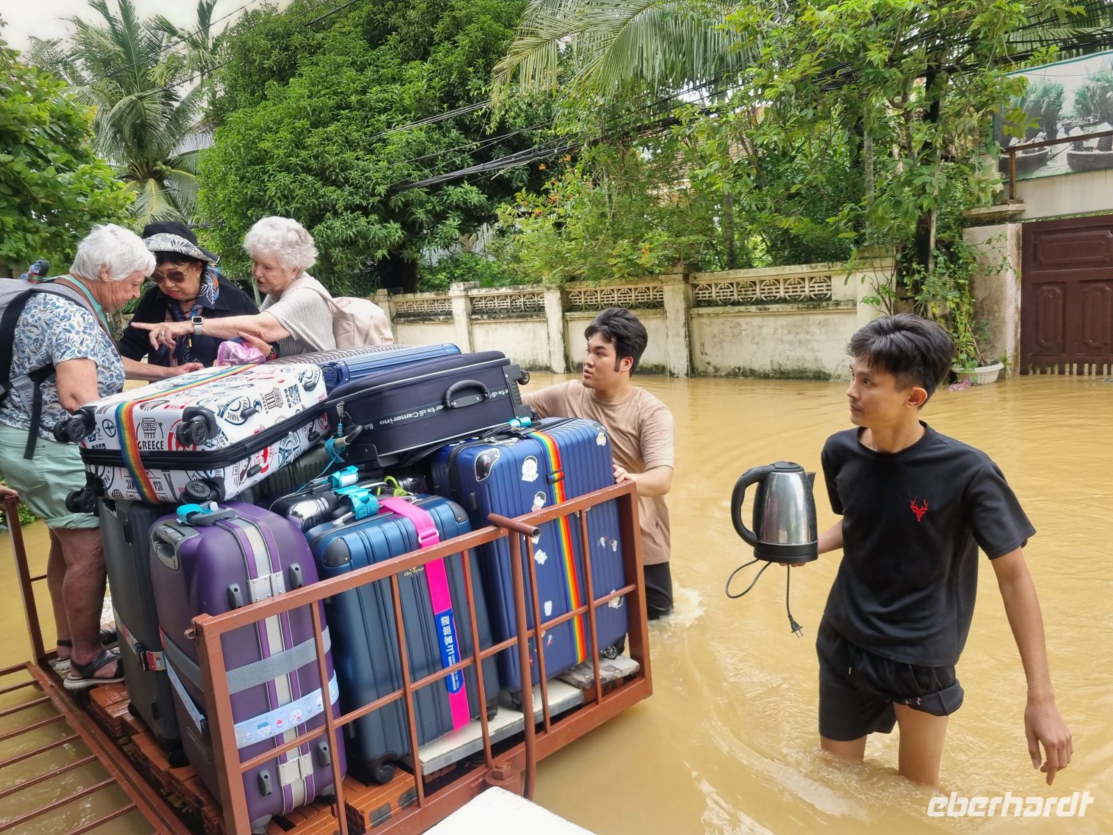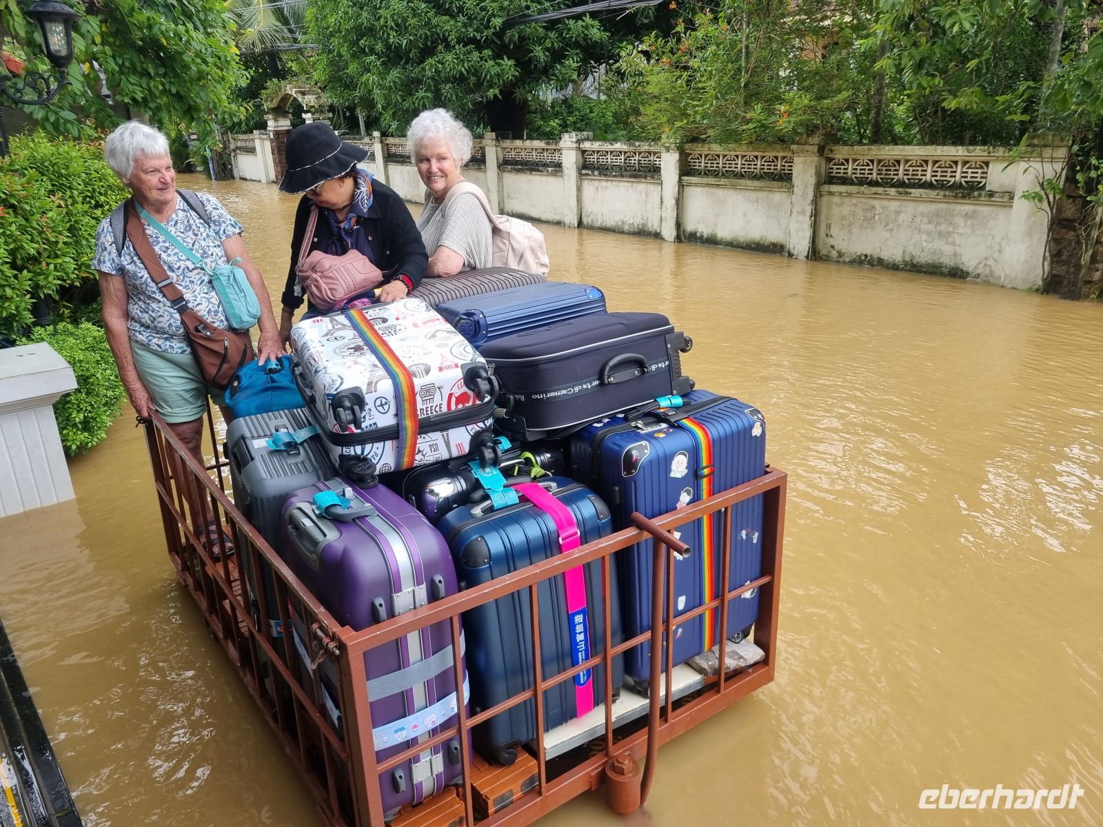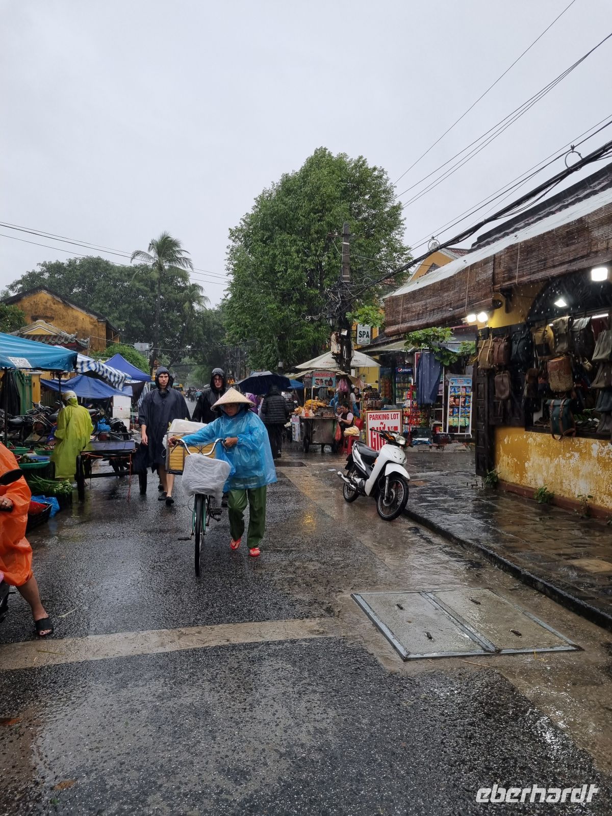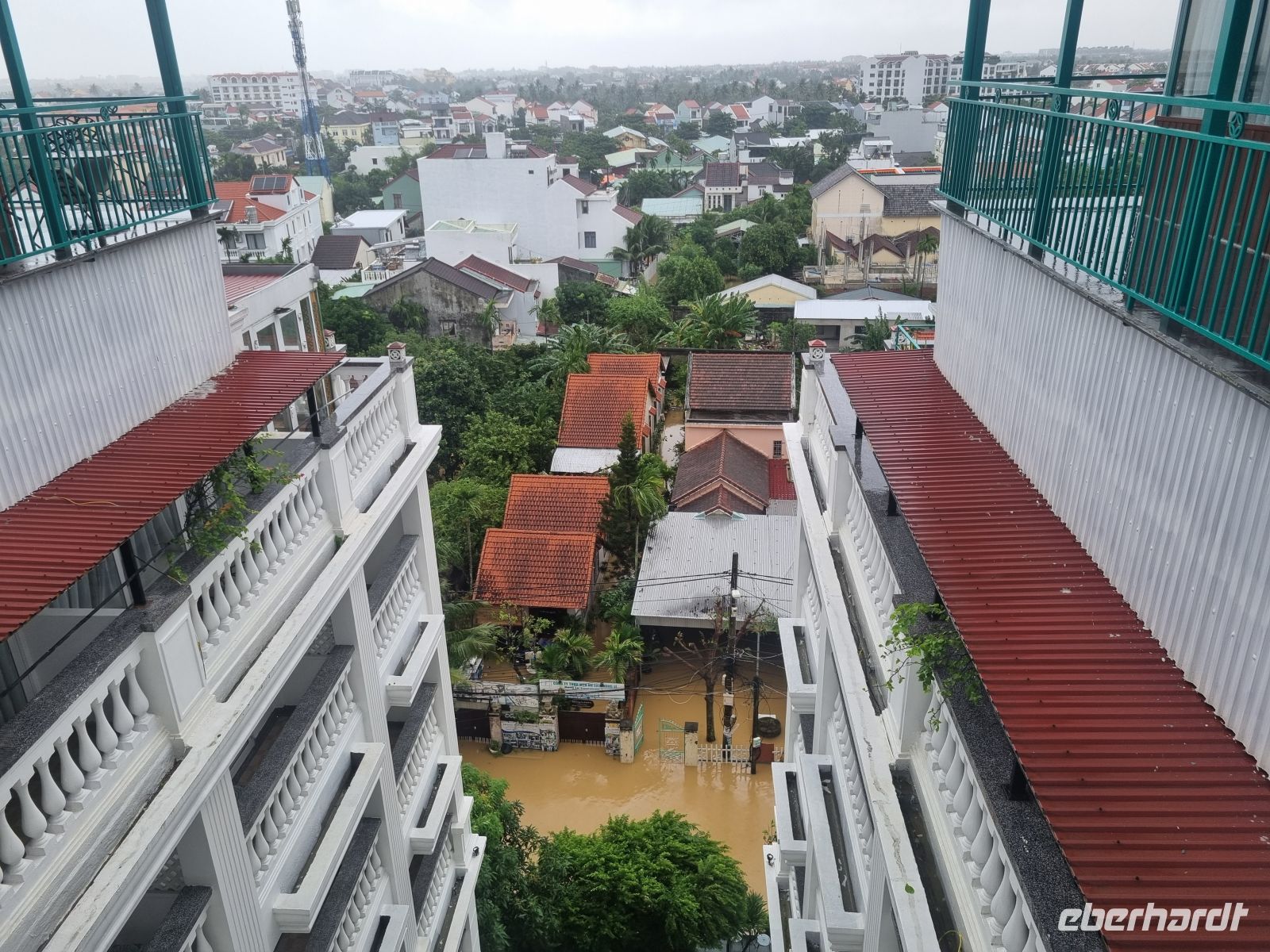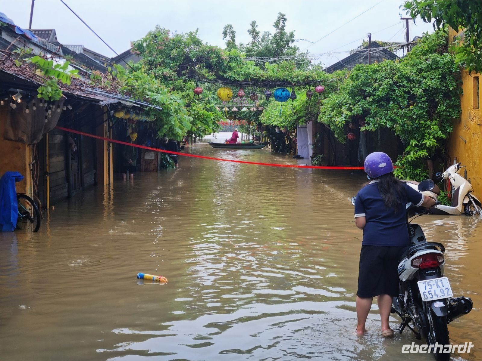 Leider mussten wir den heutigen Tag unfreiwillig im Hotel verbringen. Der Regen hatte über Nacht noch zugenommen, und die Lage in Hoi An spitzte sich weiter zu. Es gab keinerlei Möglichkeit, das Hotel zu verlassen – überall in den Straßen stand das Wasser inzwischen bis an die Knie. Selbst vor dem Hoteleingang hatten sich große Pfützen und Strömungen gebildet, die ein Verlassen des Gebäudes unmöglich machten.