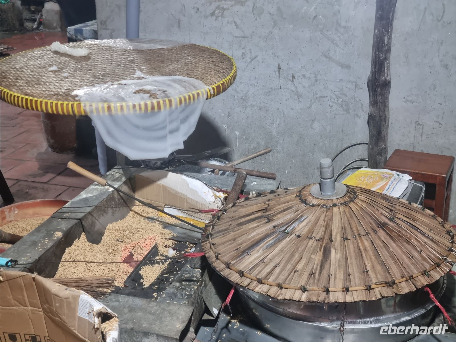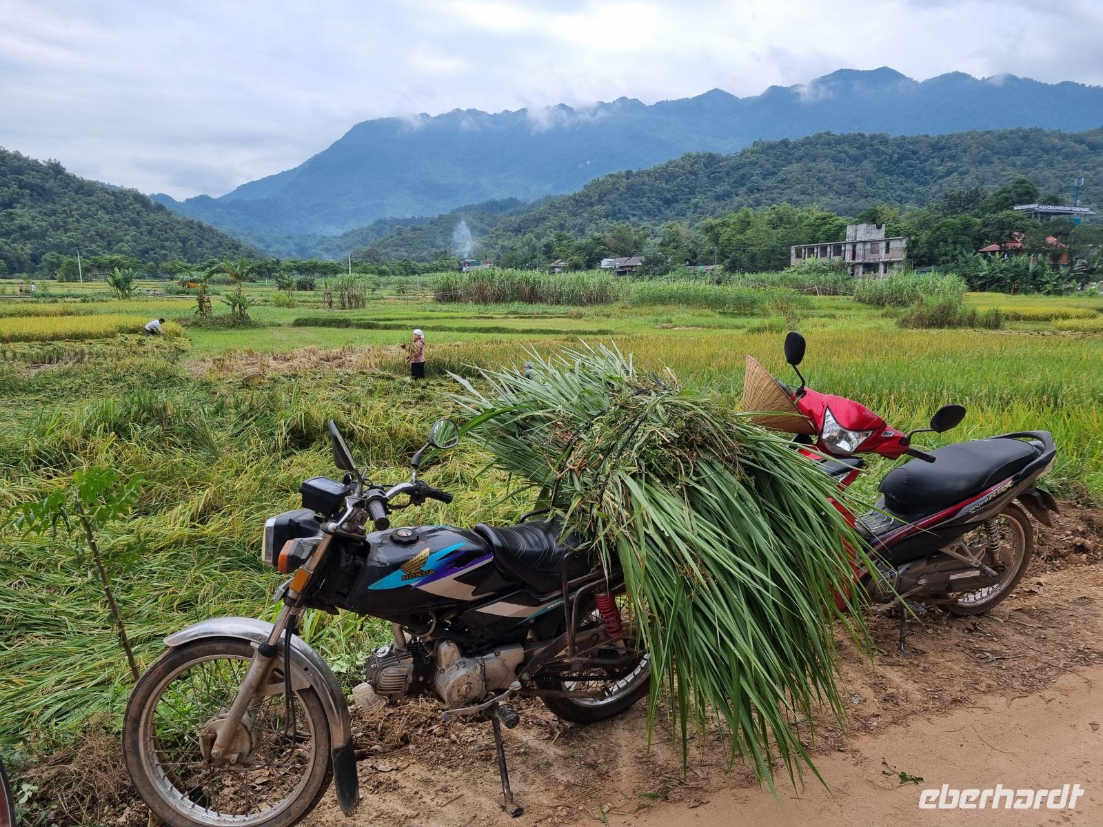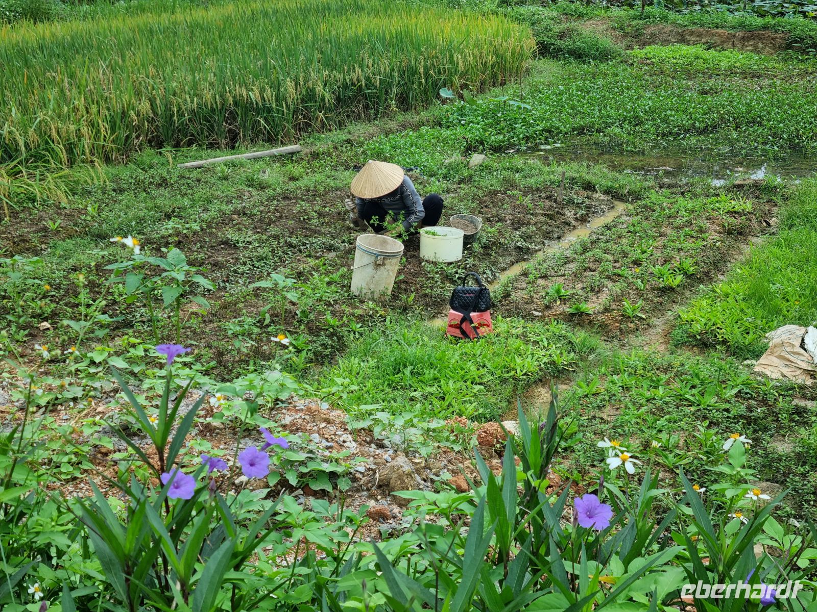 „Ecolodge Resort“ in Mai Chau, idyllisch eingebettet zwischen Reisfeldern und Palmen. Nach einer kurzen Mittagspause machten wir uns auf zu einem Spaziergang durch das benachbarte Dorf, das von einer ethnischen Minderheit bewohnt wird. Die Dorfbewohner begrüßten uns freundlich, viele trugen noch ihre traditionellen Trachten – bunte Stoffe mit aufwendigen Stickereien. Wir konnten verschiedenes Handwerk hautnah erleben, unter anderem Frauen am Webstuhl. Überall war das Klappern, Klopfen und Lachen zu hören. Rund um die Lodge zogen sich riesige Reisfelder bis zum Horizont, und wir hatten