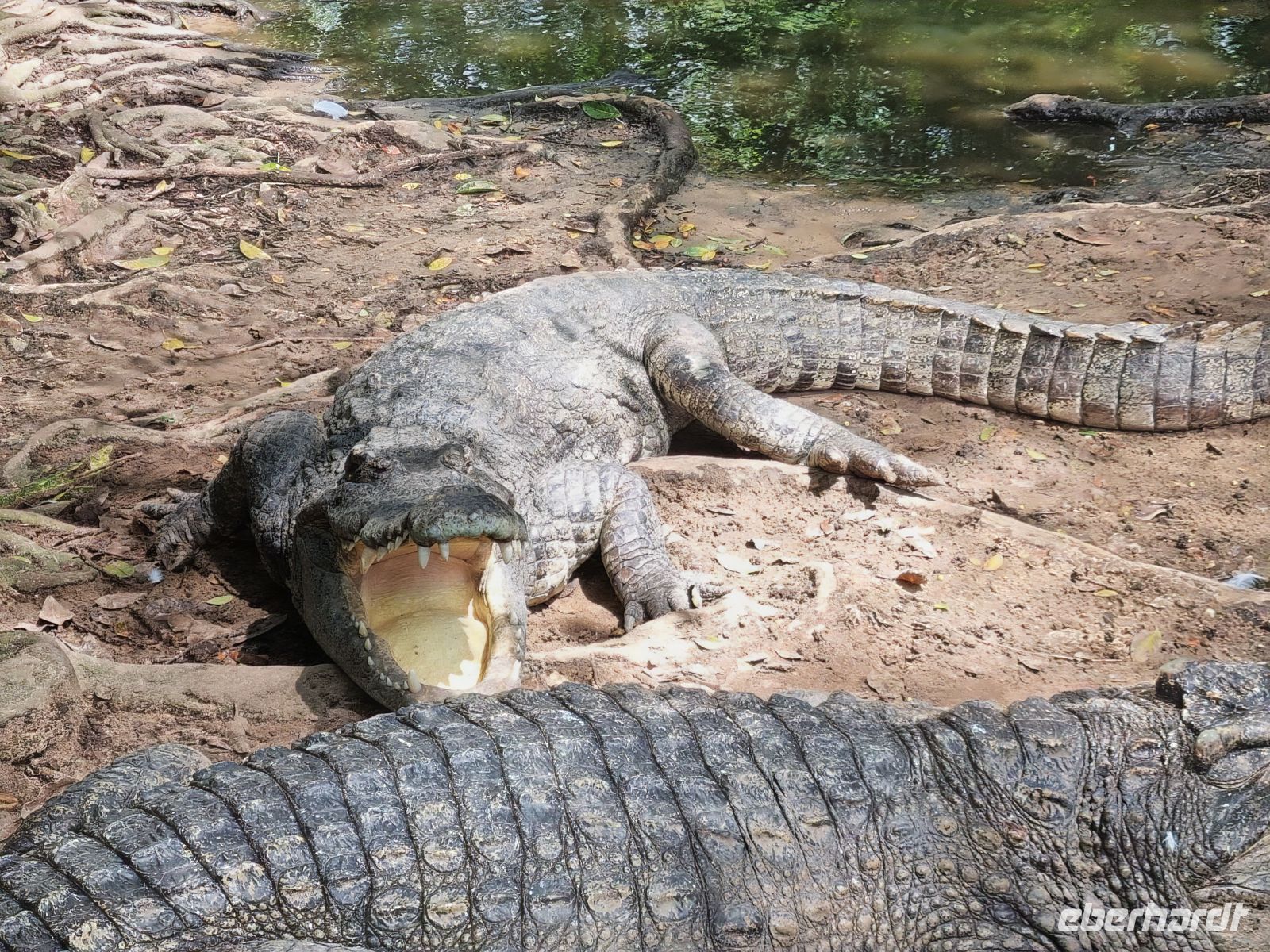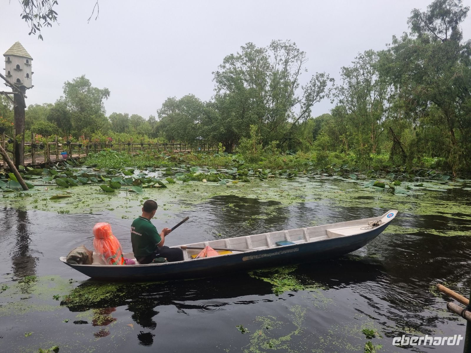 Bereits am frühen Morgen wurde unser Gepäck pünktlich im Bus verstaut, und wir machten uns zu Fuß auf den Weg zur Bootsanlegestelle, die direkt gegenüber unseres Hotels lag. Von dort startete unser Ausflug zu den berühmten „Schwimmenden Märkten“ von Cần Thơ, einem der lebendigsten Orte im Mekong-Delta. Auf unzähligen kleinen Holzbooten boten Händler ihre Waren an – frische Früchte, Gemüse, Blumen und lokale Spezialitäten wechselten mitten auf dem Wasser den Besitzer. Der Duft reifer Ananas mischte sich mit dem Klang fröhlicher Zurufe und dem Knattern der Bootsmotoren – ein faszinierendes Schauspiel vietnamesischen Alltagslebens. Nach dieser eindrucksvollen Bootsfahrt erreichten wir den An Binh-Markt, wo uns ein buntes, geschäftiges Treiben empfing. Überall wurde gefeilscht, gelacht und gekocht – ein authentischer Einblick in das Leben der Einheimischen. Anschließend holte uns unser Bus ab und brachte uns zu einem typischen Hängematten-Café, wie man sie im Süden Vietnams oft findet. Im Schatten schaukelten wir in bequemen Hängematten, tranken süßen vietnamesischen Kaffee oder Tee und genossen für einen Moment die entspannte Atmosphäre, die für diese Region so charakteristisch ist. Unsere Mittagspause verbrachten wir auf der Krokodilfarm von Long Xuyen, wo wir zahlreiche lebendige Mekong-Krokodile beobachten konnten – beeindruckende Tiere, die in großen Becken gezüchtet werden und respektvolles Staunen hervorrufen. Am Nachmittag setzte erneut Regen ein, doch als wir im Landschaftsschutzgebiet „Tra Su“ ankamen, klarte der Himmel glücklicherweise wieder etwas auf. Das Gebiet ist ein wahres Naturparadies mit weiten, stillen Wasserflächen und dichten Mangroven- und Melaleuca-Wäldern, in denen unzählige Vögel und andere Tiere leben. Eine etwa 20-minütige Bootsfahrt durch die grünen Kanäle ließ uns tief in diese stille, fast mystische Landschaft eintauchen – ein würdiger Abschluss unserer Reise durch das Mekong-Delta. Am Abend erreichten wir das „Chao Pho Hotel“, wo wir den erlebnisreichen Tag bei einem schmackhaften Abendessen ausklingen ließen.