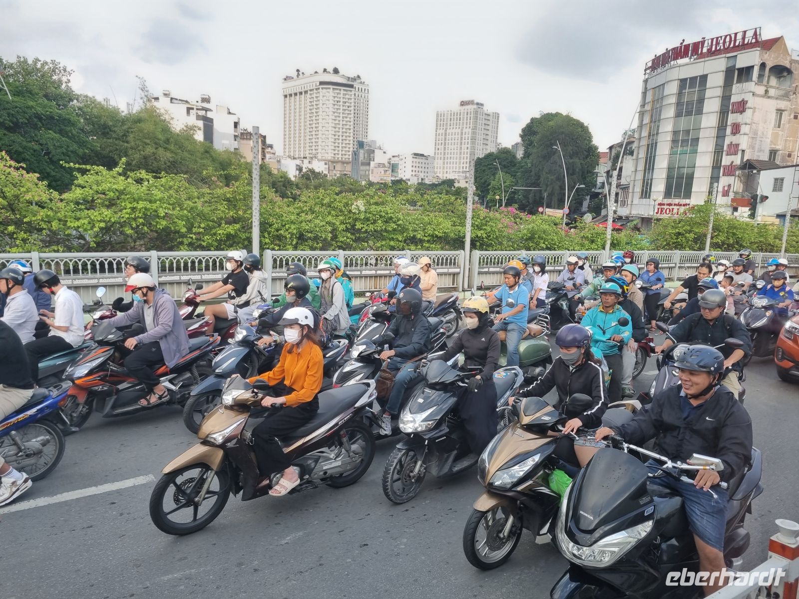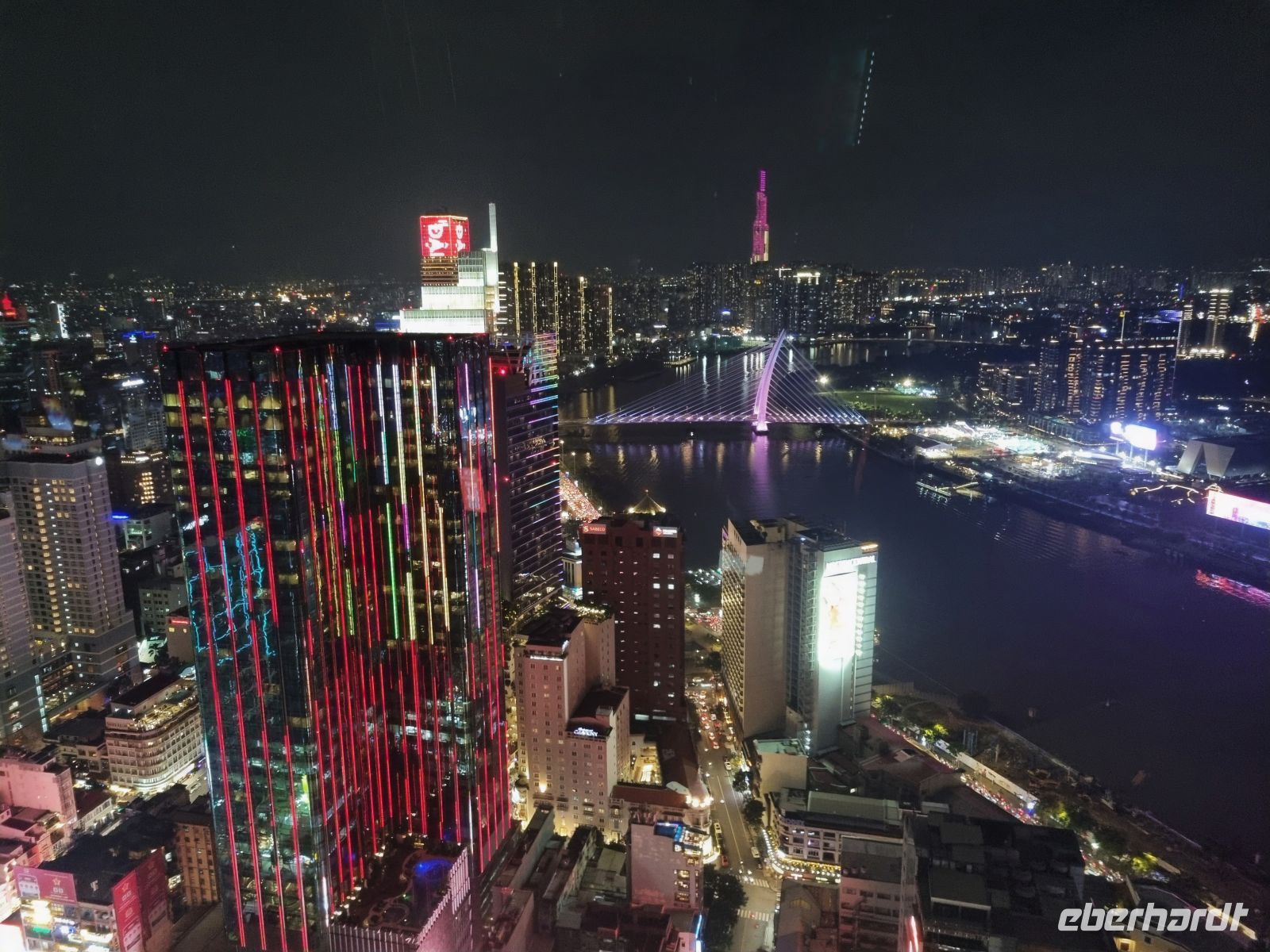 Nun endlich hieß es Koffer packen, und die Evakuierung aus dem Hotel mitsamt unserem Gepäck konnte direkt nach dem Frühstück starten. Abenteuer pur, denn das Wasser stand weiterhin in der Straße vor dem Hotel. Schon beim Blick aus dem Fenster war klar: Das wird kein gewöhnlicher Reisetag. Die Straße glich eher einem Fluss, und das Hotelpersonal watete mit Gummistiefeln durch das trübe Wasser, um unseren Gästen in allen Dingen zu helfen. Mit Booten wurden wir – samt Gepäck – durch die überschwemmten Gassen manövriert. Schon das war ein Erlebnis für sich: Einheimische winkten uns zu und jeder Meter in diesem braunen Wasser fühlte sich ein bisschen nach Abenteuer an. Am Ende der Bootsfahrt wartete ein Traktor auf uns. Auf dessen Ladefläche rumpelten wir durch die überfluteten Gassen um halbwegs trockenen Fußes den Bus zu erreichen. Es war ein kurioser, aber auch irgendwie emotionaler Abschied von dieser Stadt, die uns trotz (oder vielleicht gerade wegen) der Überschwemmung in Erinnerung bleiben wird. Die Weiterfahrt mit dem Bus nach Da Nang verlief zum Glück ruhig. Unsere Flüge waren schon vor zwei Tagen umgebucht worden, und so waren wir erleichtert, als wir endlich den Flughafen erreichten. Dort hieß es erstmal: durchatmen, ankommen, zur Ruhe kommen. Als der Flieger schließlich – mit leichter Verspätung – in Richtung Ho-Chi-Minh-Stadt abhob, freuten wir uns auf das nächste Kapitel unserer Reise... Nach einem ruhigen Flug erreichten wir am Nachmittag Ho-Chi-Minh-Stadt, das ehemalige Saigon. Schon beim Aussteigen empfing uns die warme tropische Luft Vietnams. Am Flughafen wurden wir herzlich von unserem neuen Reiseleiter Binh begrüßt, der uns mit einem freundlichen Lächeln und vielen interessanten ersten Informationen über die Stadt willkommen hieß. Nach einer kurzen Fahrt durch das geschäftige Stadtzentrum checkten wir in unserem zentral gelegenen Hotel ein. Die Lage war ideal, um direkt auf Entdeckungstour zu gehen. Am späten Nachmittag machten wir gemeinsam mit Binh einen Spaziergang zum Bitexco Financial Tower, dem markanten Skytower der Stadt. Mit dem Aufzug ging es hinauf zur Aussichtsplattform – und dort bot sich uns ein atemberaubender Blick über das Lichtermeer Saigons. Zwischen den modernen Hochhäusern und den unzähligen Mopeds, die sich durch die Straßen schlängelten, zeigte sich die Dynamik dieser faszinierenden Metropole besonders eindrucksvoll.