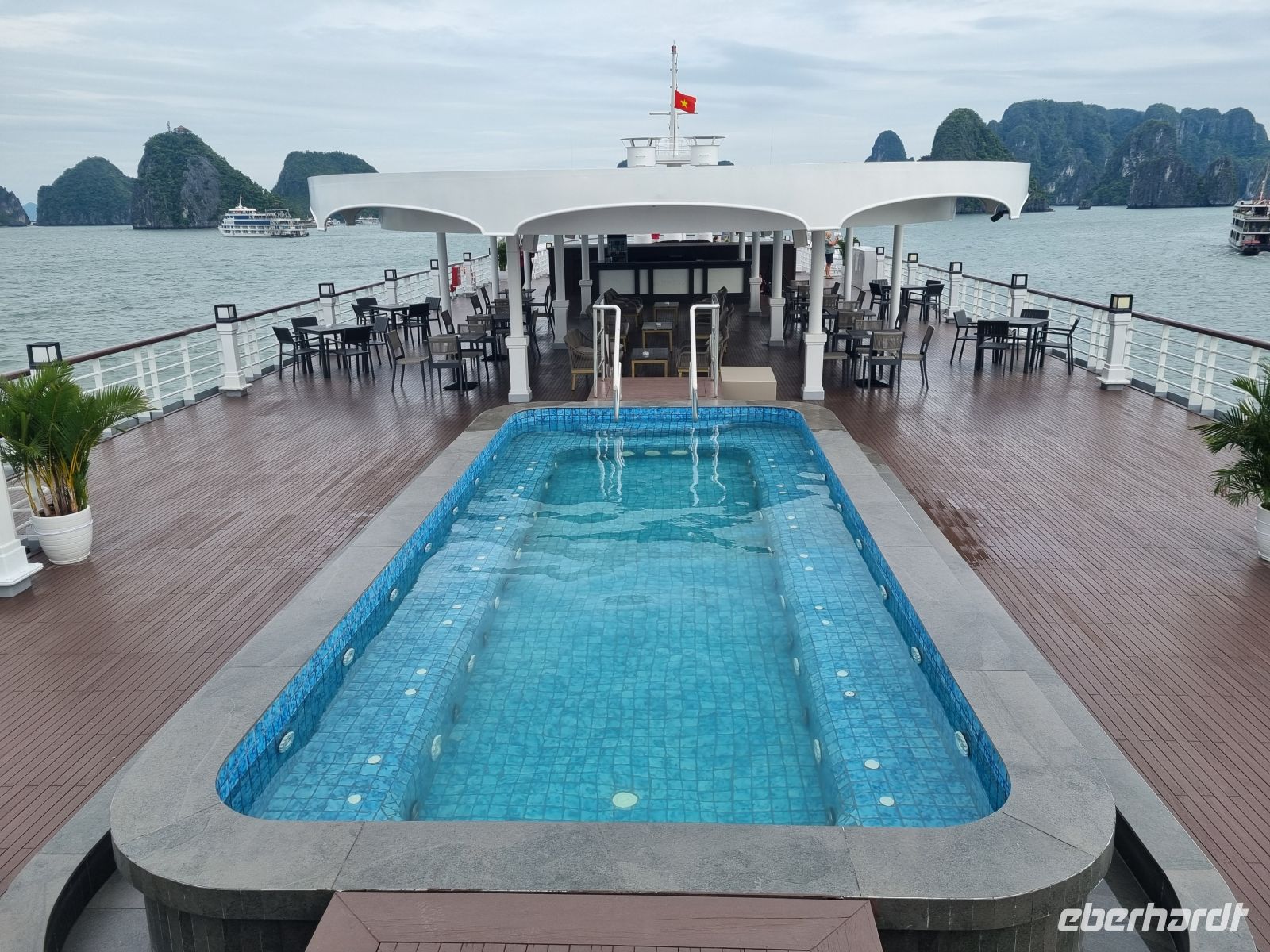 „Emeralda Resort Ninh Bingh“. Die großzügigen und luxuriösen Unterkünfte ließen keine Wünsche offen. Vor dem Abendessen blieb sogar noch Zeit, den Pool zu nutzen – wahlweise den beheizten Innenpool oder den erfrischenden Außenpool. Eine fantastische, gepflegte Anlage, die den perfekten Abschluss eines erlebnisreichen Tages bot.