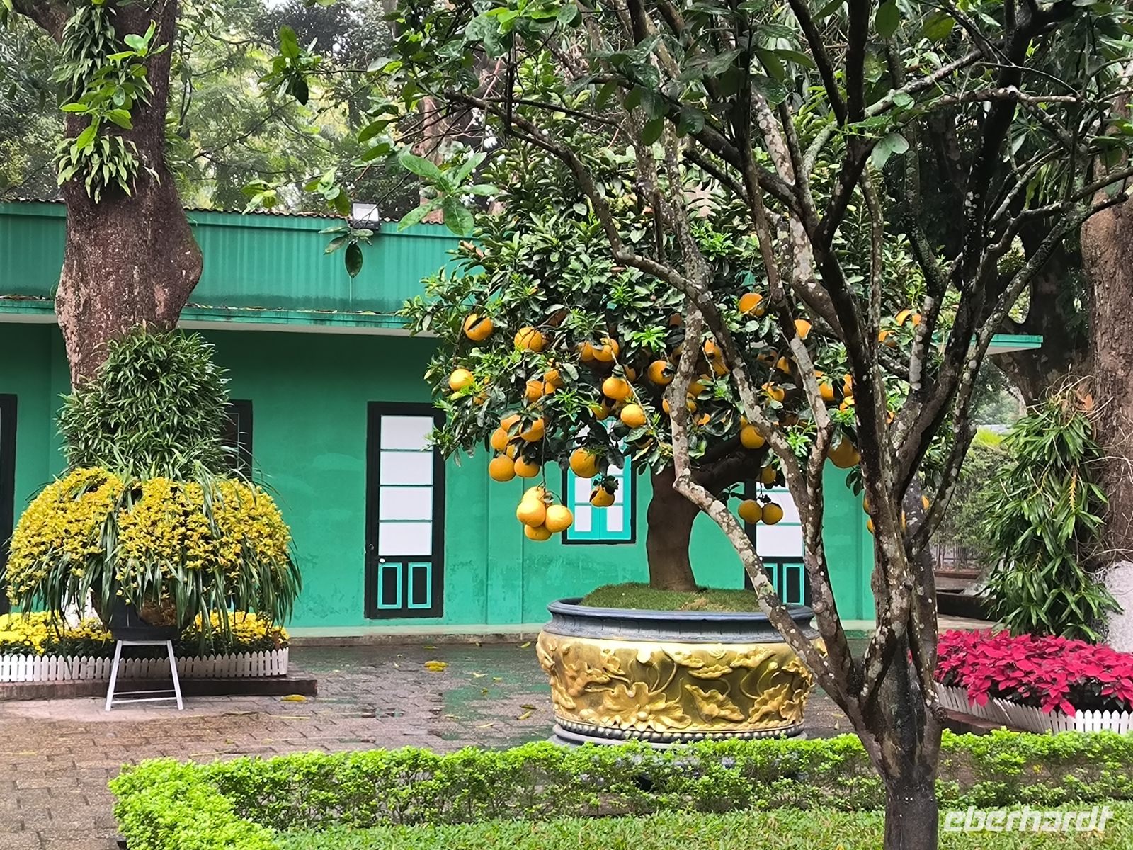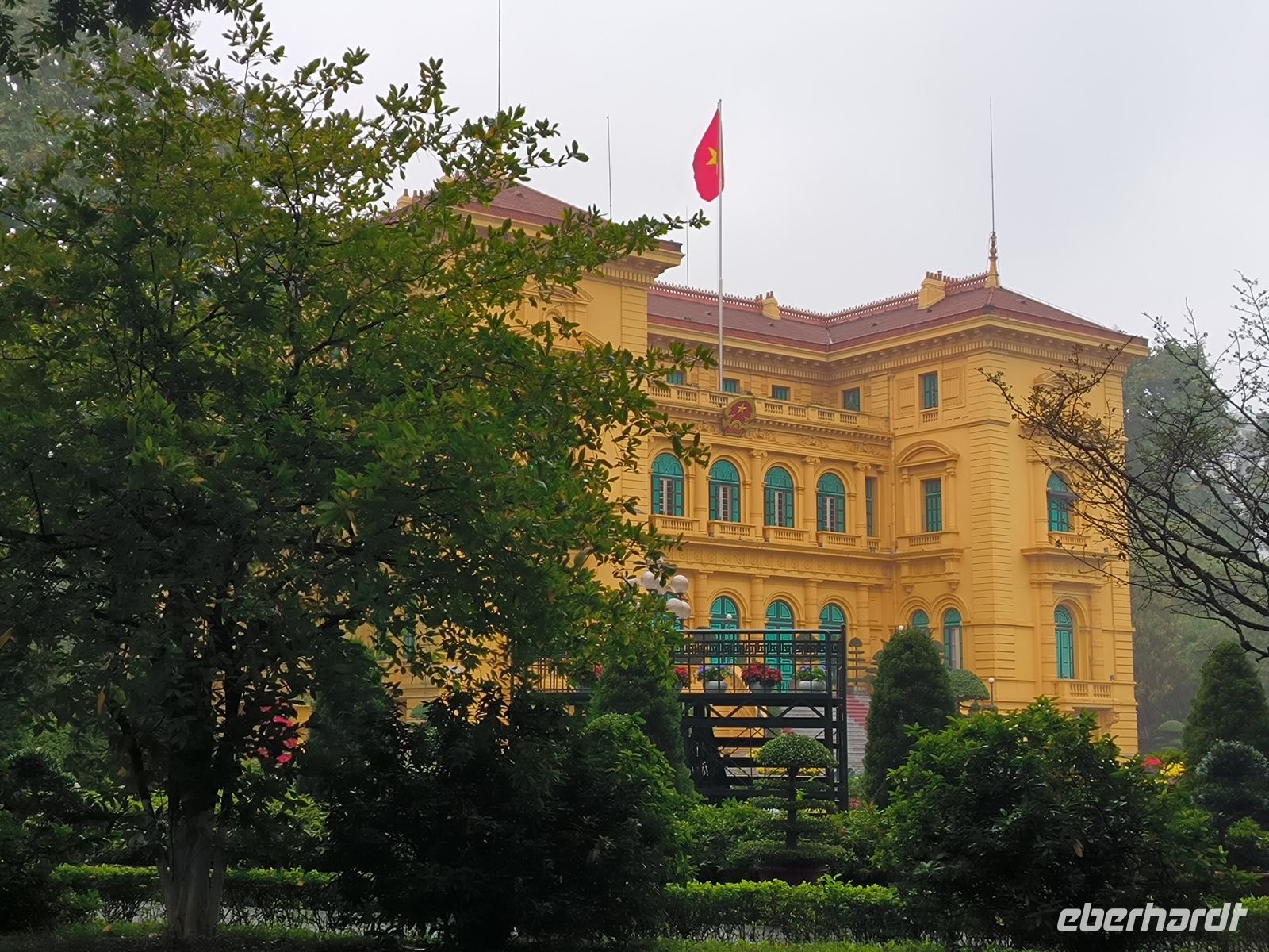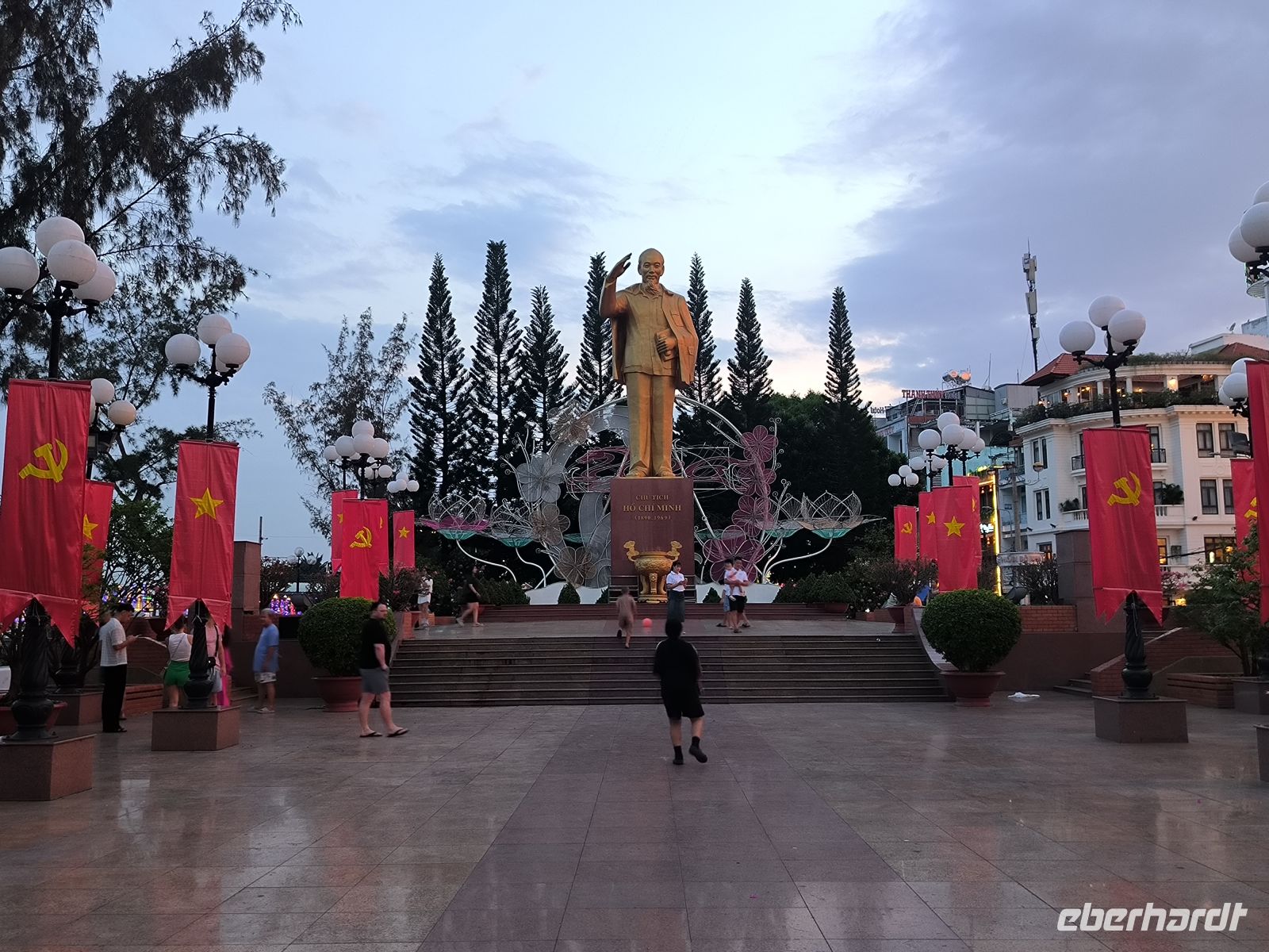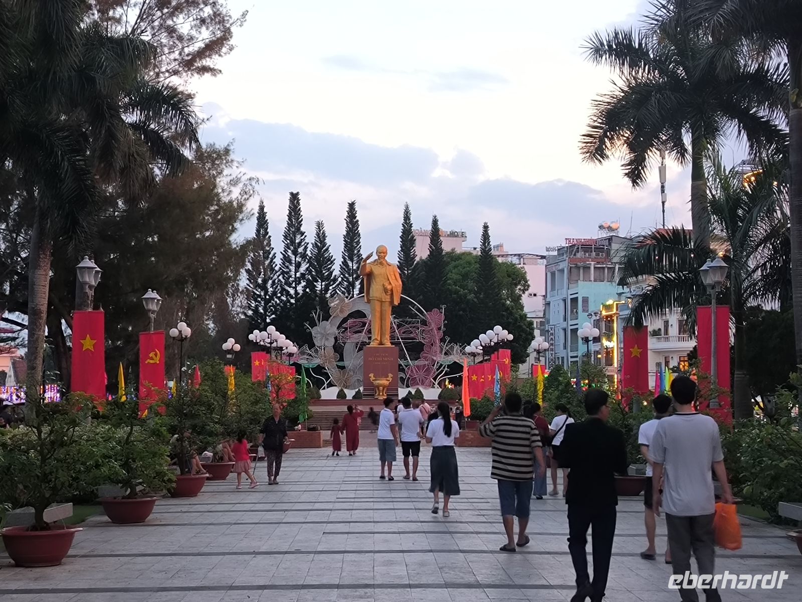 Während unserer Stadtrundfahrt besuchen wir das Ho-Chi-Minh-Mausoleum und sein ehemaliges Wohnhaus und erfahren von unserem Guide Lang viel über die Geschichte des Landes und den großen vietnamesischen Nationalhelden Ho Chi Minh. Die langen Schlangen der Besucher werden mit scharfer Stimme reguliert und junge Männer mit weißen Uniformen bewachen die Mumie. Ob der Gehuldigte diesen Personenkult wohl gut geheißen hätte? Die wechselvolle Geschichte des Landes wird hier eindrucksvoll dargestellt.
