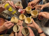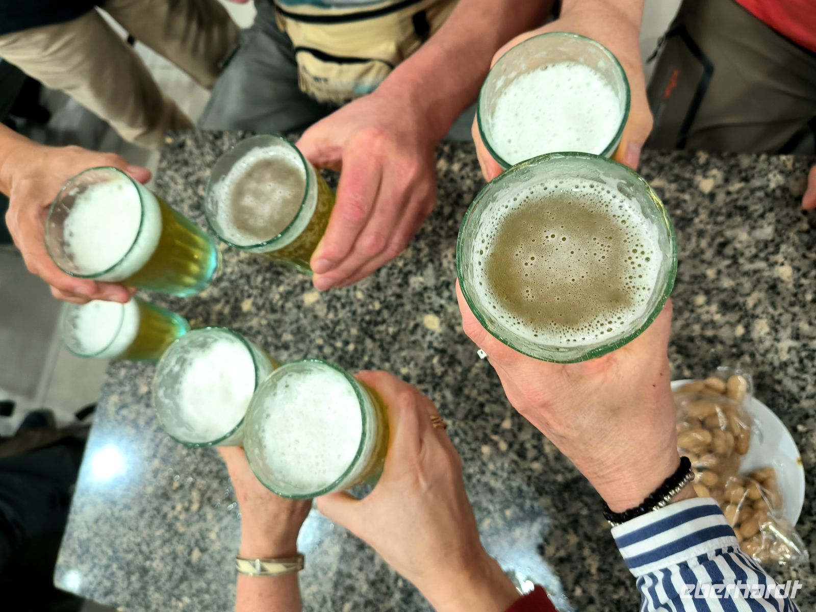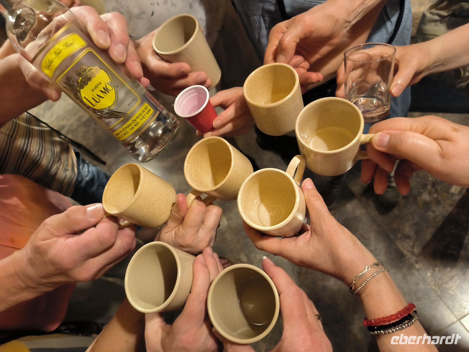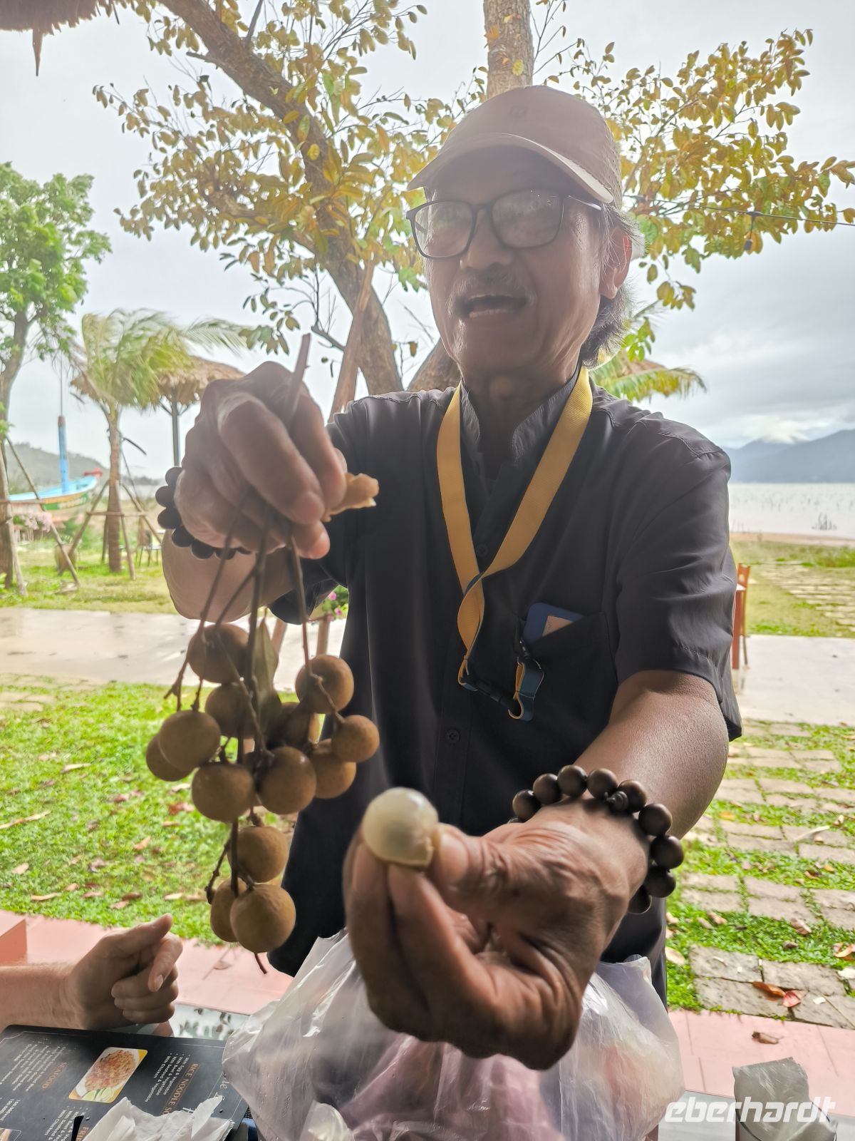 In der Nähe der Austernbänke machen wir unsere Mittagspause. Von den Geburtstagskindern gibt es Obst und Reisschnaps, also Obstler.