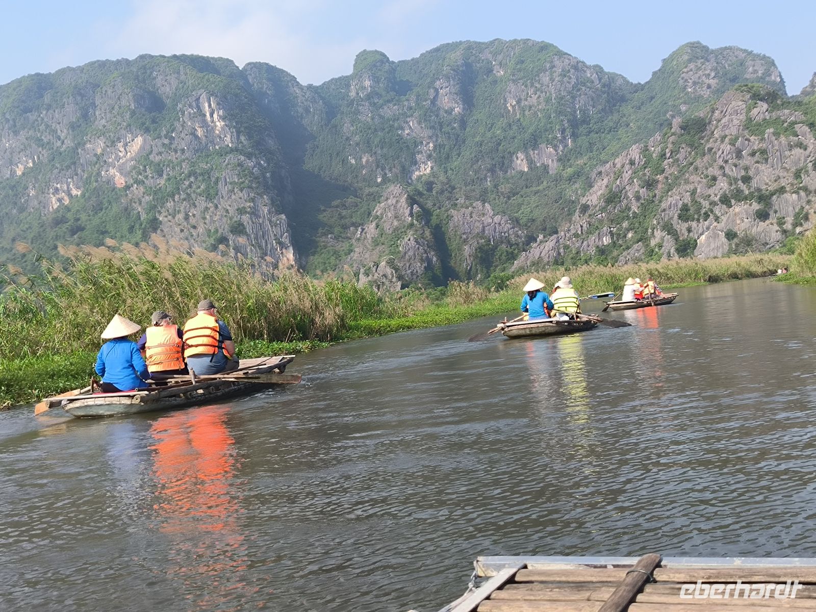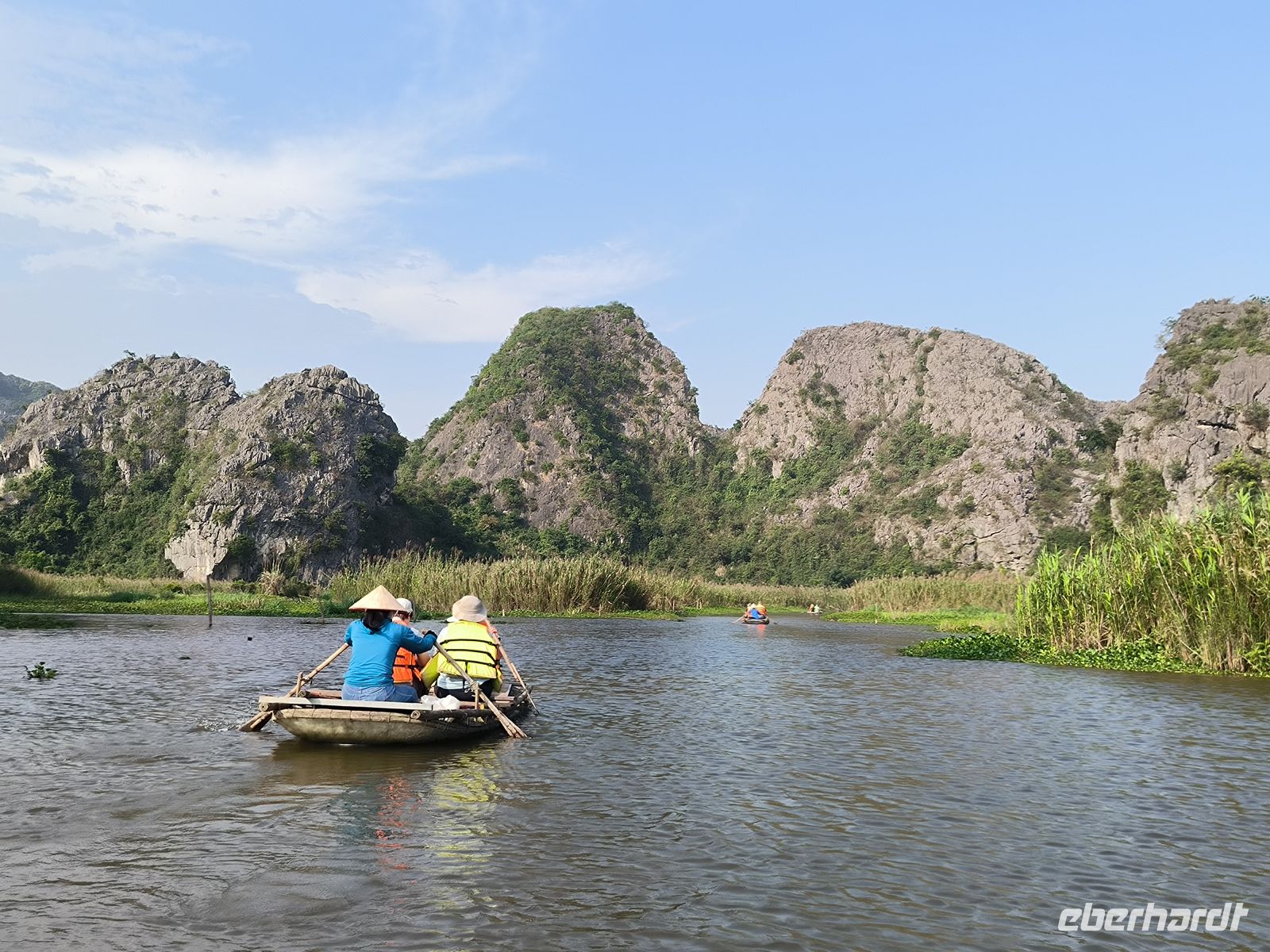 Nach einem entspannten Brunch kehren wir an Land zurück und fahren weiter zur „trockenen Halong-Bucht“ bei Ninh Binh. Zwischen schroffen Karstbergen und grünen Reisfeldern wirkt die Landschaft fast surreal. Hier wurden auch einige Szenen des Filmes "Kong" gedreht. Mit kleinen Booten werden wir durch die Landschaft gerudert. Leider haben wir kein Glück und entdecken keine Langur-Affen, eines der Symboltiere Vietnams.