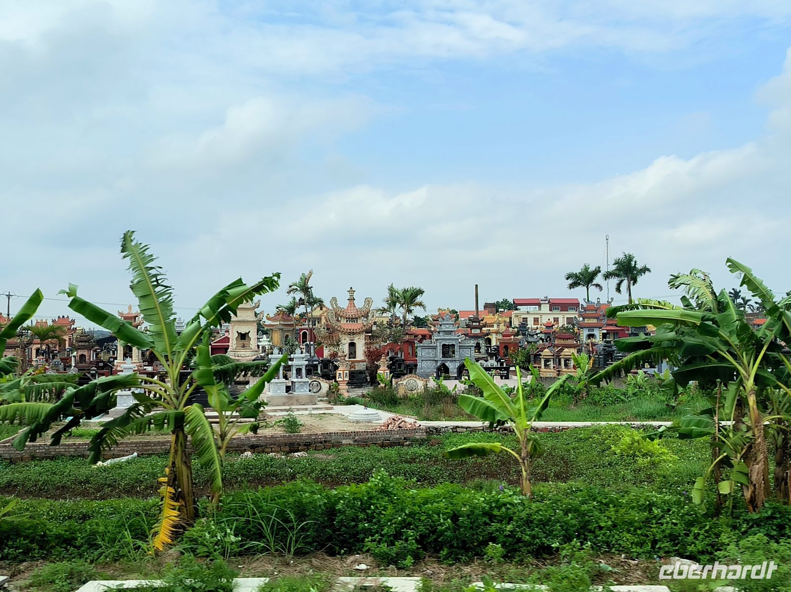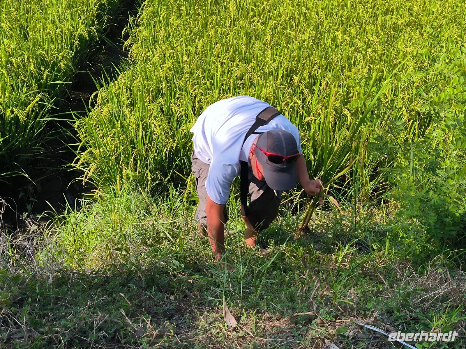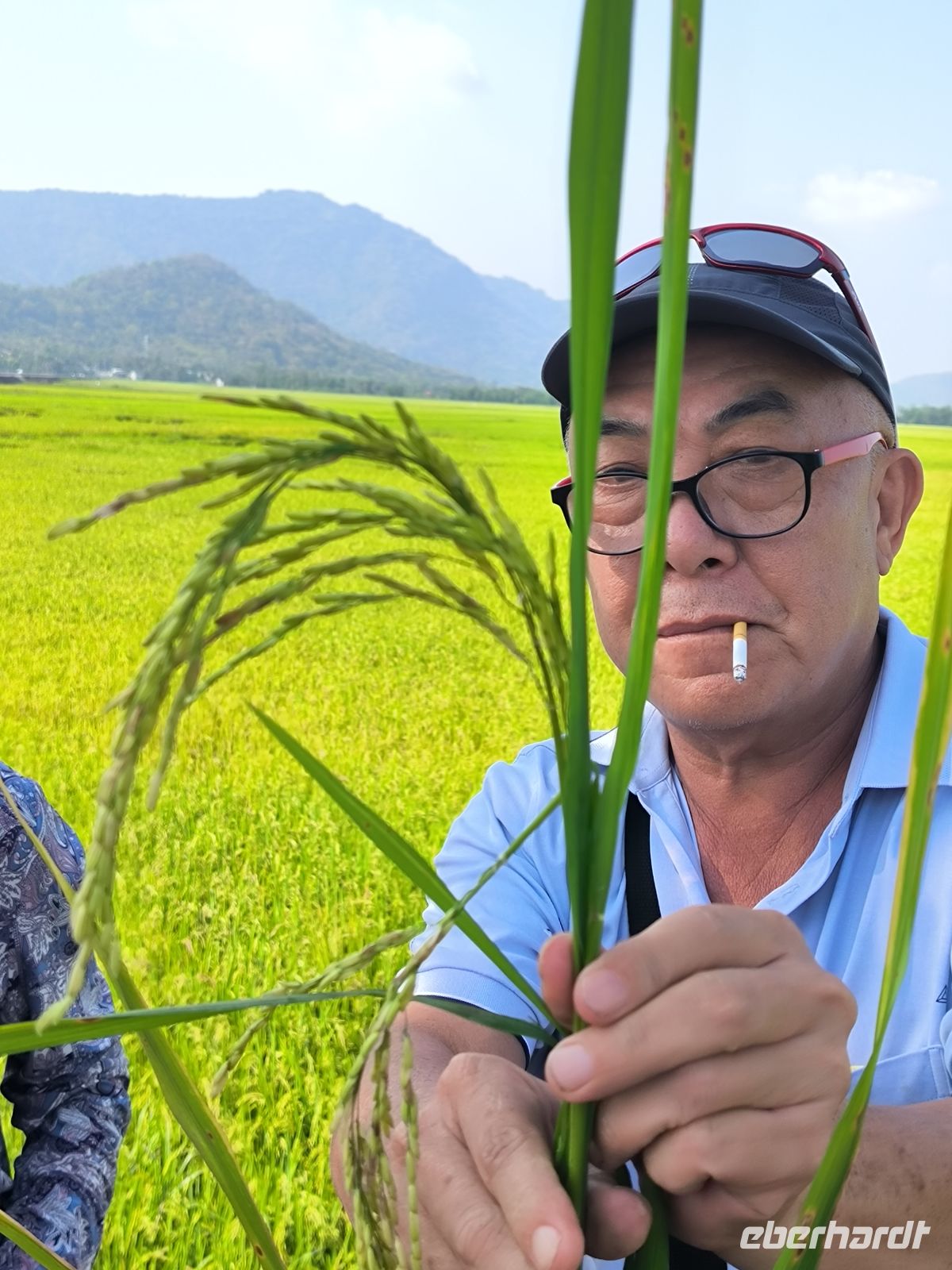 Nach dem Frühstück geht es weiter in die Bergregion nach Mai Chau. Wir sehen Friedhöfe und Einzelgräber in Reisfeldern, die typischen schmalen Häuser an der Straße und Obstbäume mit Litschi-, Longan- und Pomelofrüchten.