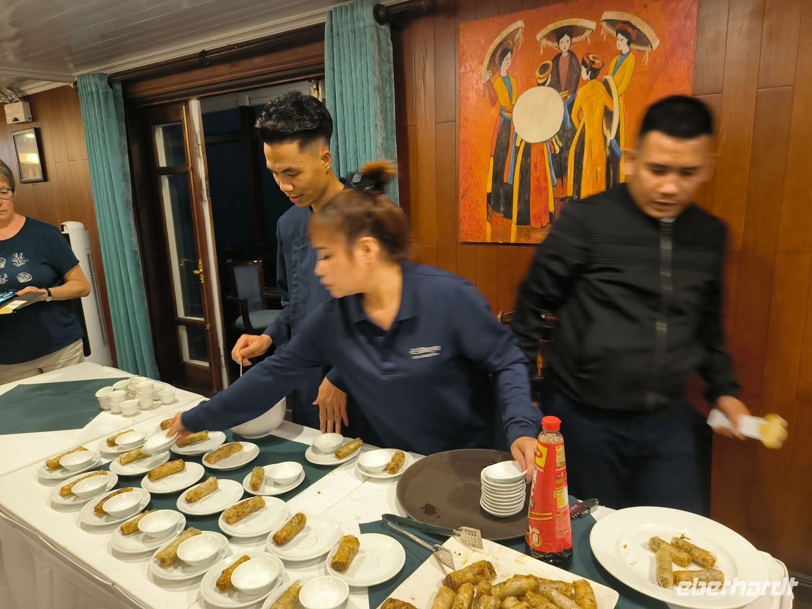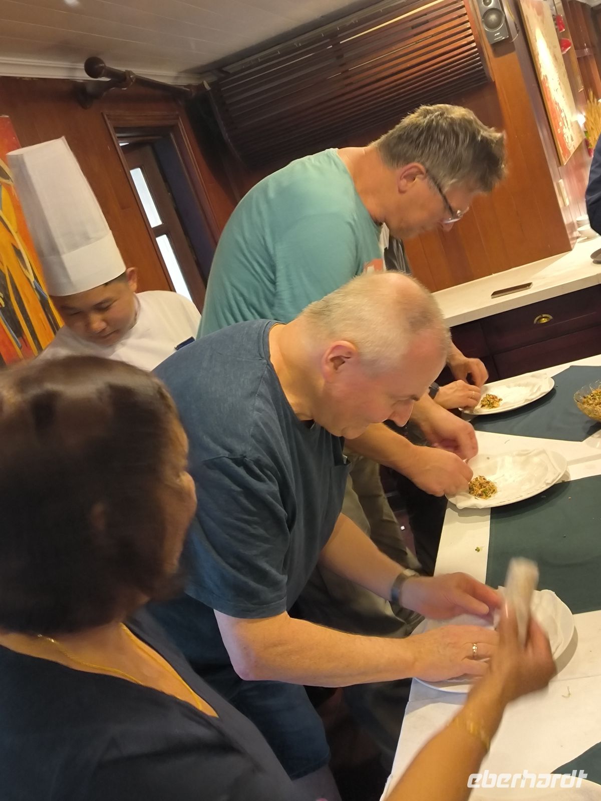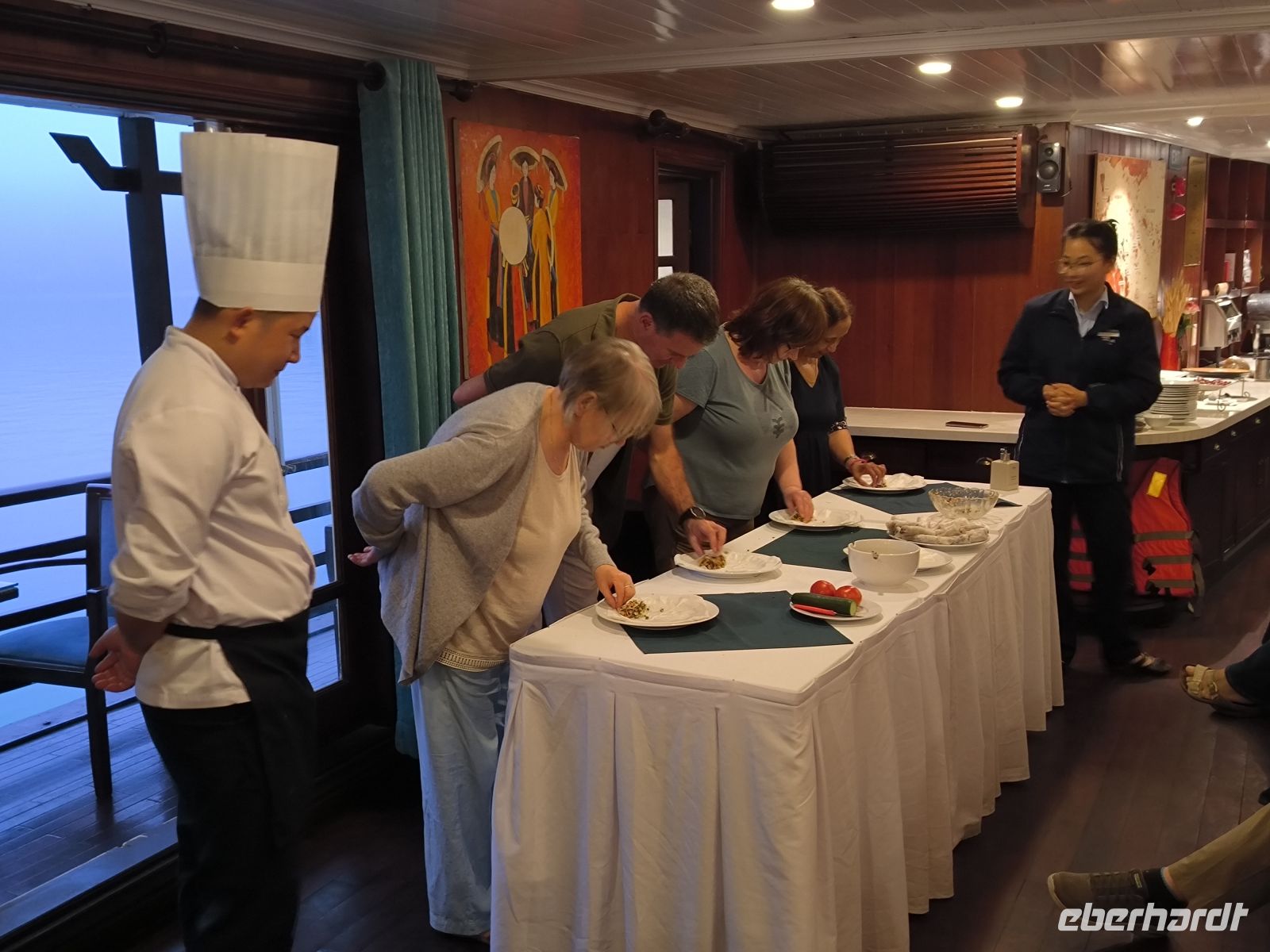 Bei Sonnenuntergang ankert unsere Dschunke in einer ruhigen Bucht. Der Chefkoch zeigt uns verschiedene Methoden, wie man Frühlingsrollen herstellen kann. Den anschließenden Wettbewerb gewinnt Inge aus unserer Gruppe. Glückwunsch! Nun wird das Dinner serviert.