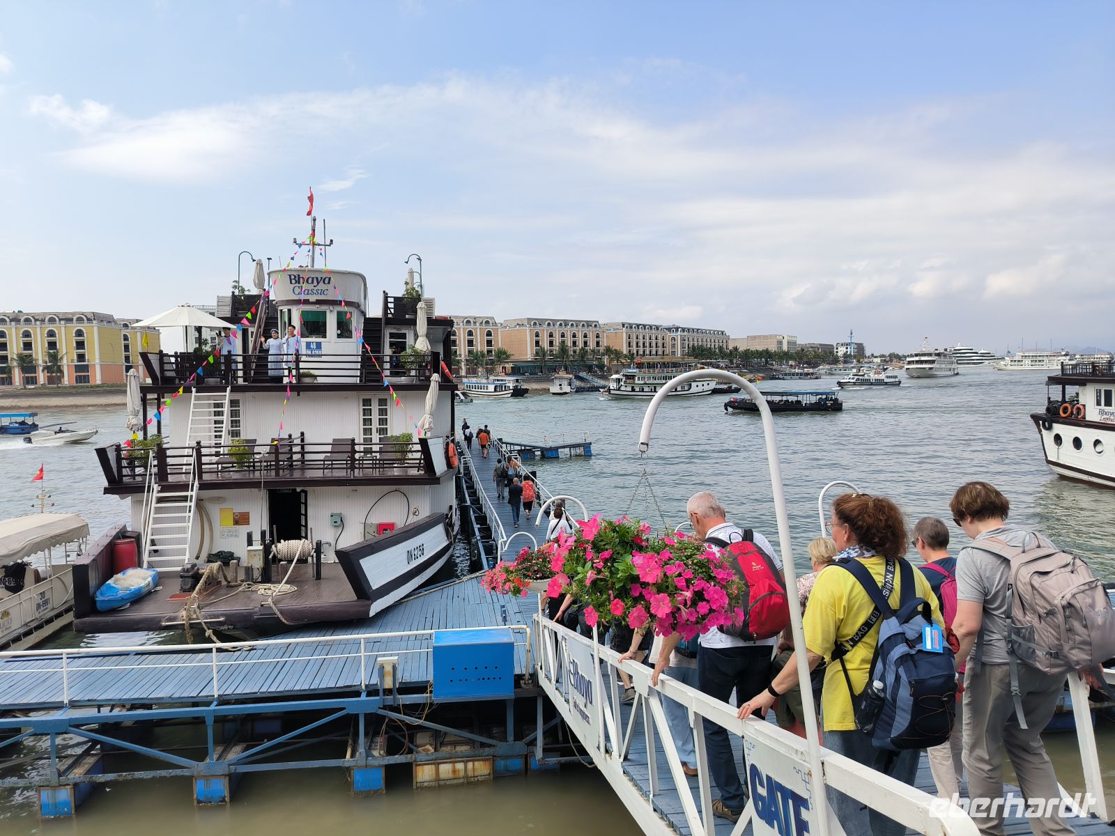 Mittags gehen wir an Bord unserer Dschunke – unserem schwimmenden Hotel – und genießen ein köstliches Meeresfrüchte-Essen.