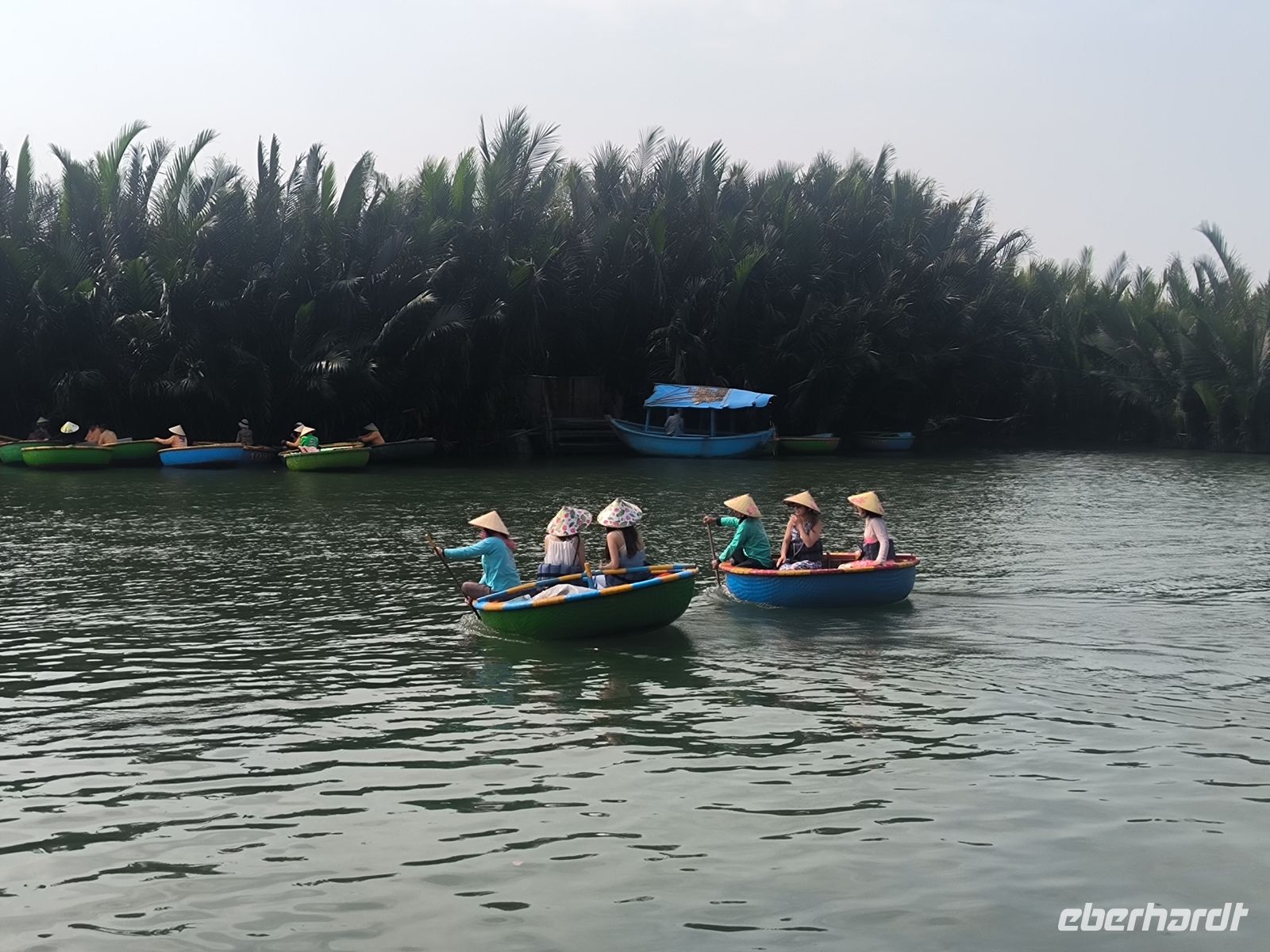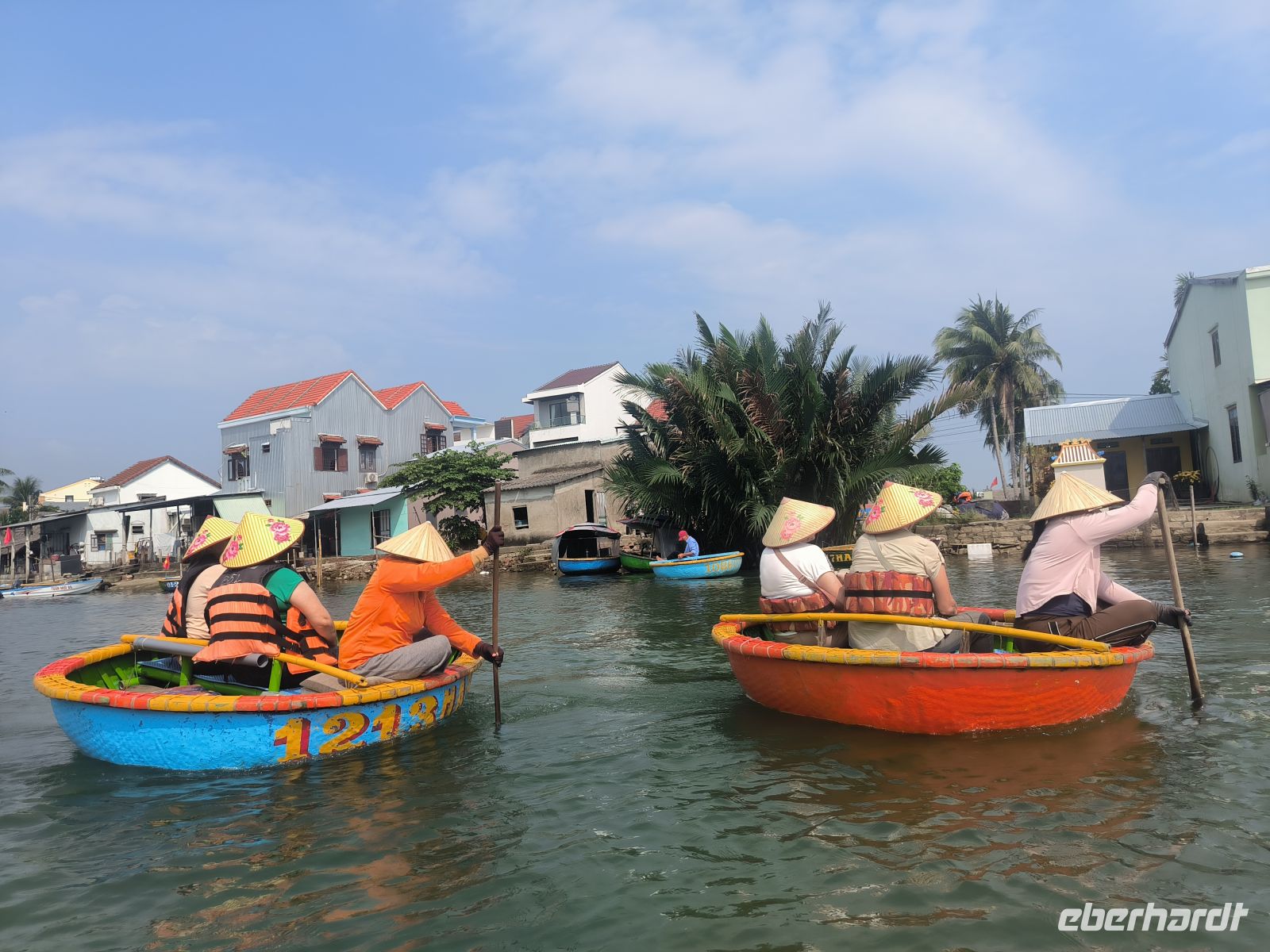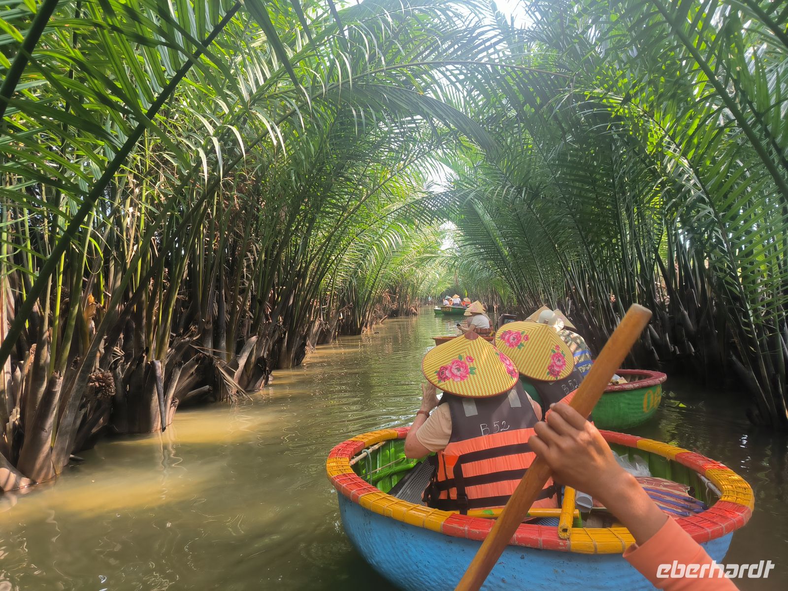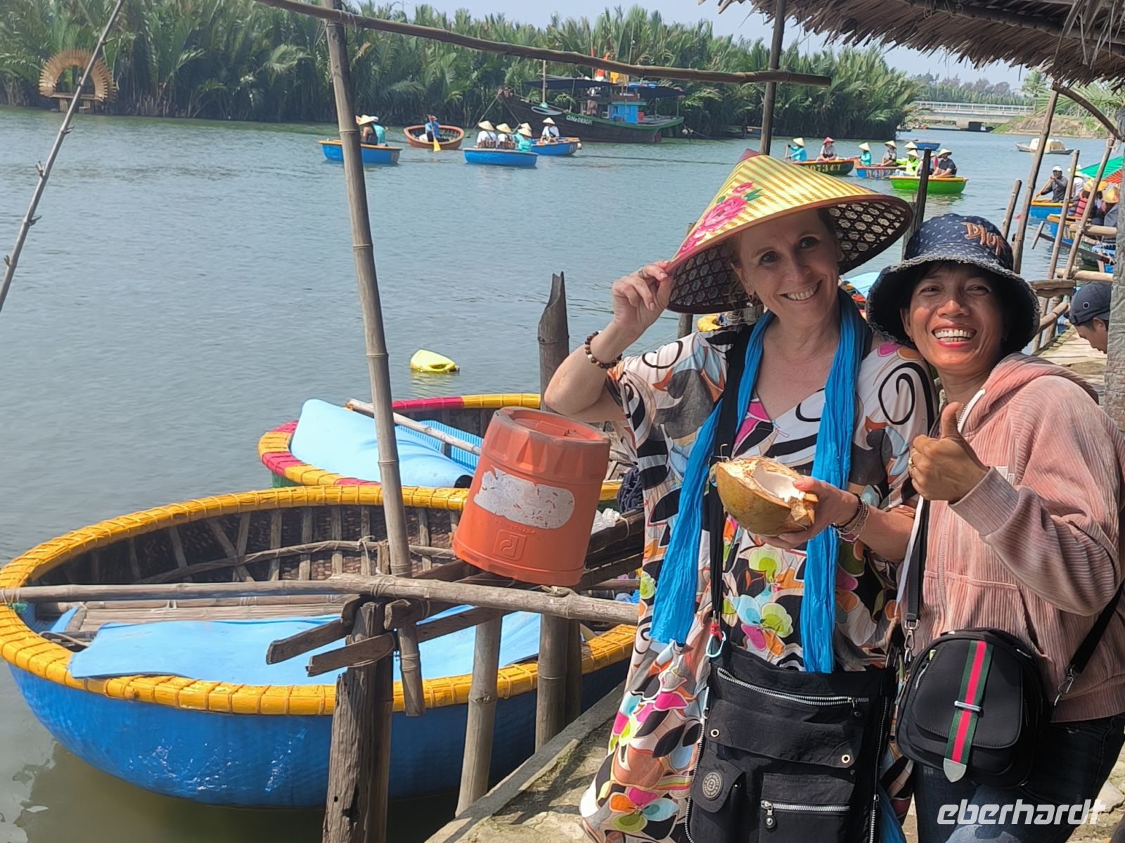 Hoi An verzaubert uns sofort mit seiner entspannten Atmosphäre. Am Vormittag entdecken wir die Stadt vom Wasser aus. Bei einer Bootsfahrt auf den runden Bambusbooten - ausgestattet mit den Tisch vietnamesischen Kopfbedeckungen - gleiten wir durch idyllische Kanäle, gesäumt von Wasserpalmen, aber auch durch den "Ballermann" Vietnams mit Musik und fast artistischen Darbietungen.