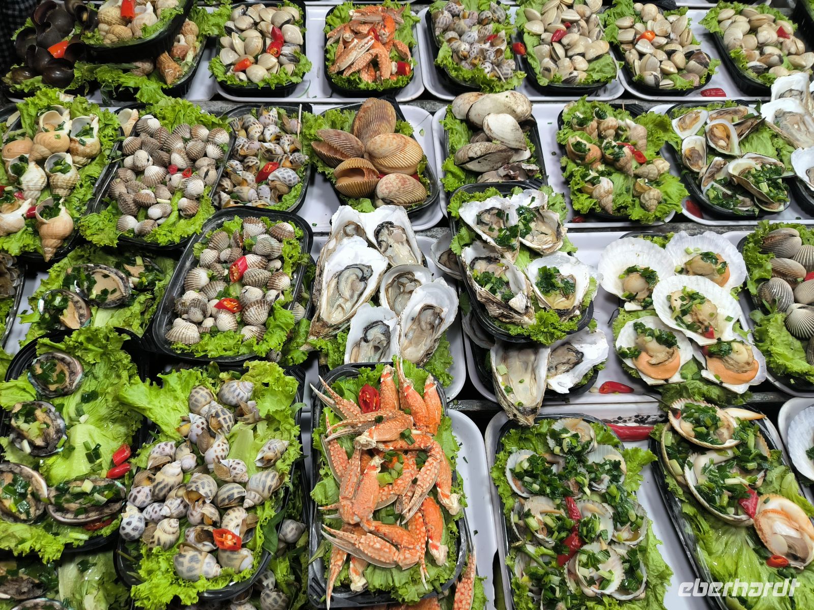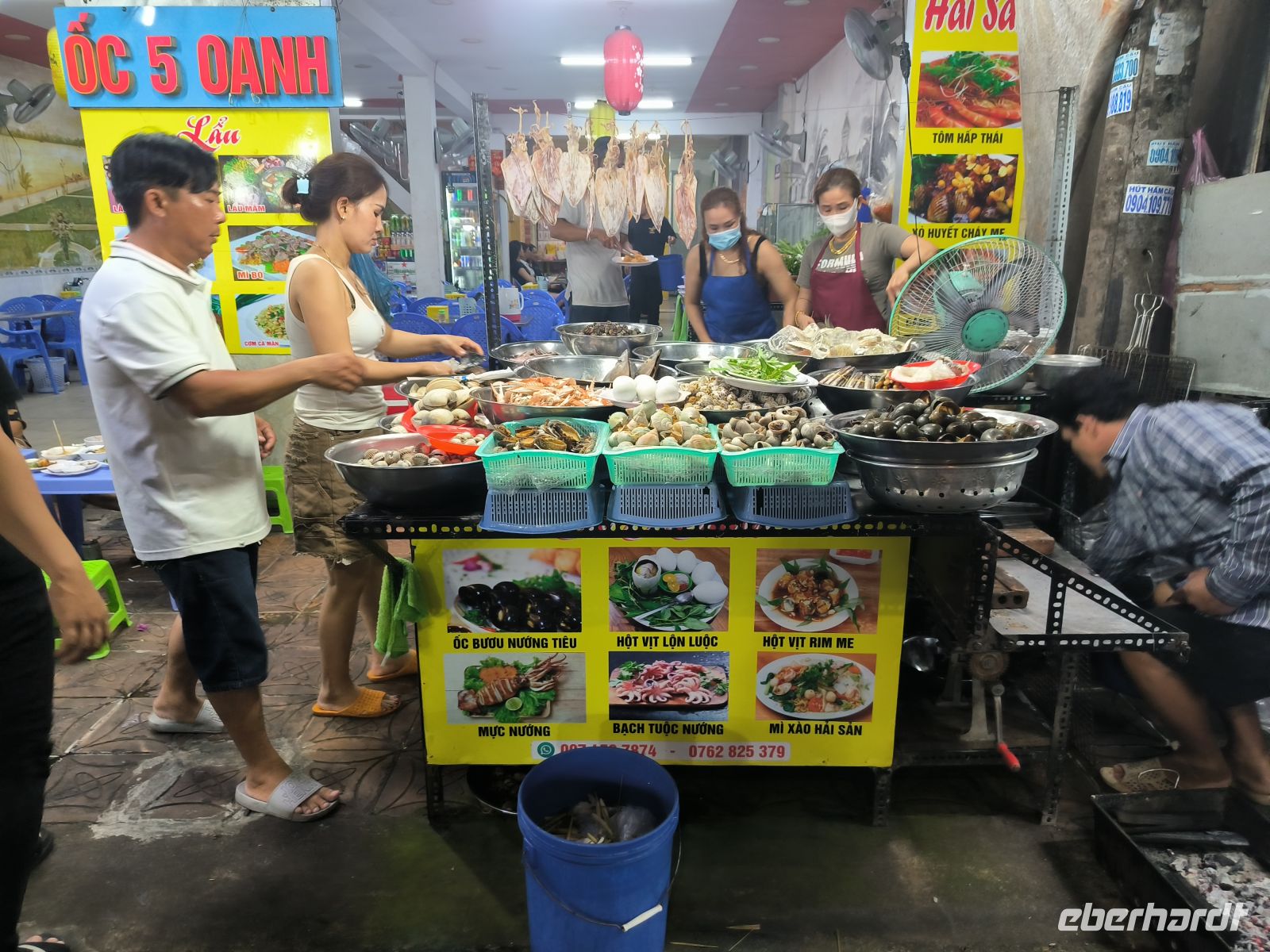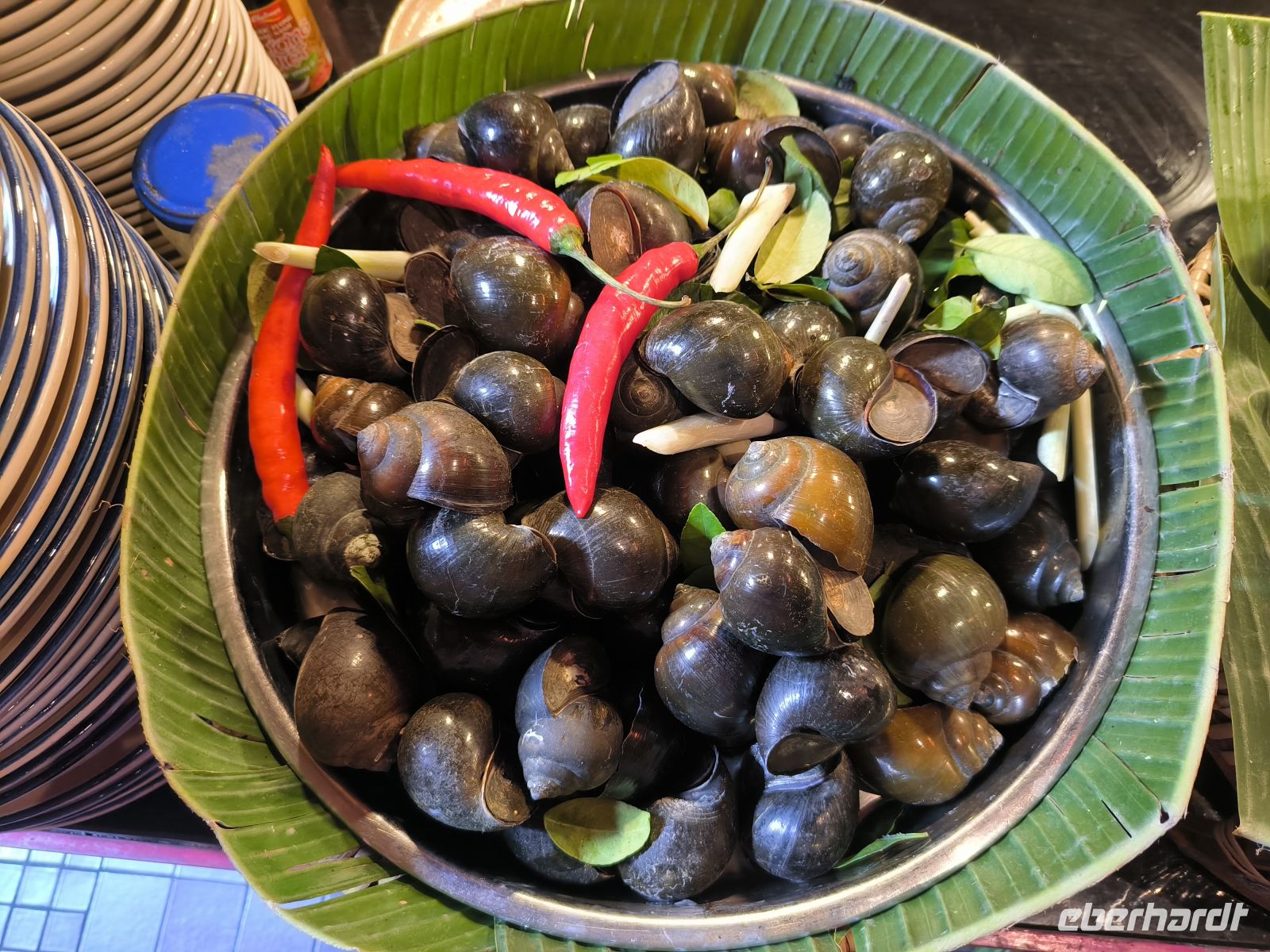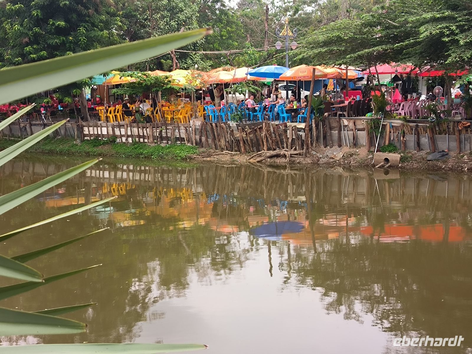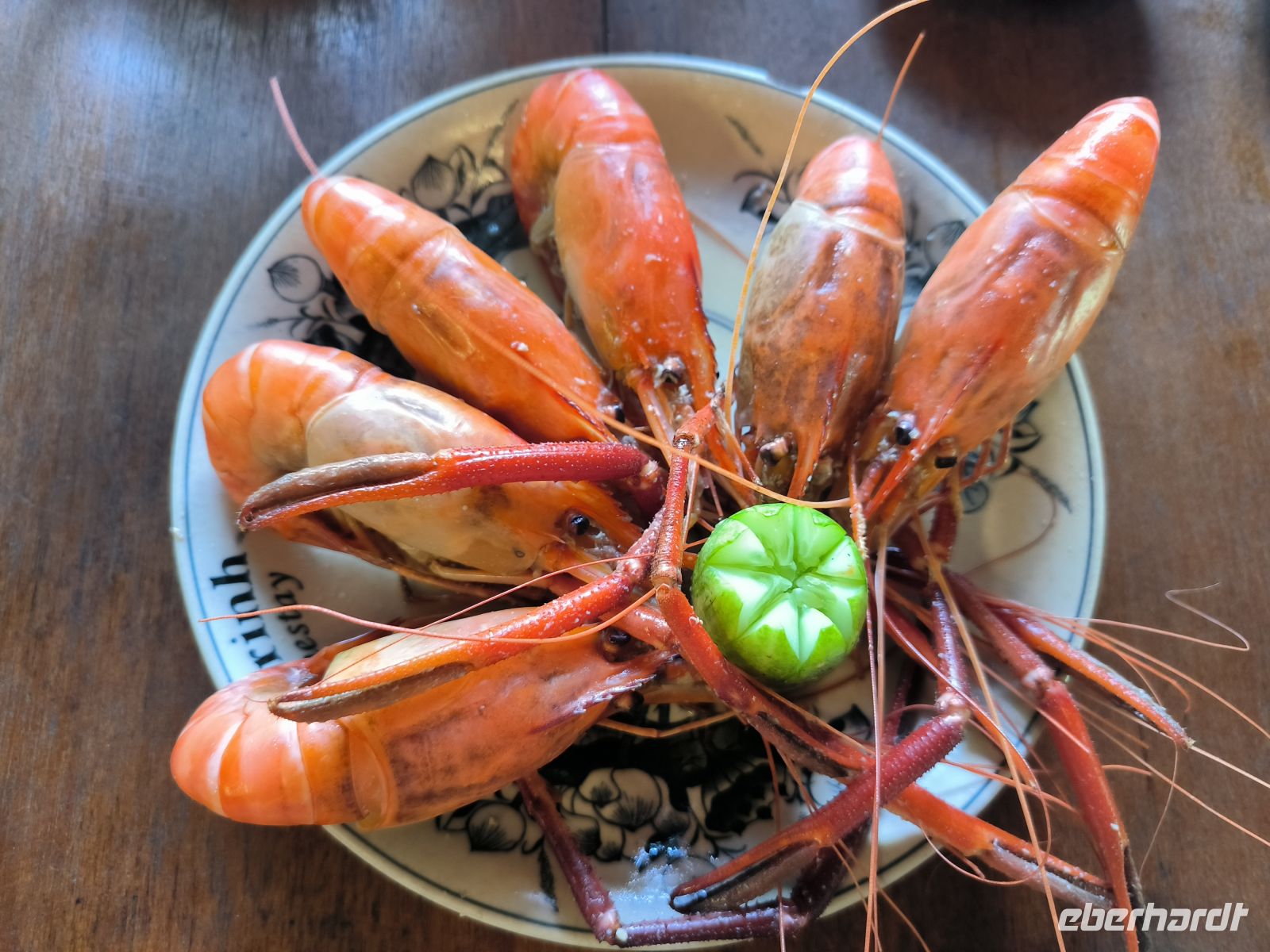 In der Nähe der Austernbänke im "The Lagoon 2" machen wir unsere Mittagspause mit feinsten Frühlingsrollen. Von den Geburtstagskindern gibt es Obst und Reisschnaps, also Obstler.