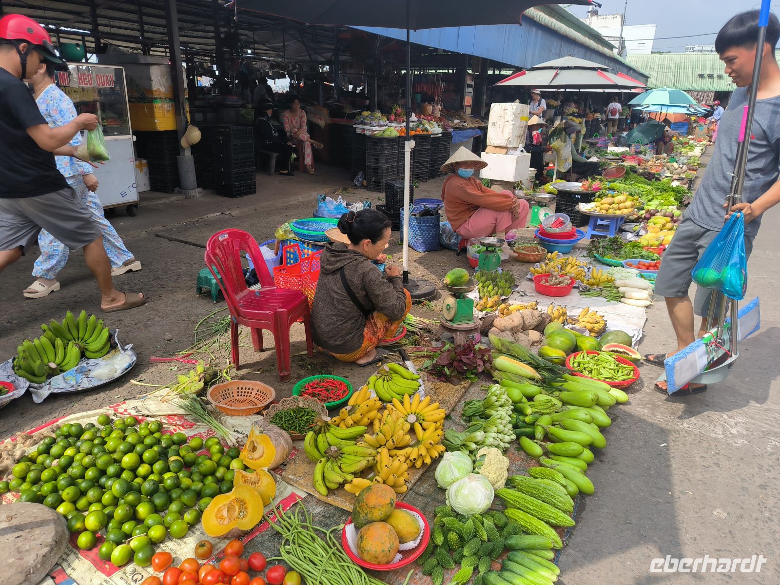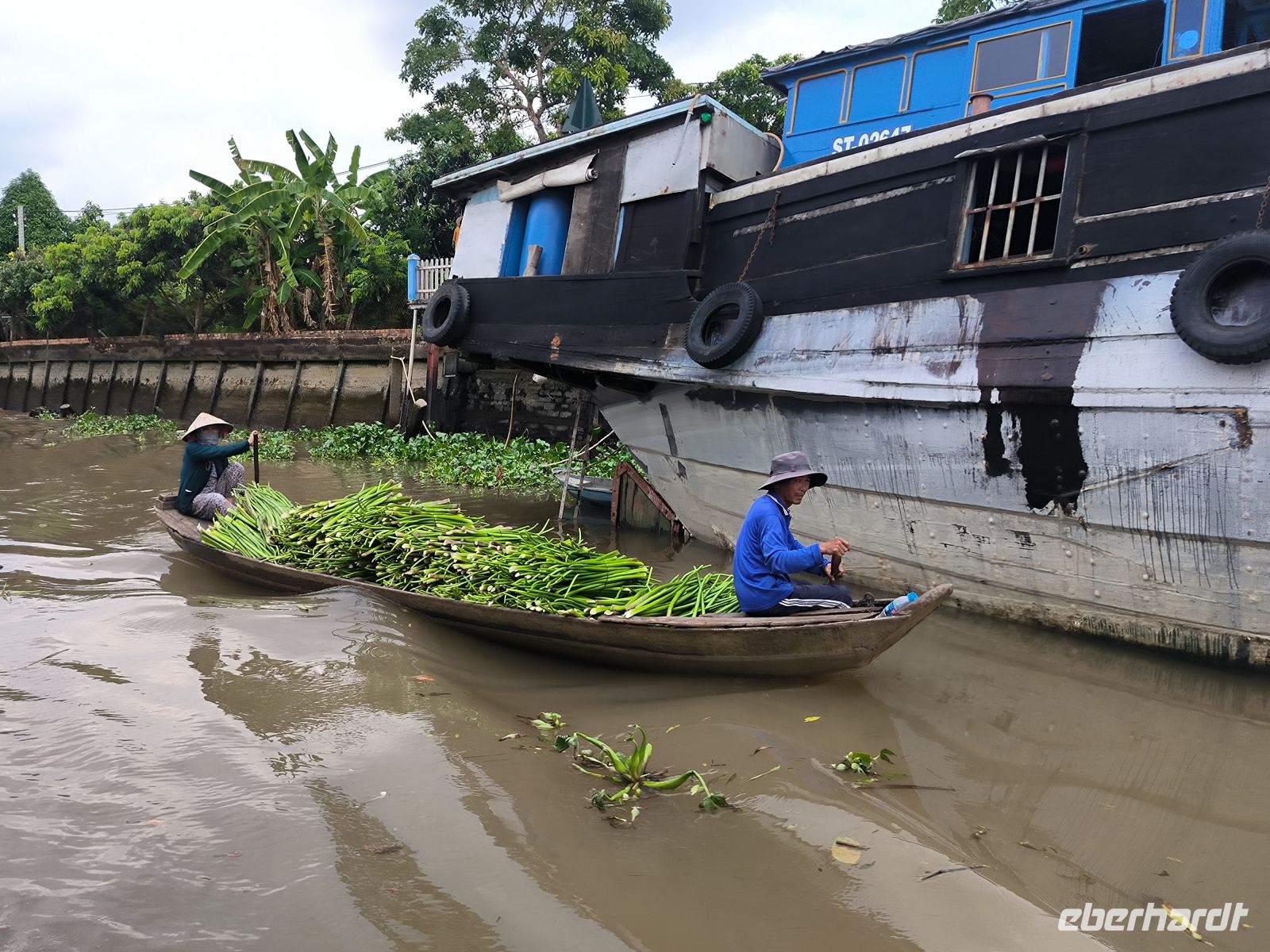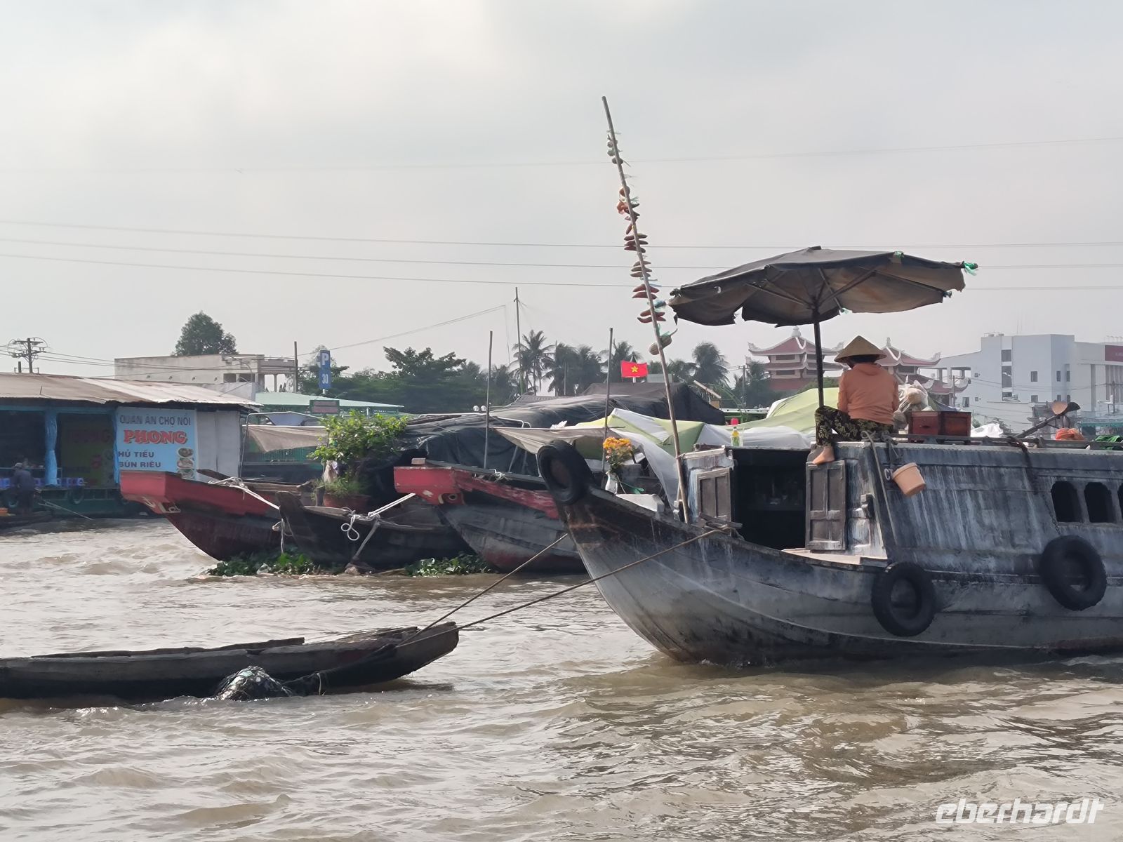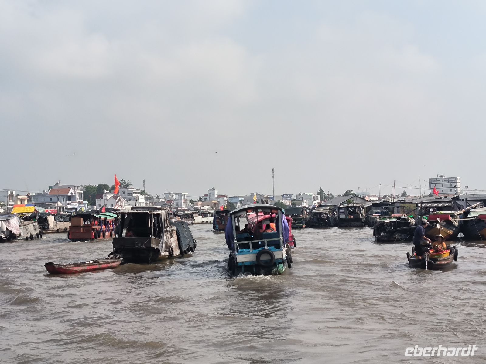 Früh am Morgen steigen wir erneut ins Boot und erleben die faszinierenden schwimmenden Märkte des Mekong-Deltas. Der Markt von Cai Rang ist der größte seiner Art: Ein lebendiges Gewusel aus kleinen Booten und großen Schiffen, beladen mit Bergen von Obst, Gemüse und anderen Waren. Schwimmende Garküchen versorgen Händler und Besucher – eine Szenerie voller Leben und Farben, aber auch sehr armen Lebensbedingungen.