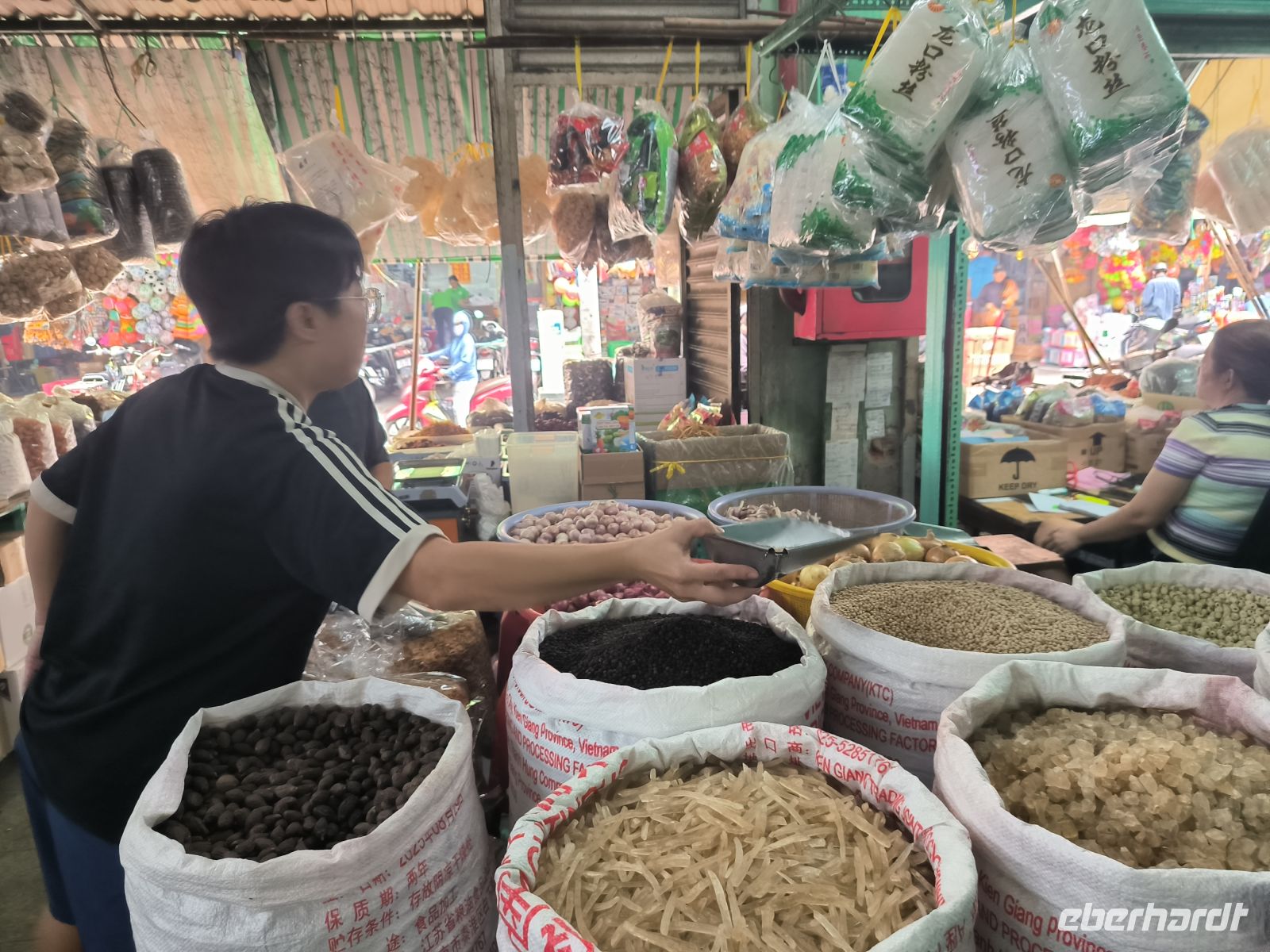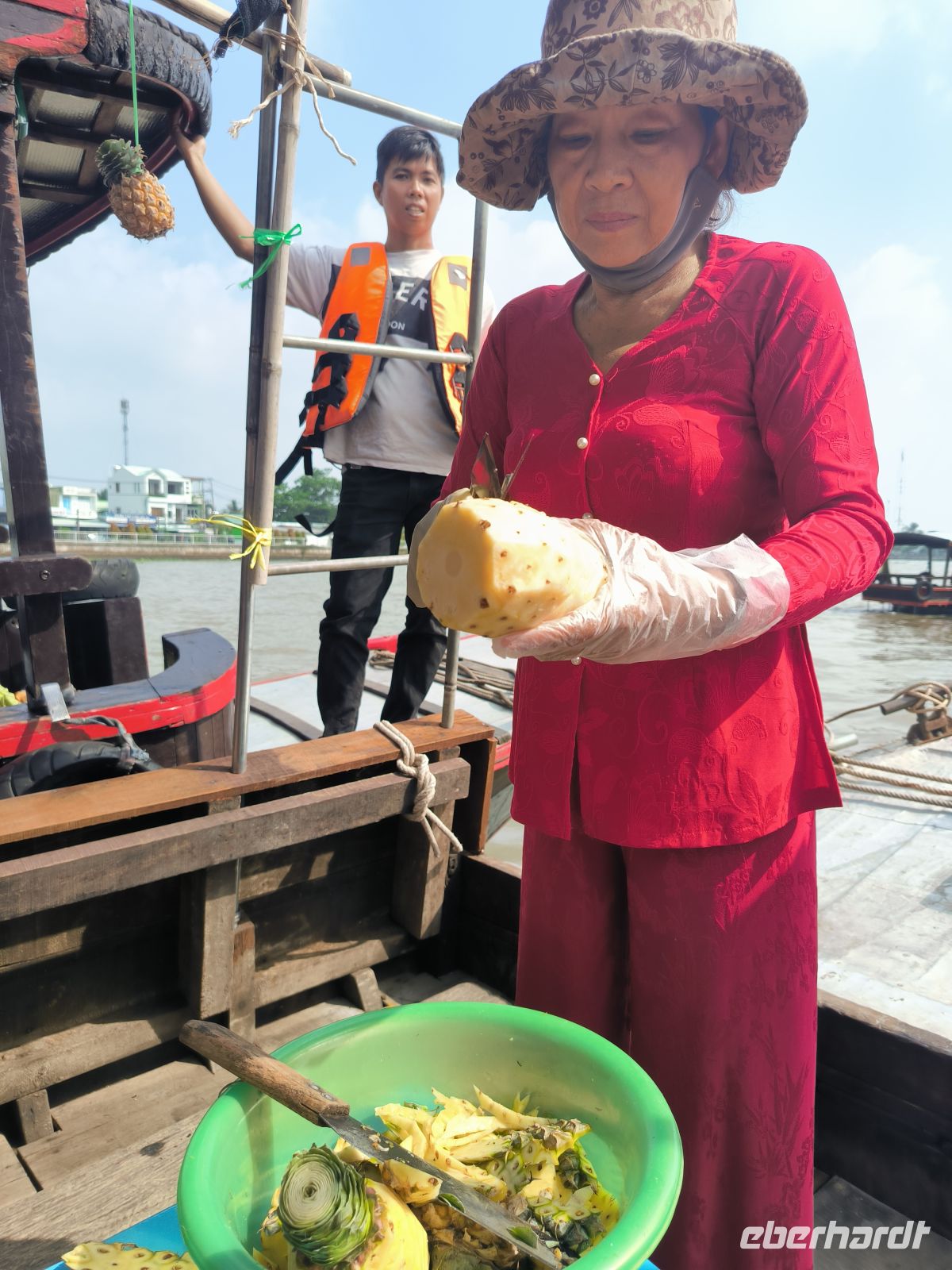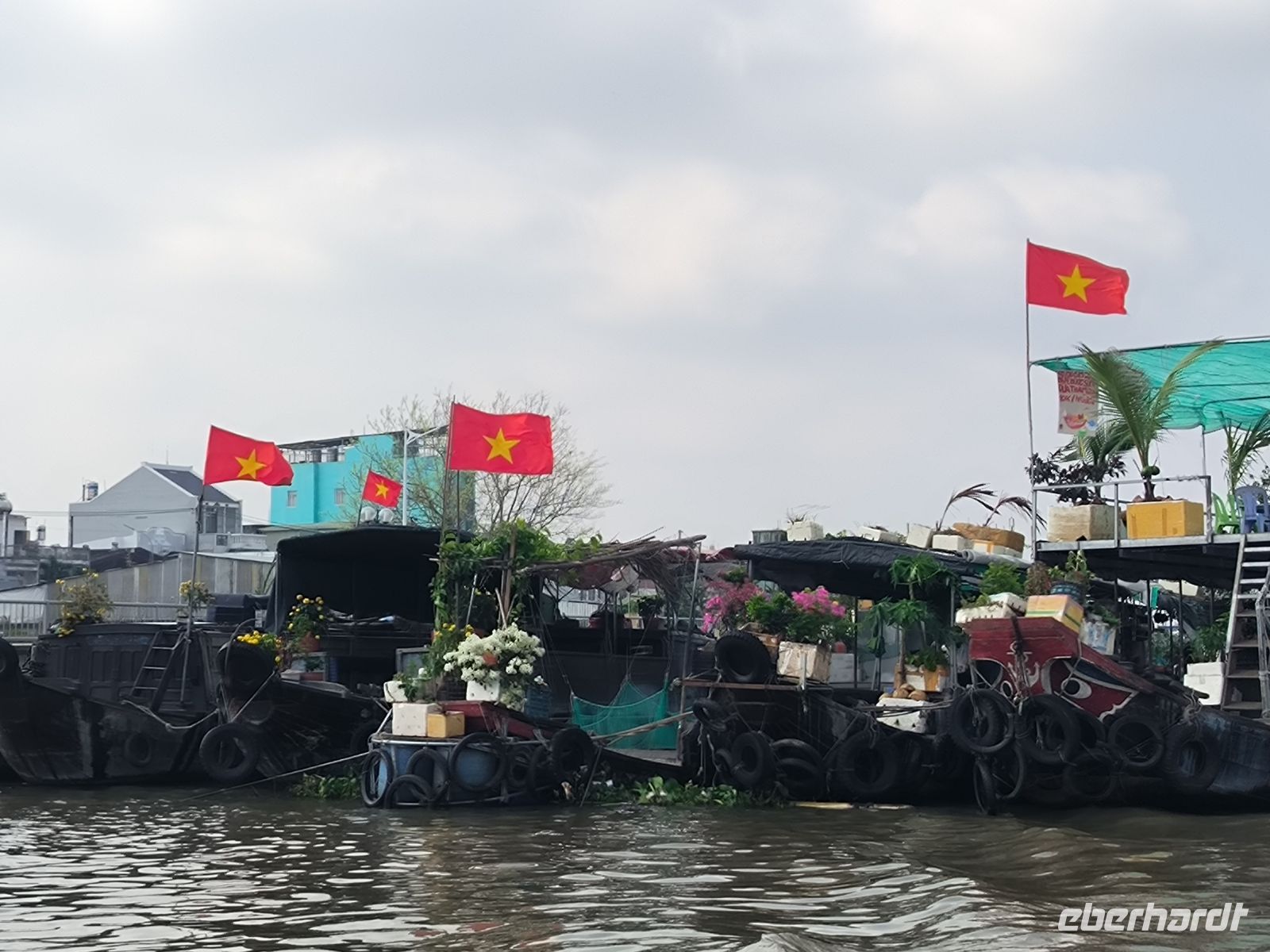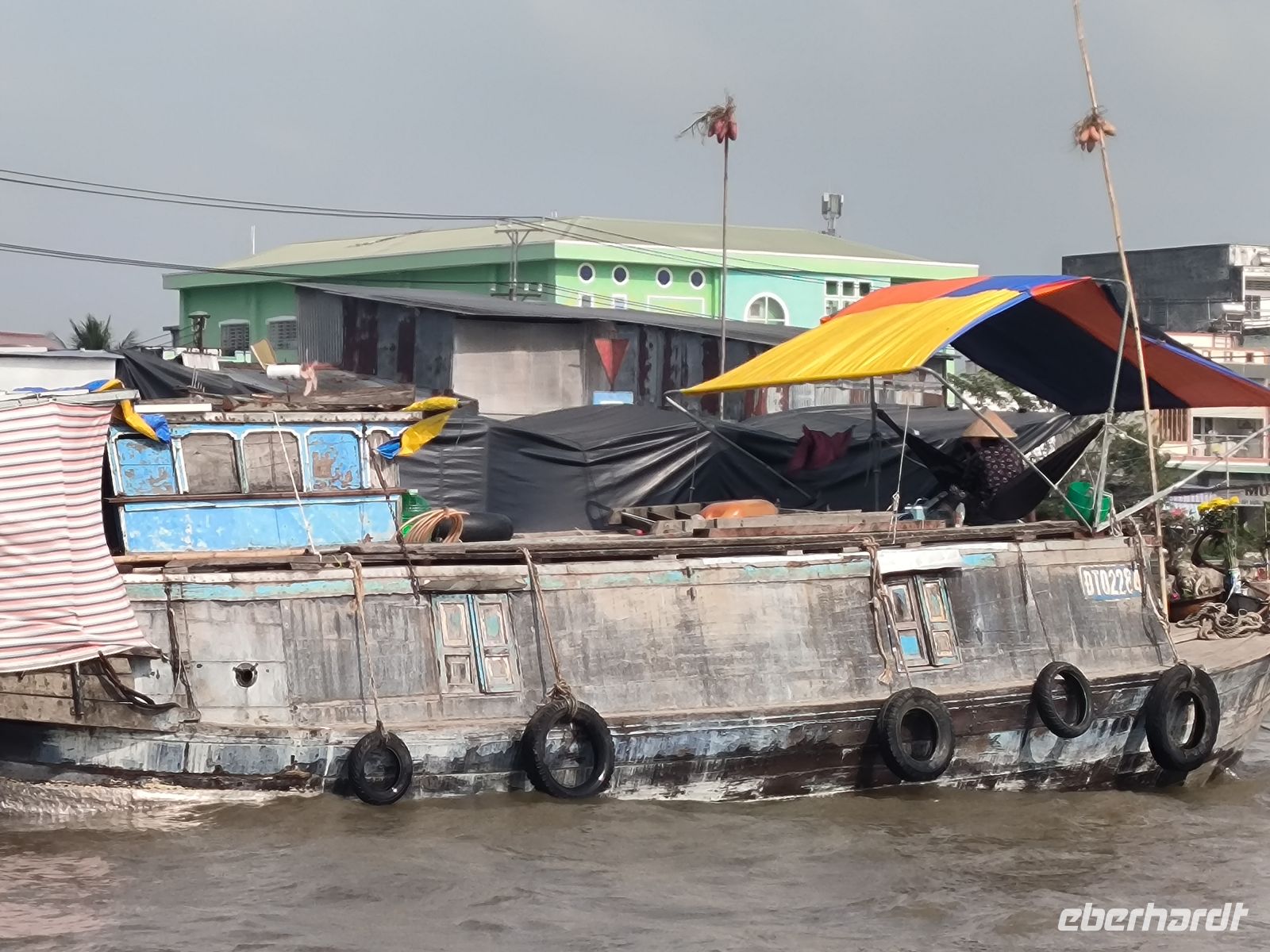 Früh am Morgen steigen wir erneut ins Boot und erleben die faszinierenden schwimmenden Märkte des Mekong-Deltas. Der Markt von Cai Rang ist der größte seiner Art: Ein lebendiges Gewusel aus kleinen Booten und großen Schiffen, beladen mit Bergen von Obst, Gemüse und anderen Waren. Schwimmende Garküchen versorgen Händler und Besucher – eine Szenerie voller Leben und Farben, aber auch sehr armen Lebensbedingungen.