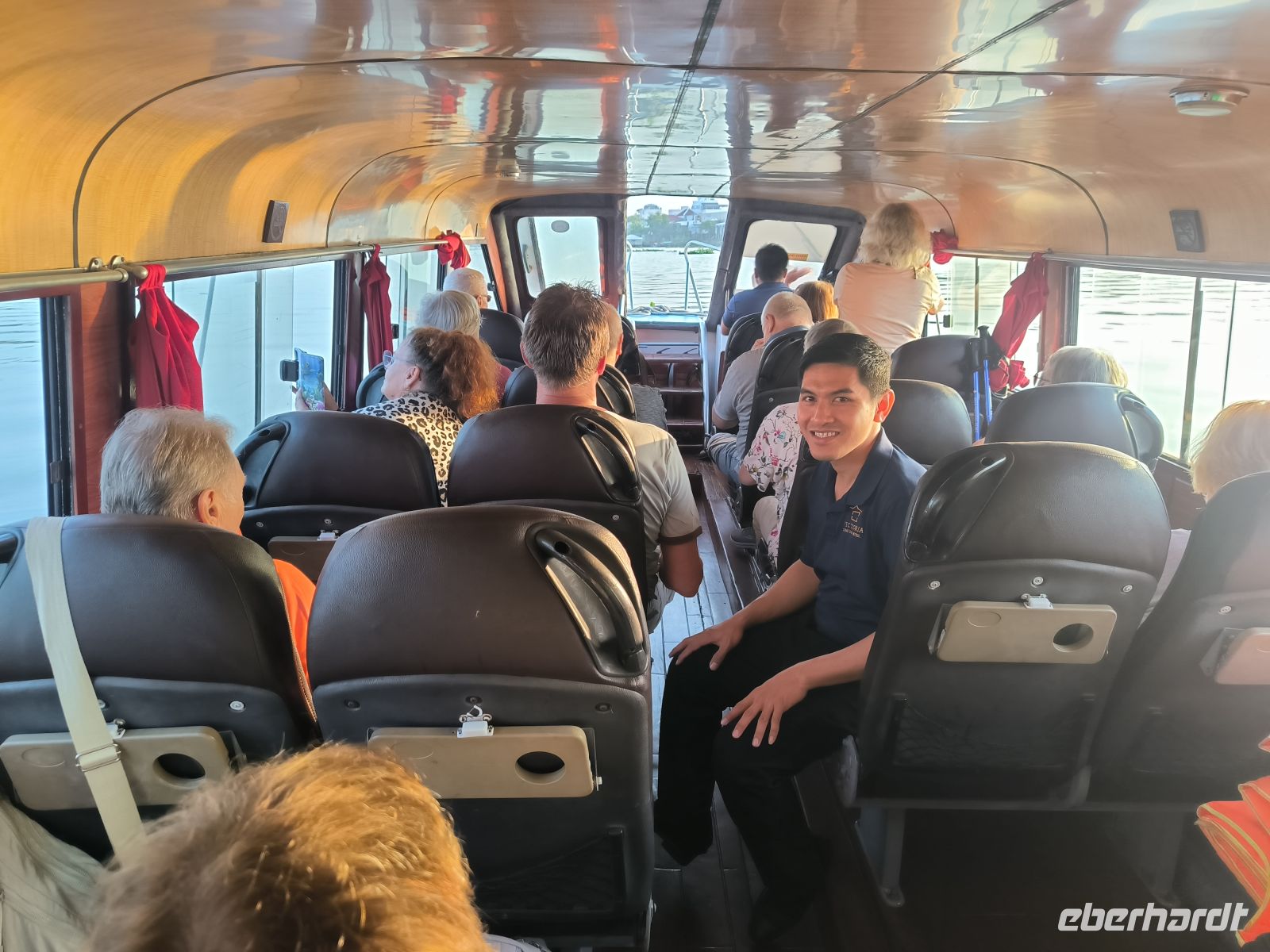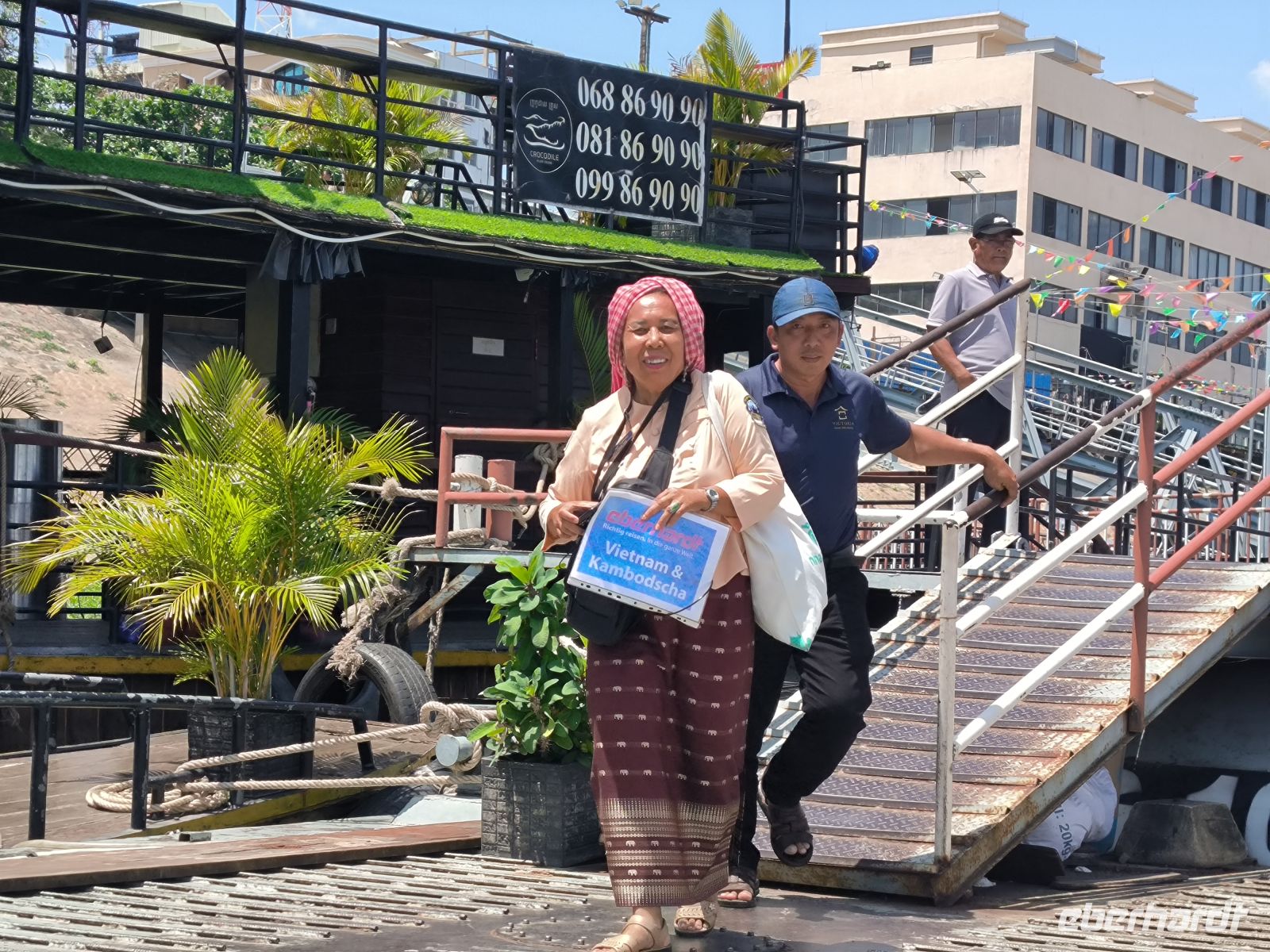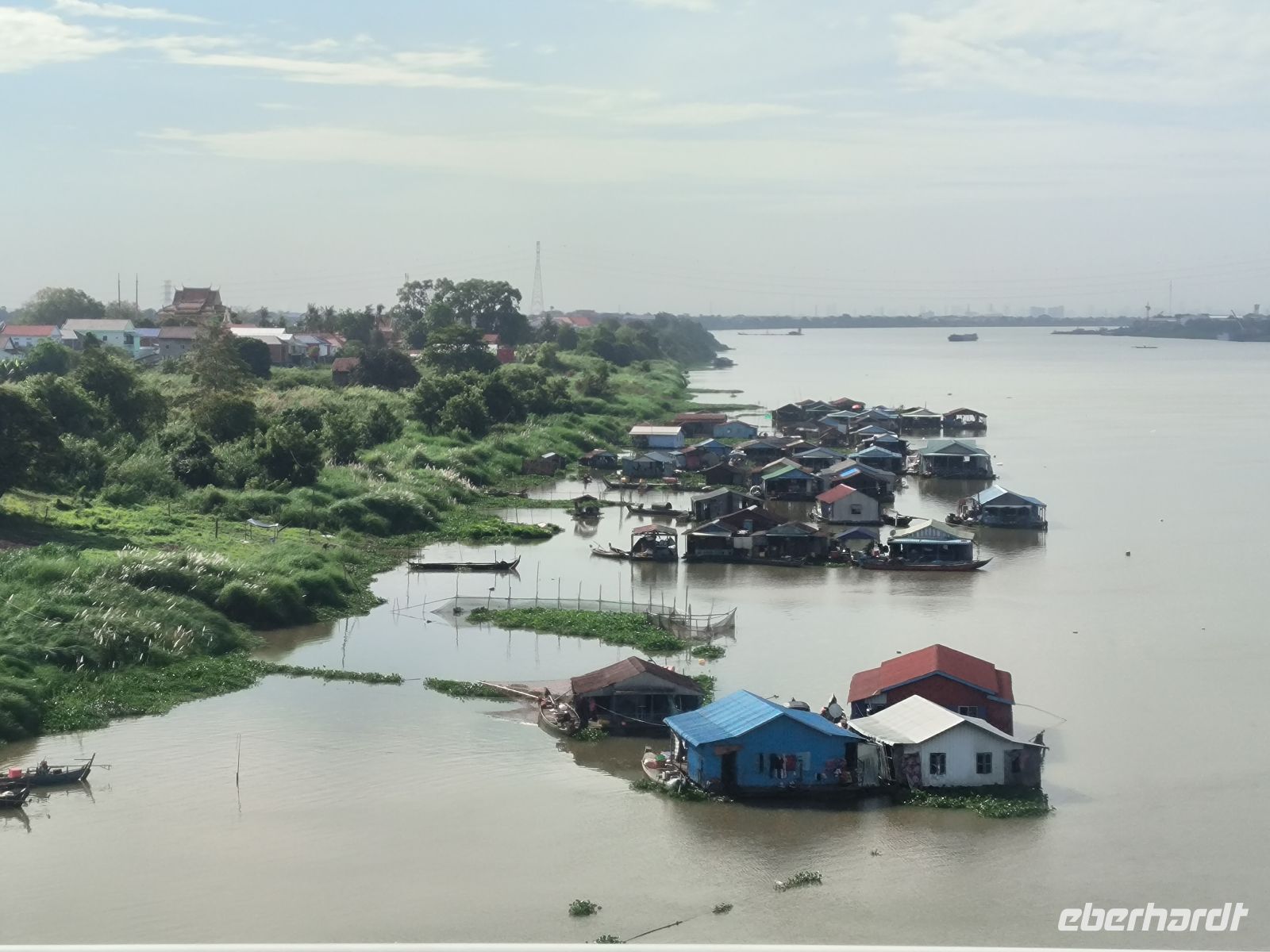 Entlang des mächtigen Flusses beobachten wir das Leben auf und am Wasser – schwimmende Häuser, Fischerboote, Lastkähne und grüne Ufer ziehen an uns vorbei. Je näher wir Kambodscha kommen, desto spürbarer verändert sich die Landschaft.