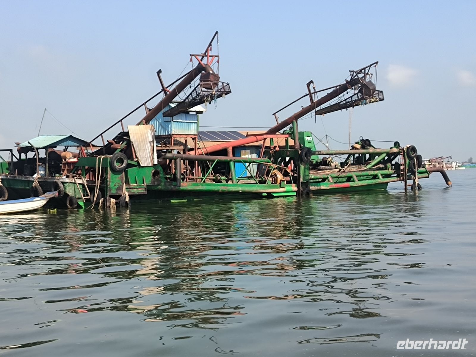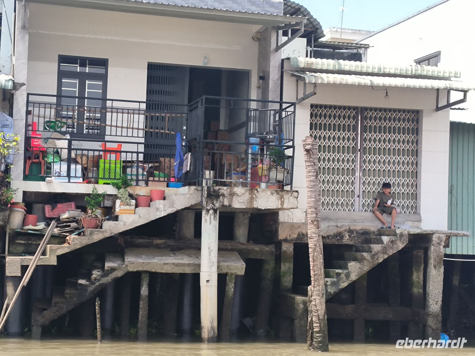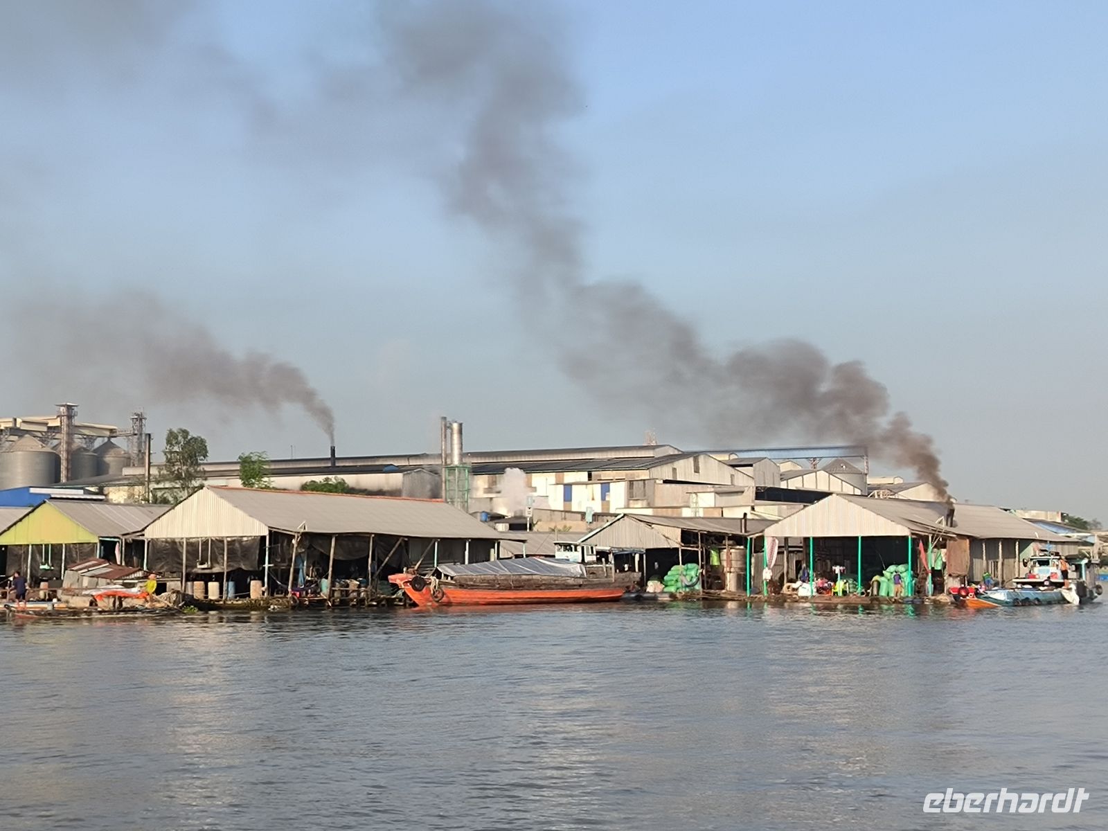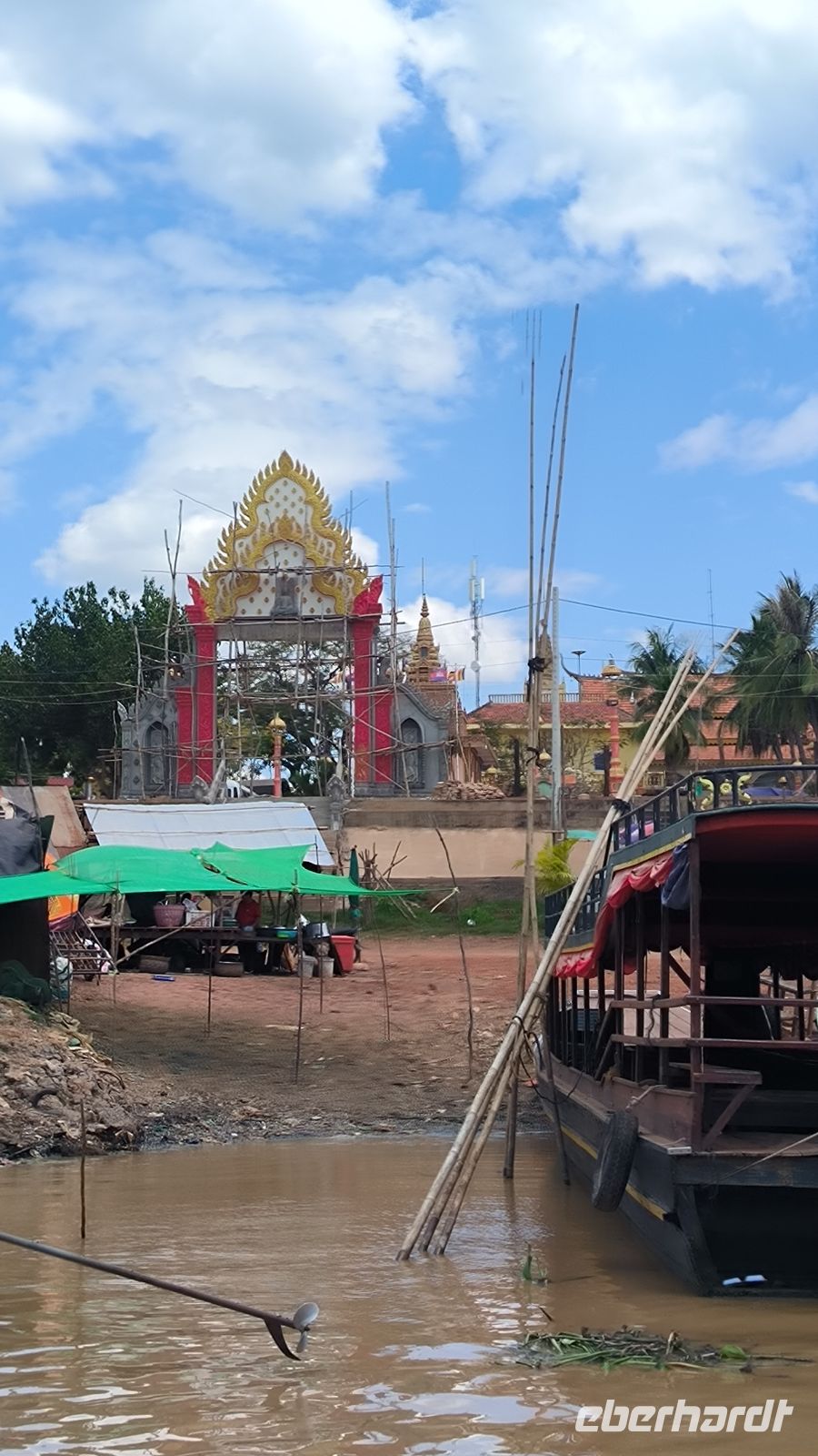 Entlang des mächtigen Flusses beobachten wir das Leben auf und am Wasser – schwimmende Häuser, Fischerboote, Lastkähne und grüne Ufer ziehen an uns vorbei. Je näher wir Kambodscha kommen, desto spürbarer verändert sich die Landschaft.