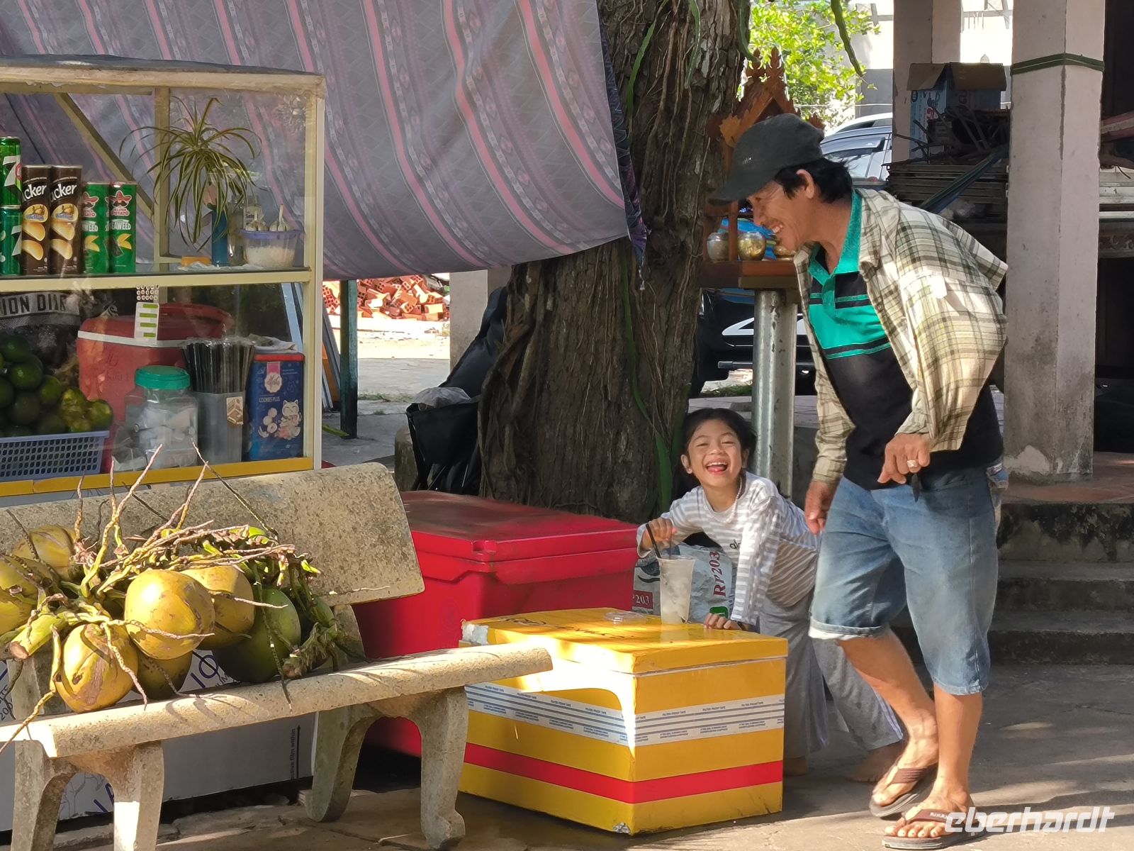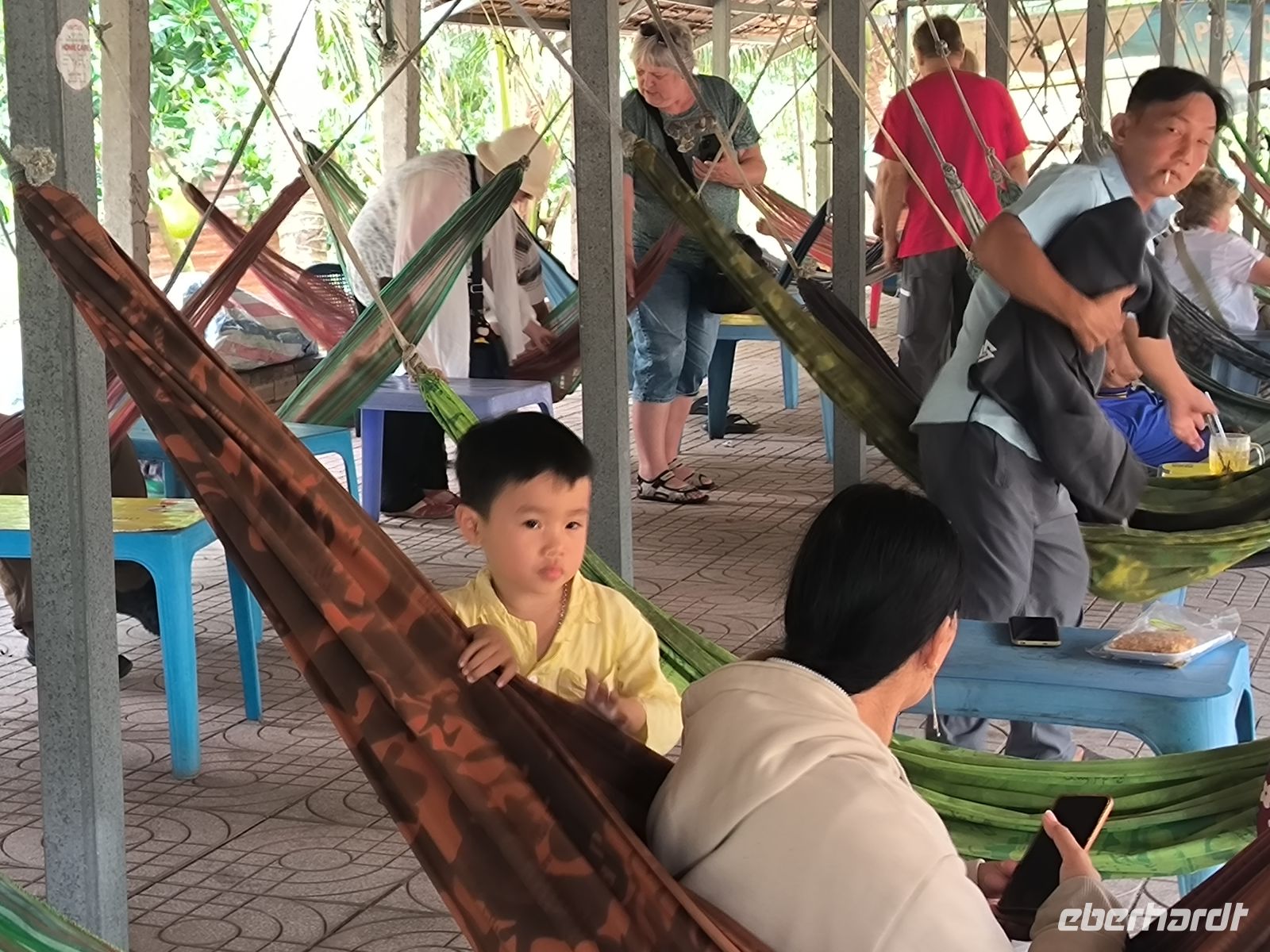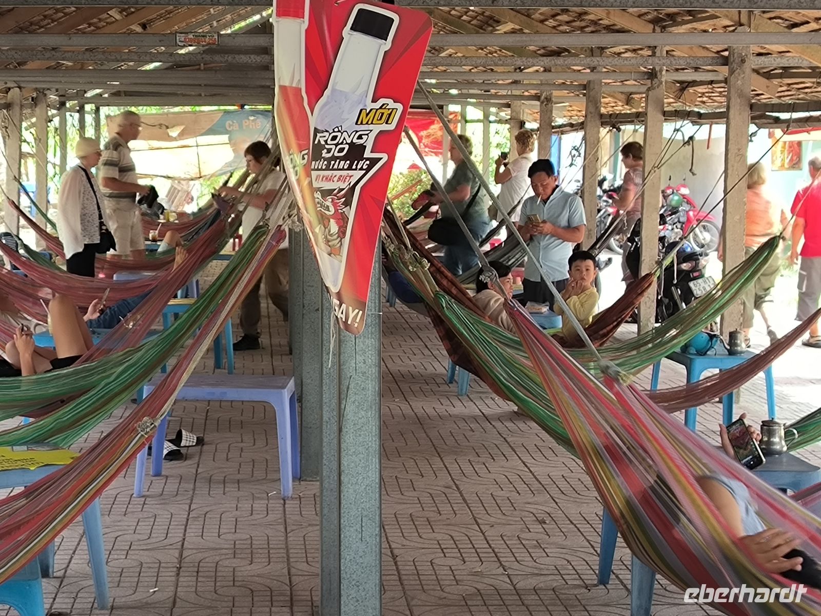 Weil heute der Internationale Frauentag ist, lädt unser Guide Binh zur Kaffeepause ins Hängematten-Café ein. Dort erzählt er uns auch sehr anschaulich und theatralisch vom Leben der gläubigen Vietnamesen.