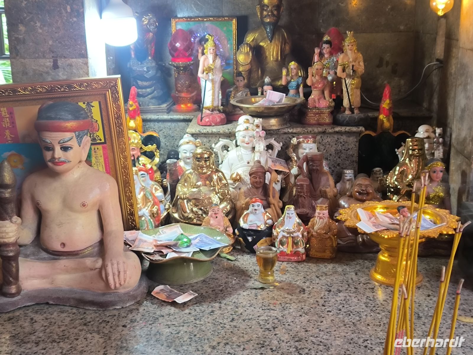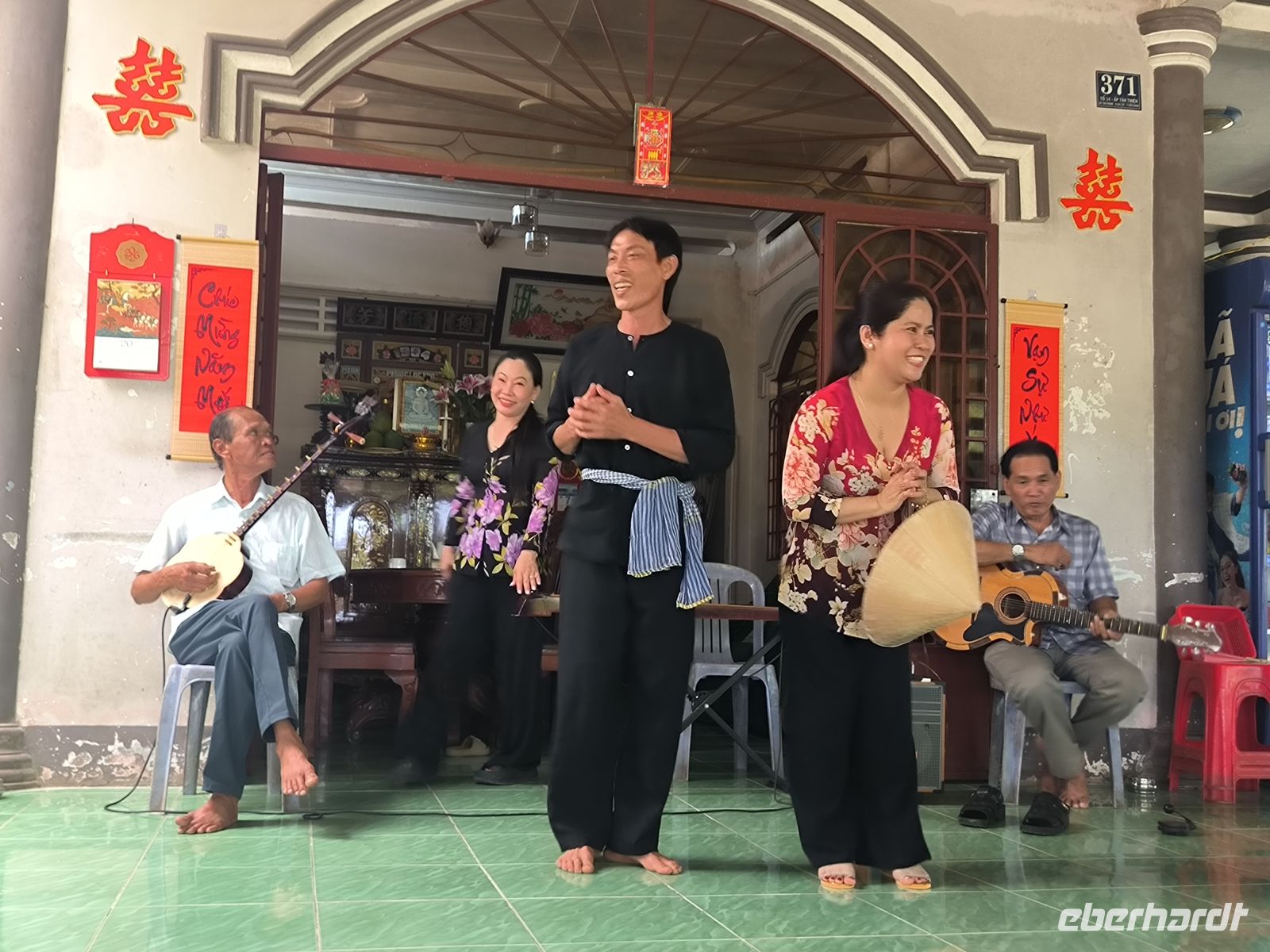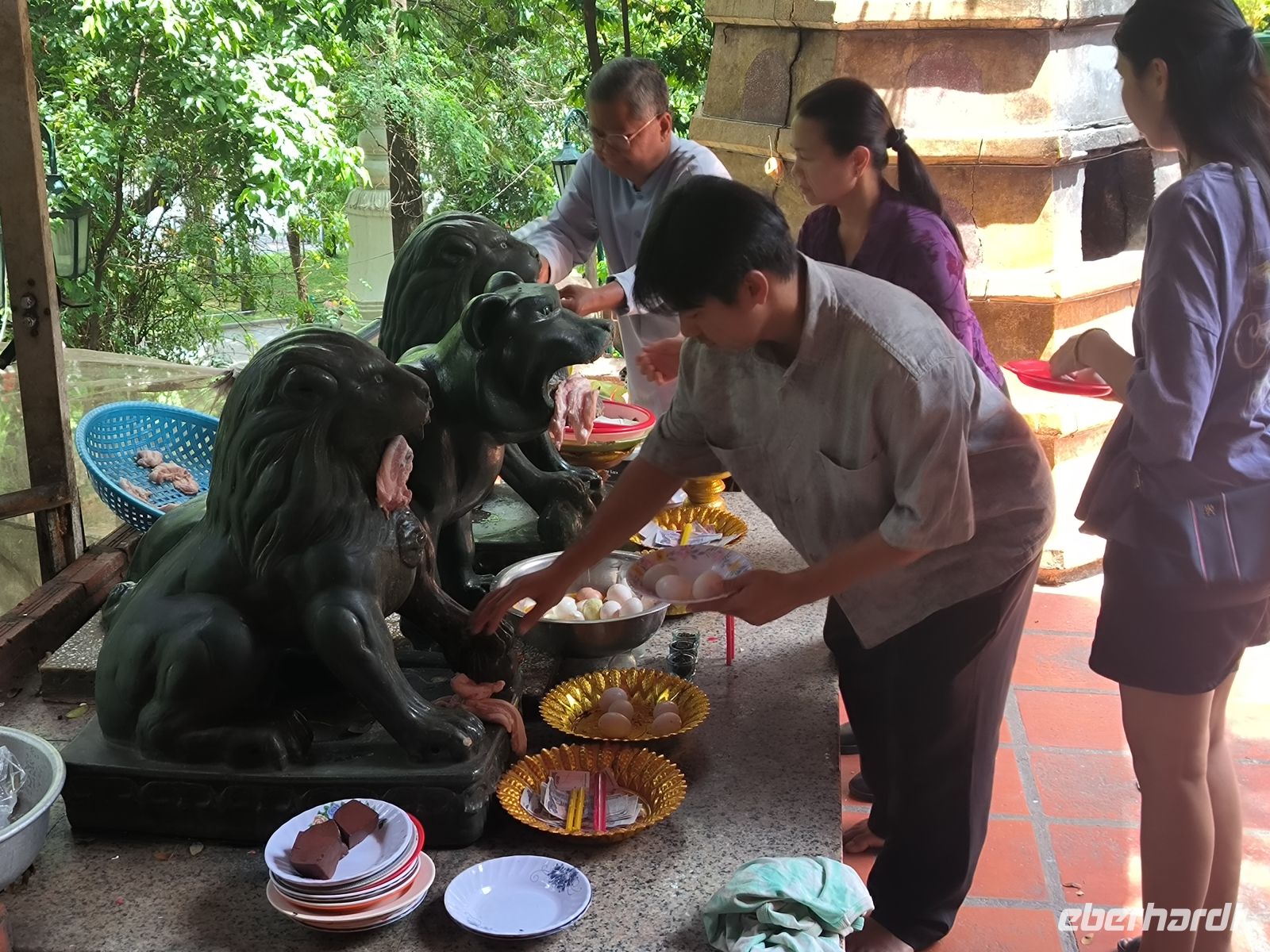 Weil heute der Internationale Frauentag ist, lädt unser Guide Binh zur Kaffeepause ins Hängematten-Café ein. Dort erzählt er uns auch sehr anschaulich und theatralisch vom Leben der gläubigen Vietnamesen.